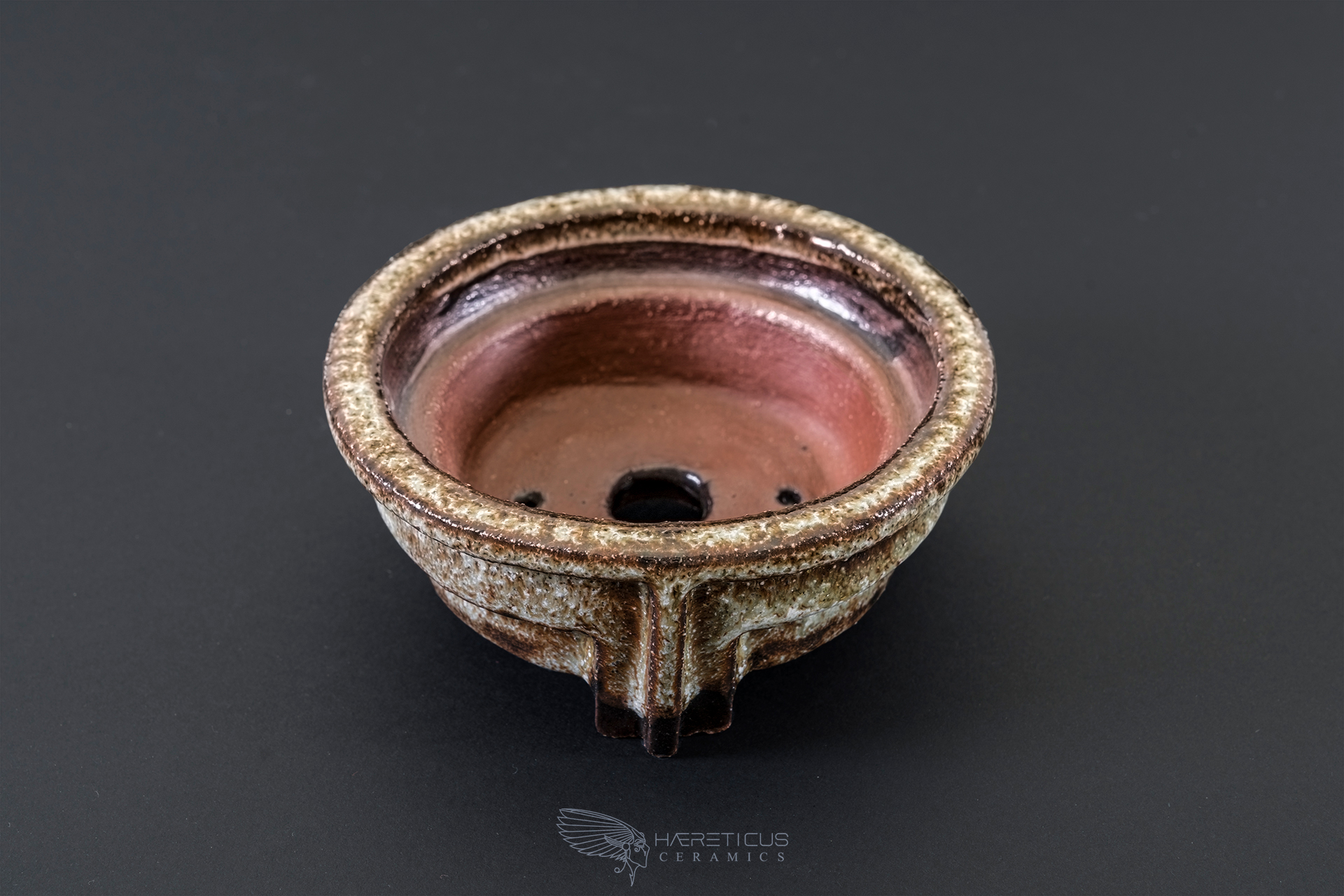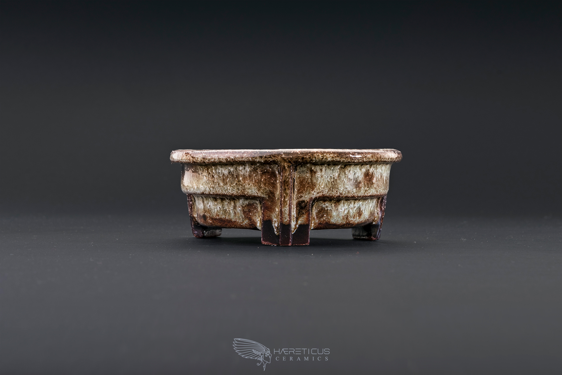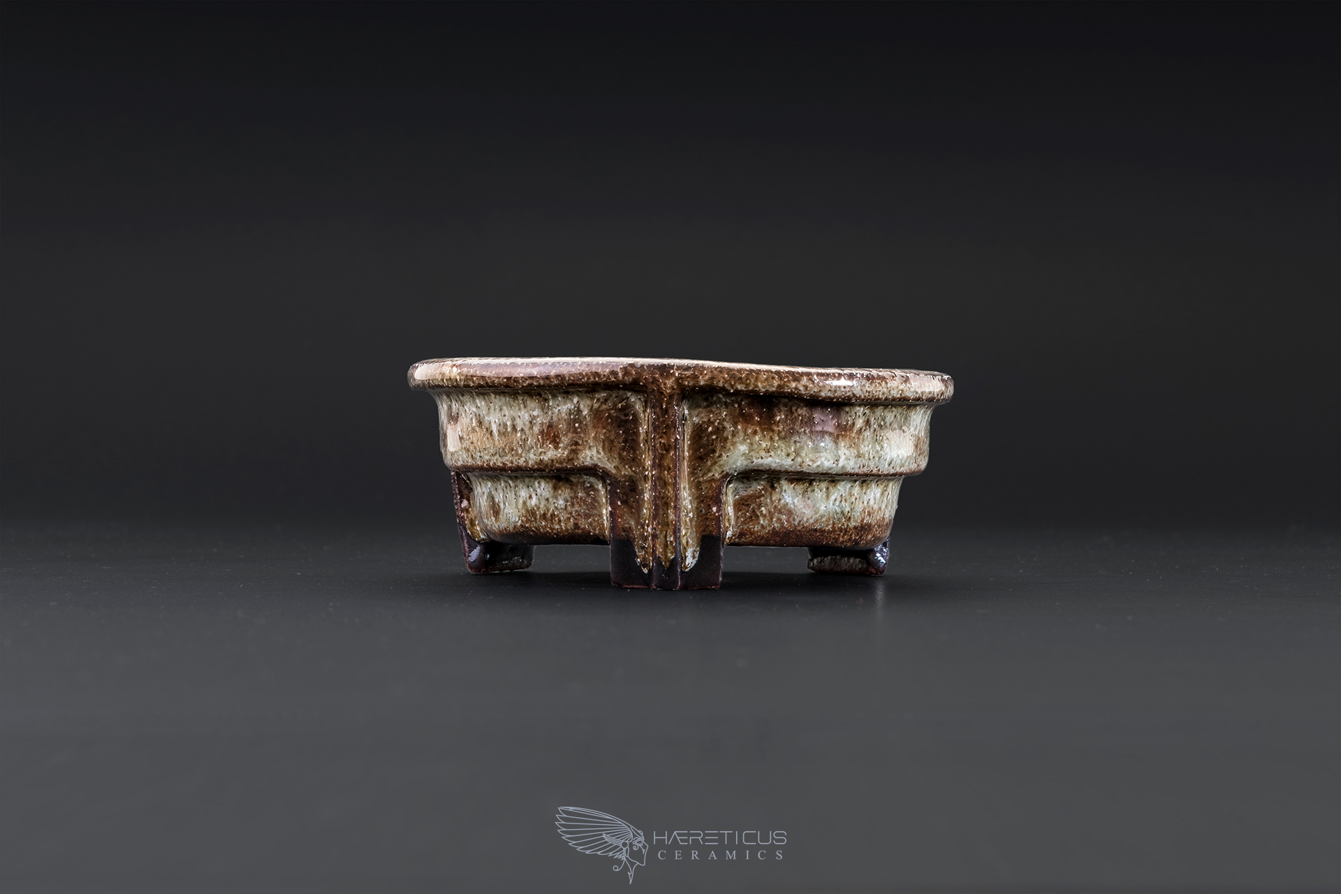 The pot is made of brown stoneware and fired at 1230C. It is coated with a variegated glaze in earthy tones. Ideal for mame bonsai or shitakusa (companion plants). EG - 2017