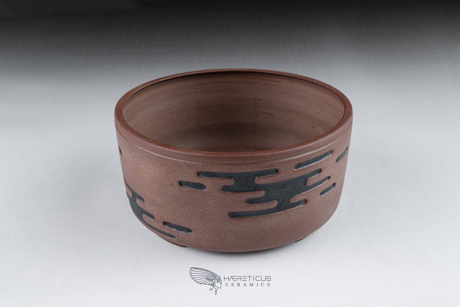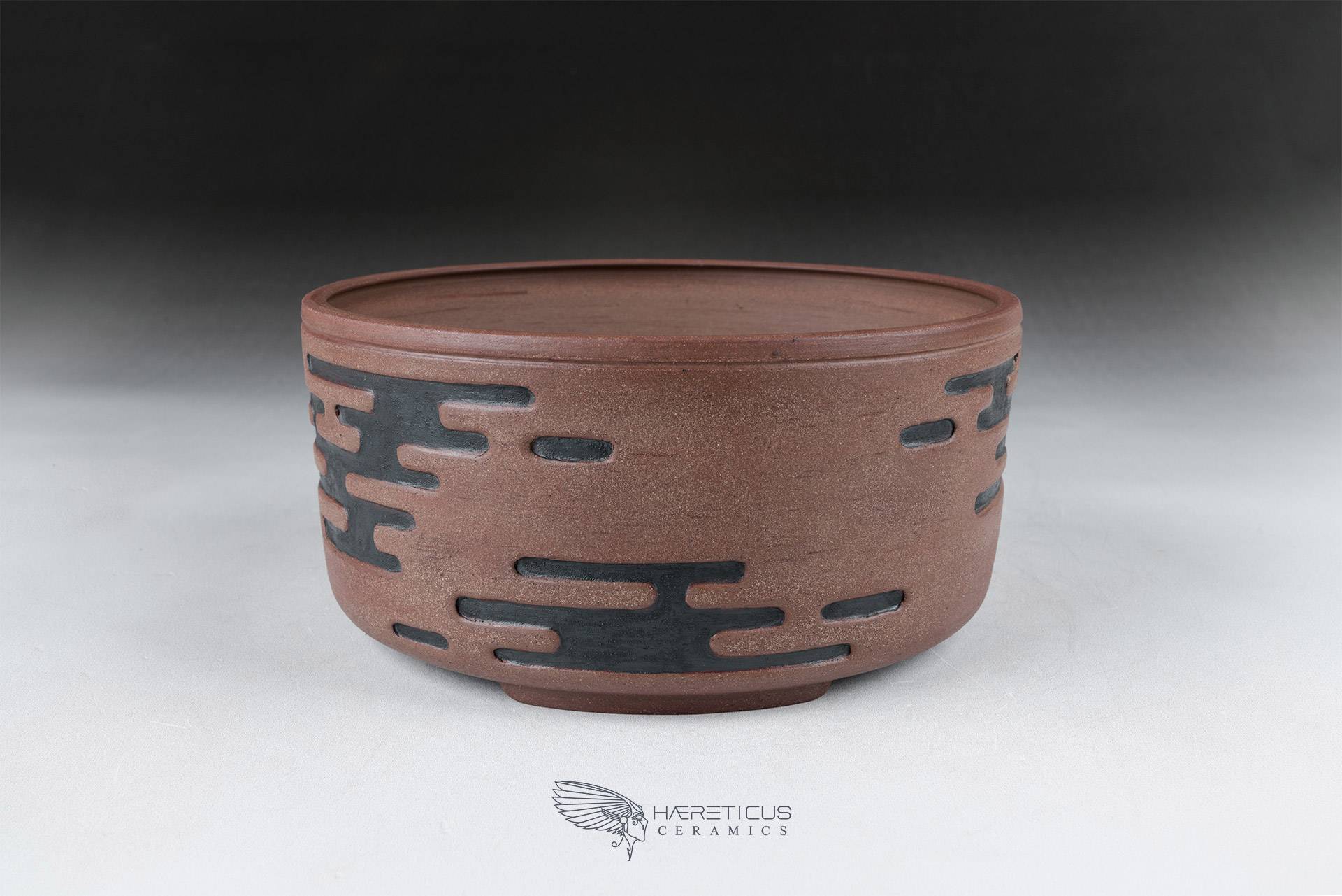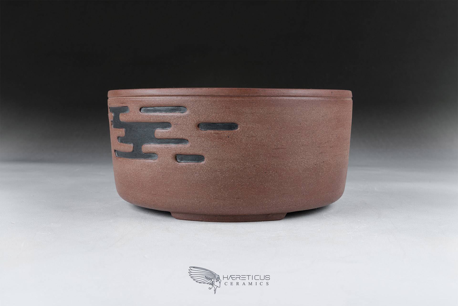 This pot, crafted on a potter's wheel, was then entirely hand-carved and oxidized in the hollows to give greater depth to the night sky and volume to the clouds. Having been fired at a higher-than-average temperature (1270°C - 2318°F), when viewed directly from above, it is not perfectly circular.