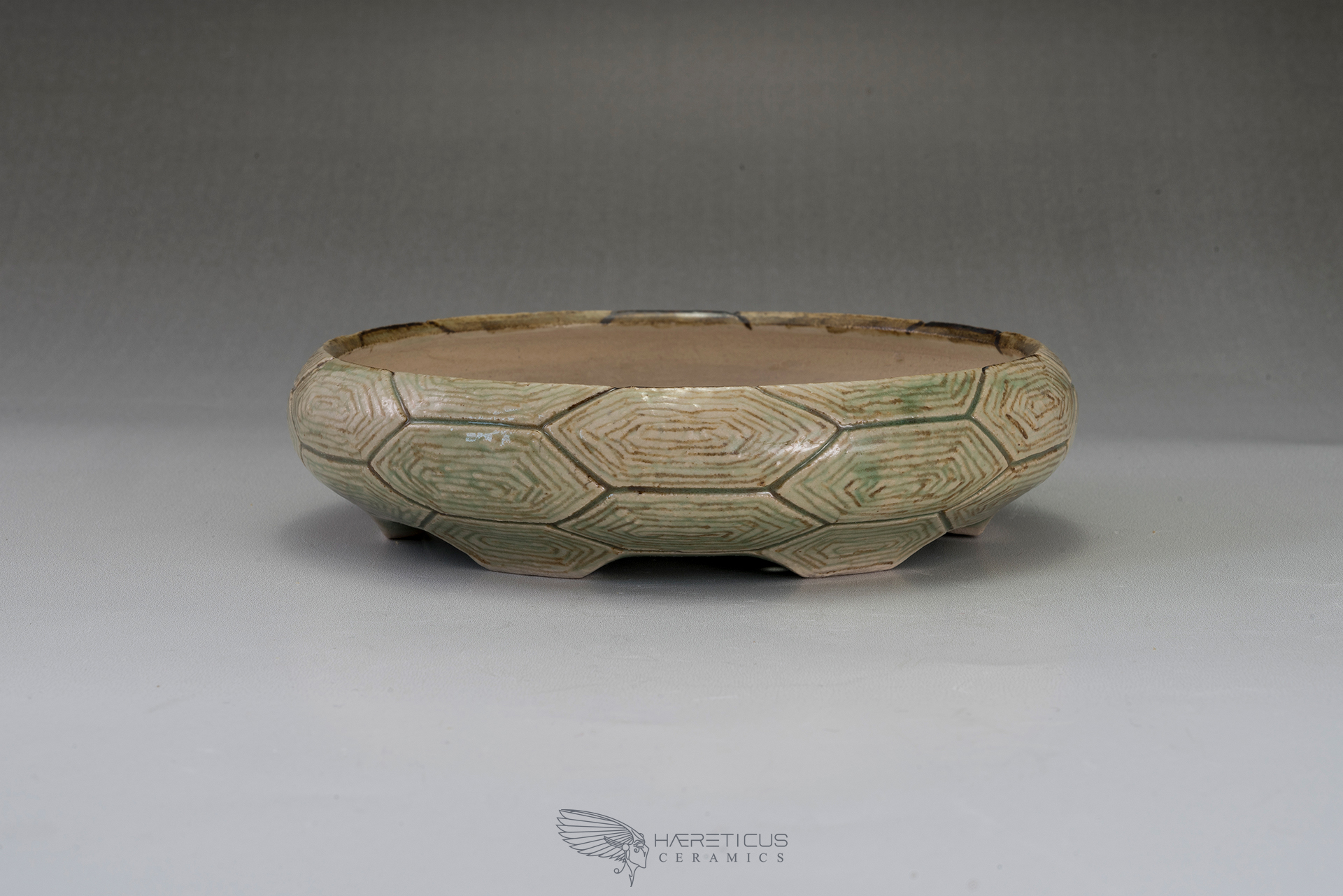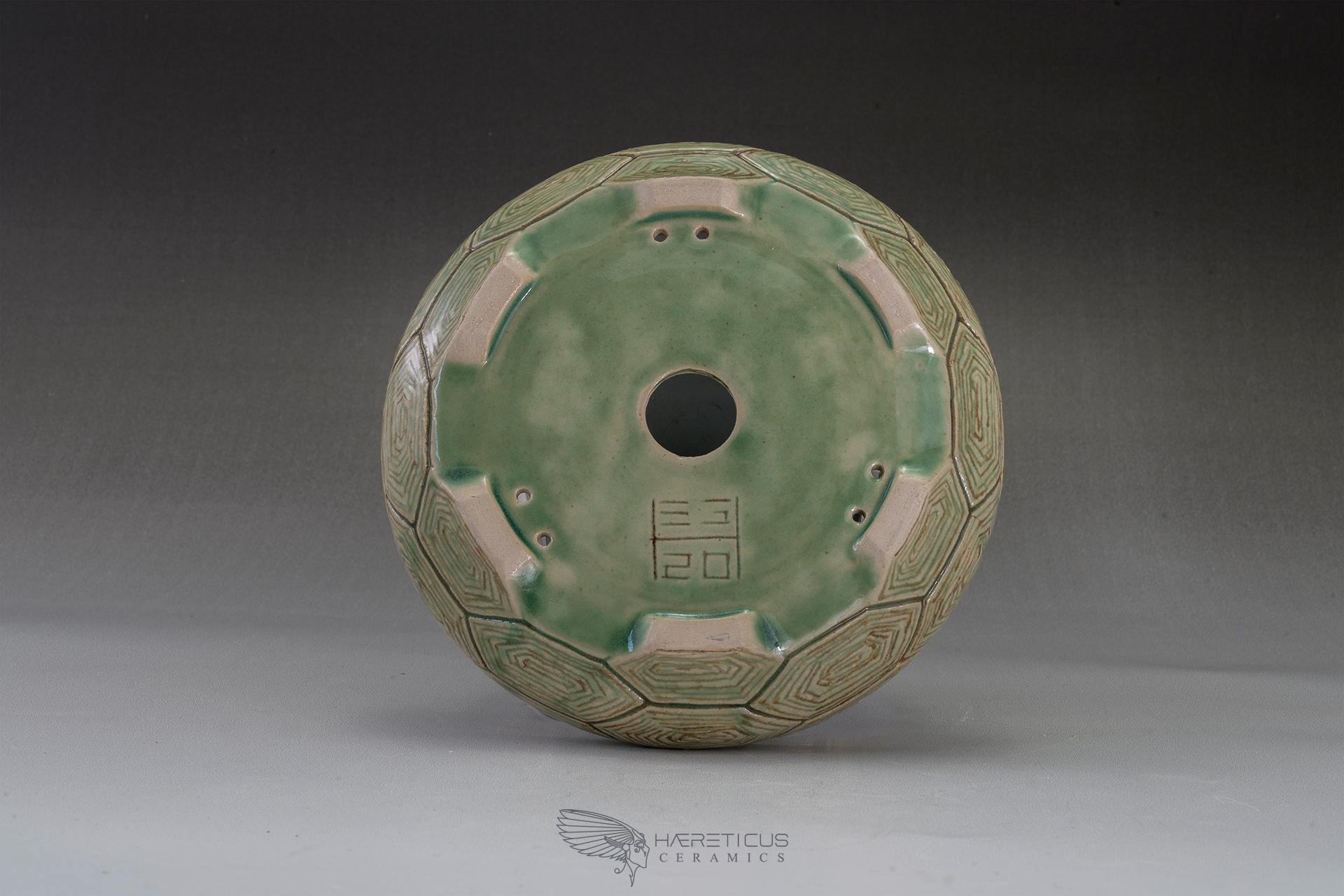 Round pot with a hand-engraved texture reminiscent of a turtle's shell. The wheel-turned pot is then engraved with precise measurements and proportions, drawing lines that form the hexagons. These are then hollowed out to reveal the plates that form the shell. The pot is then painted with ferrous oxides and coated with a celadon glaze that highlights the texture.