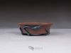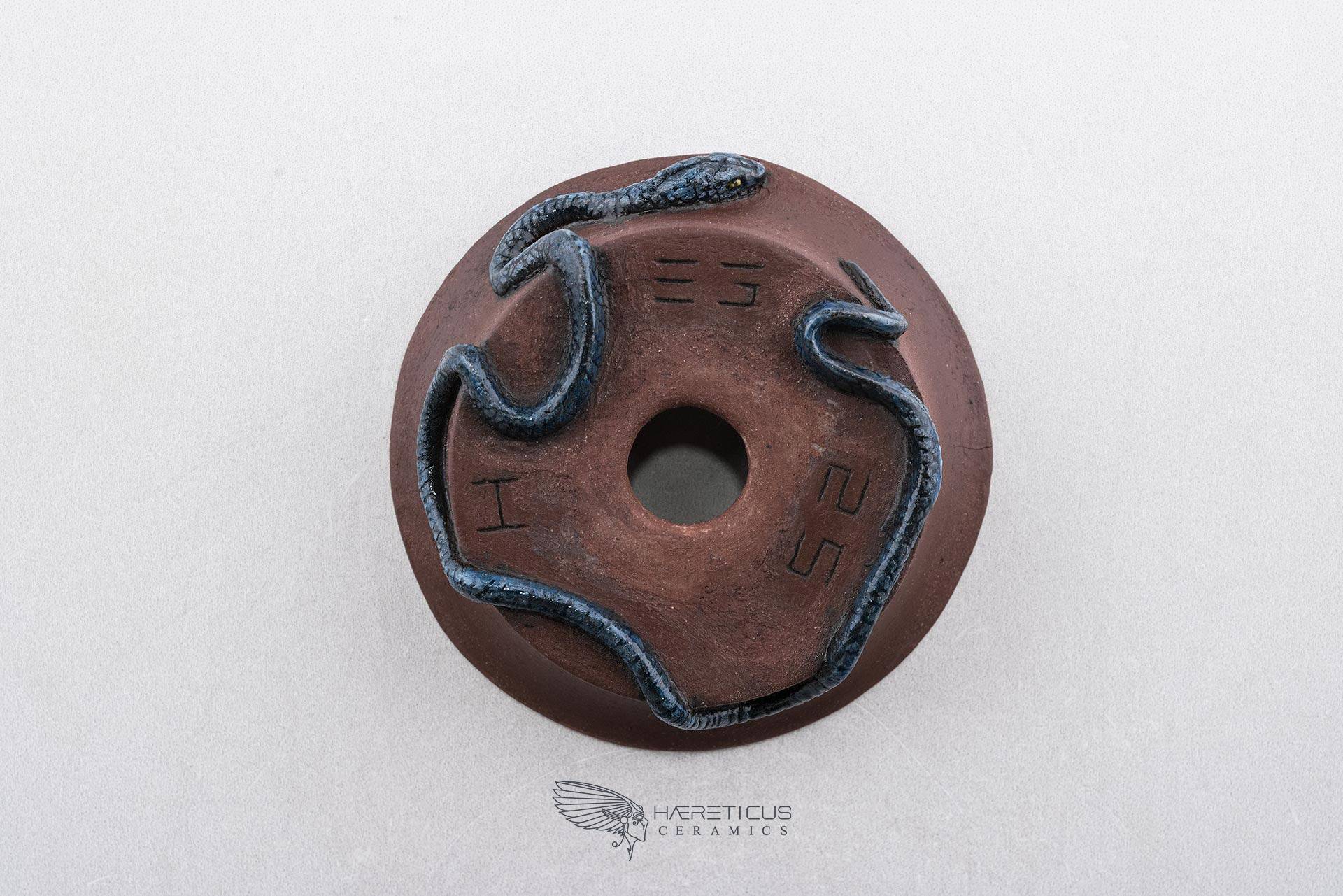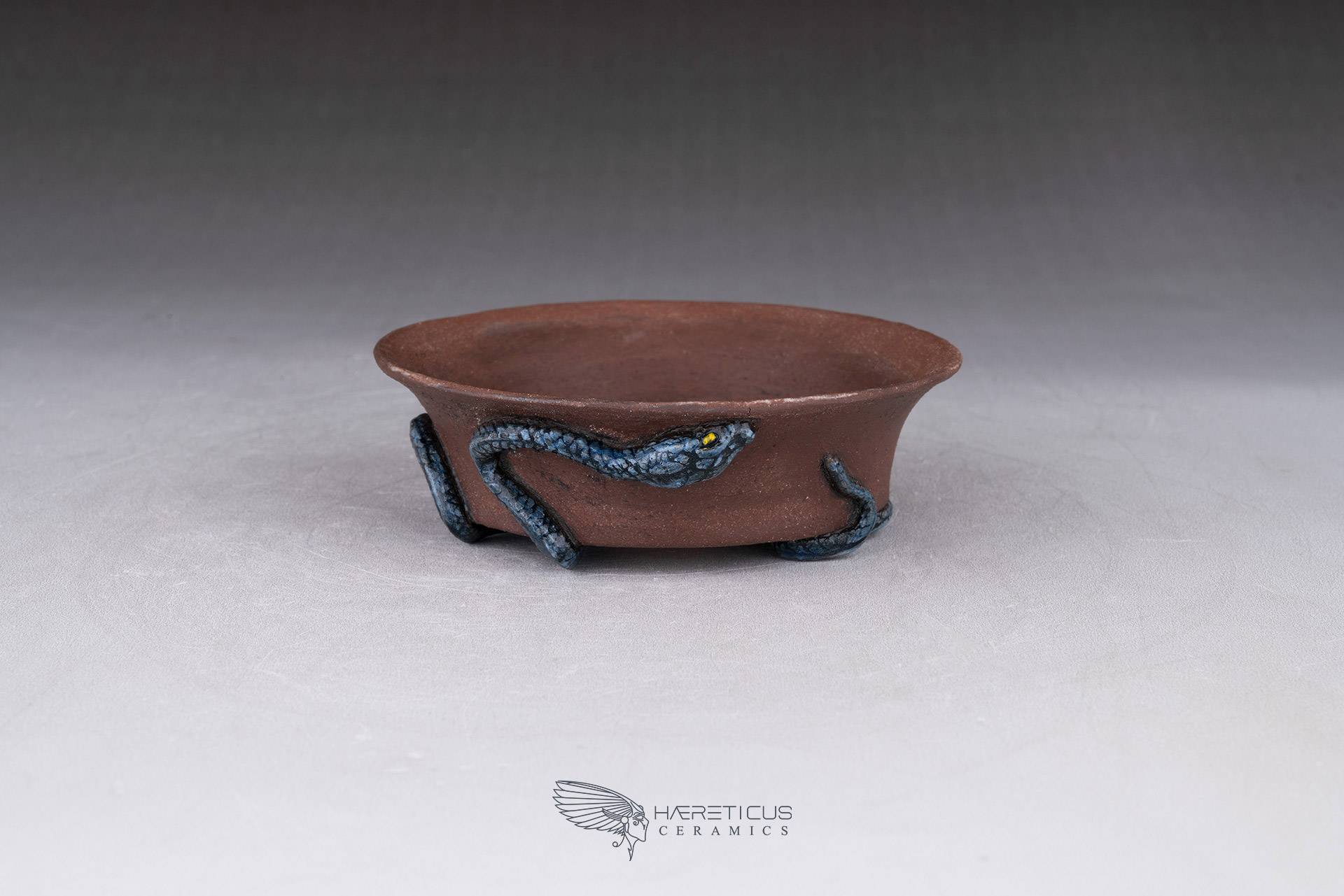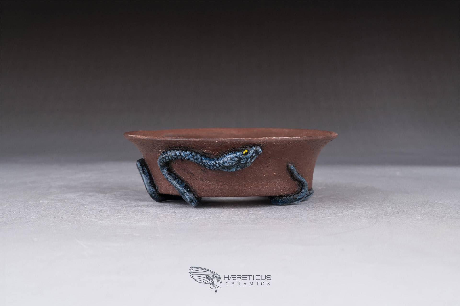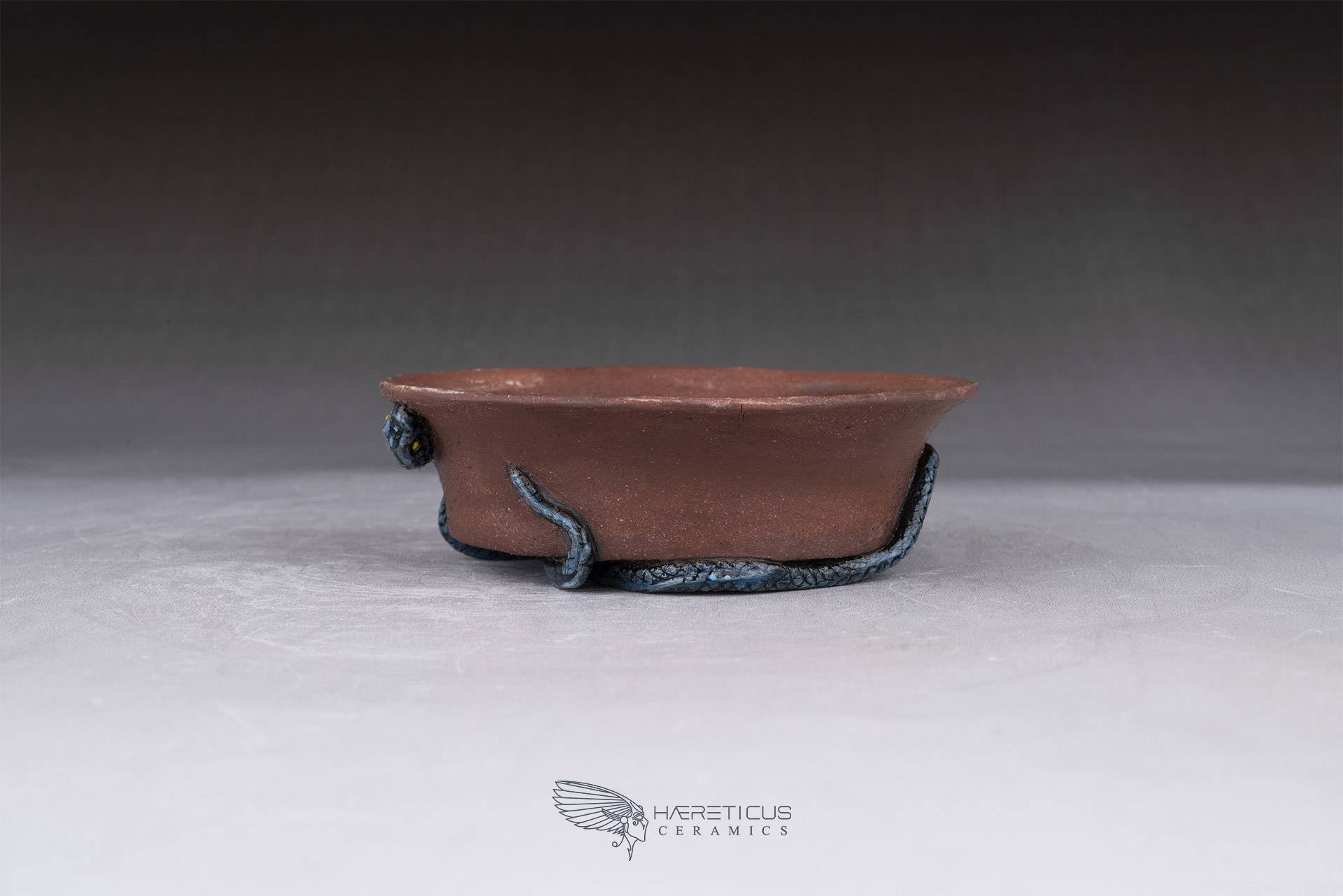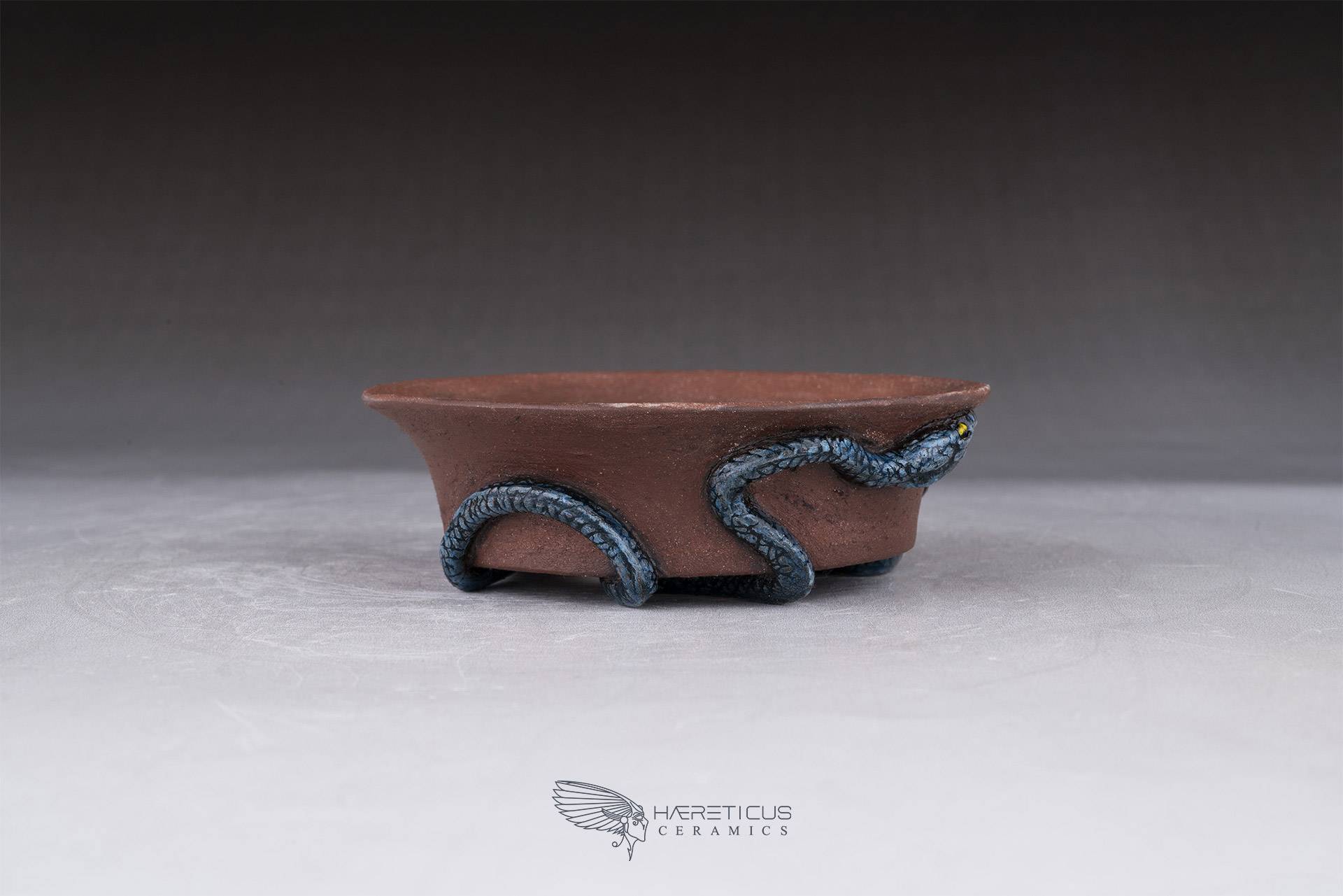 This round unglazed mame pot has been decorated with a hand-carved and glazed snake that encircles the bottom and sides, also serving as the pot's feet. EG - 2025