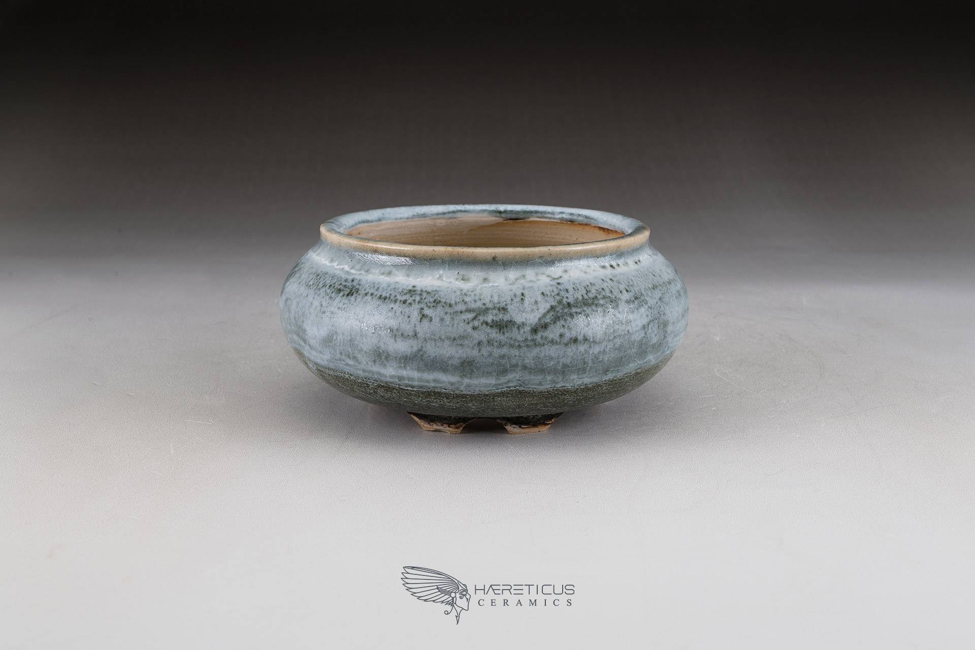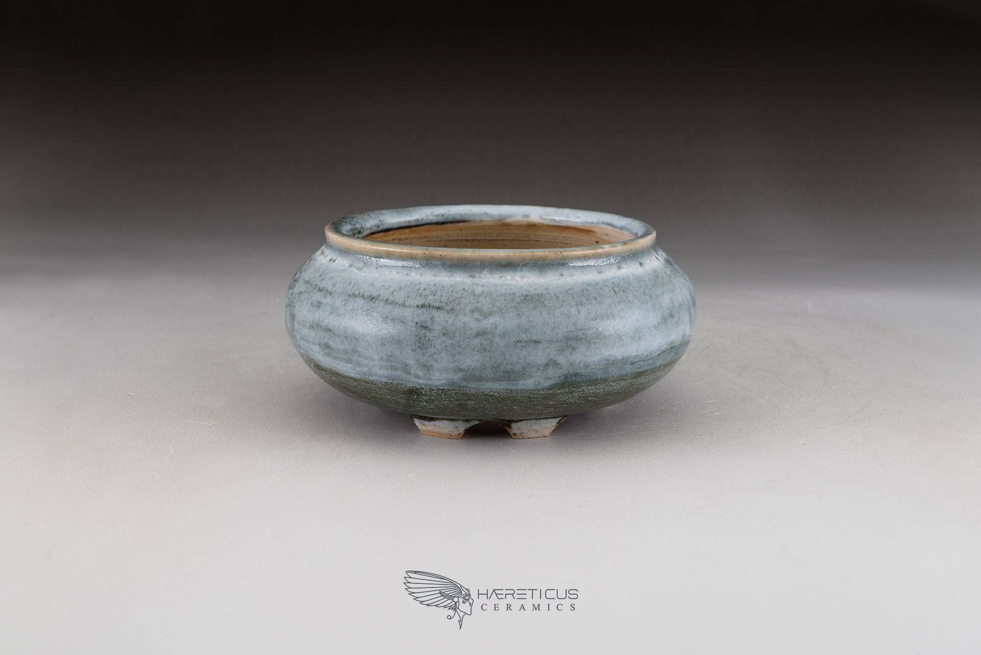 Small shitakusa pot, coated with two different glazes: a forest green oribe base overlaid with a semi-gloss white with light blue highlights. EG - 2018