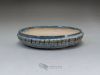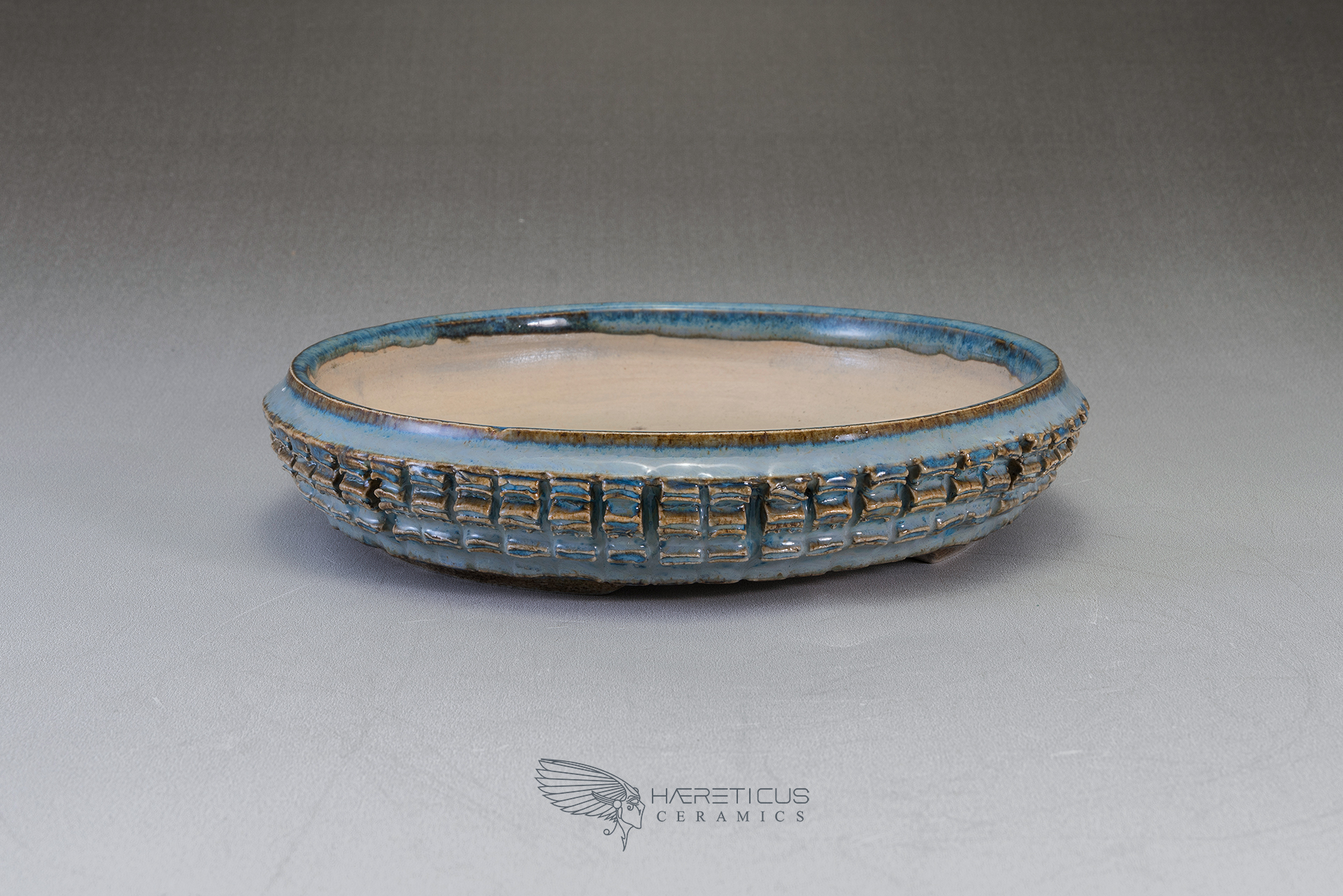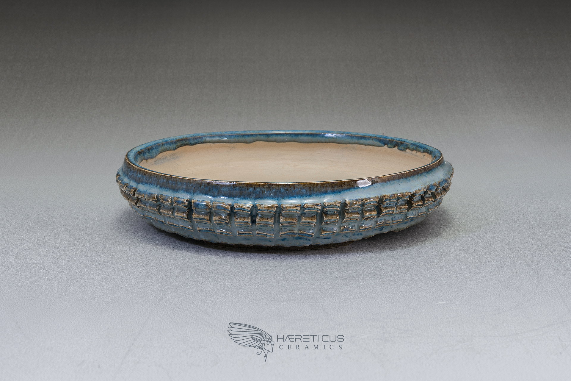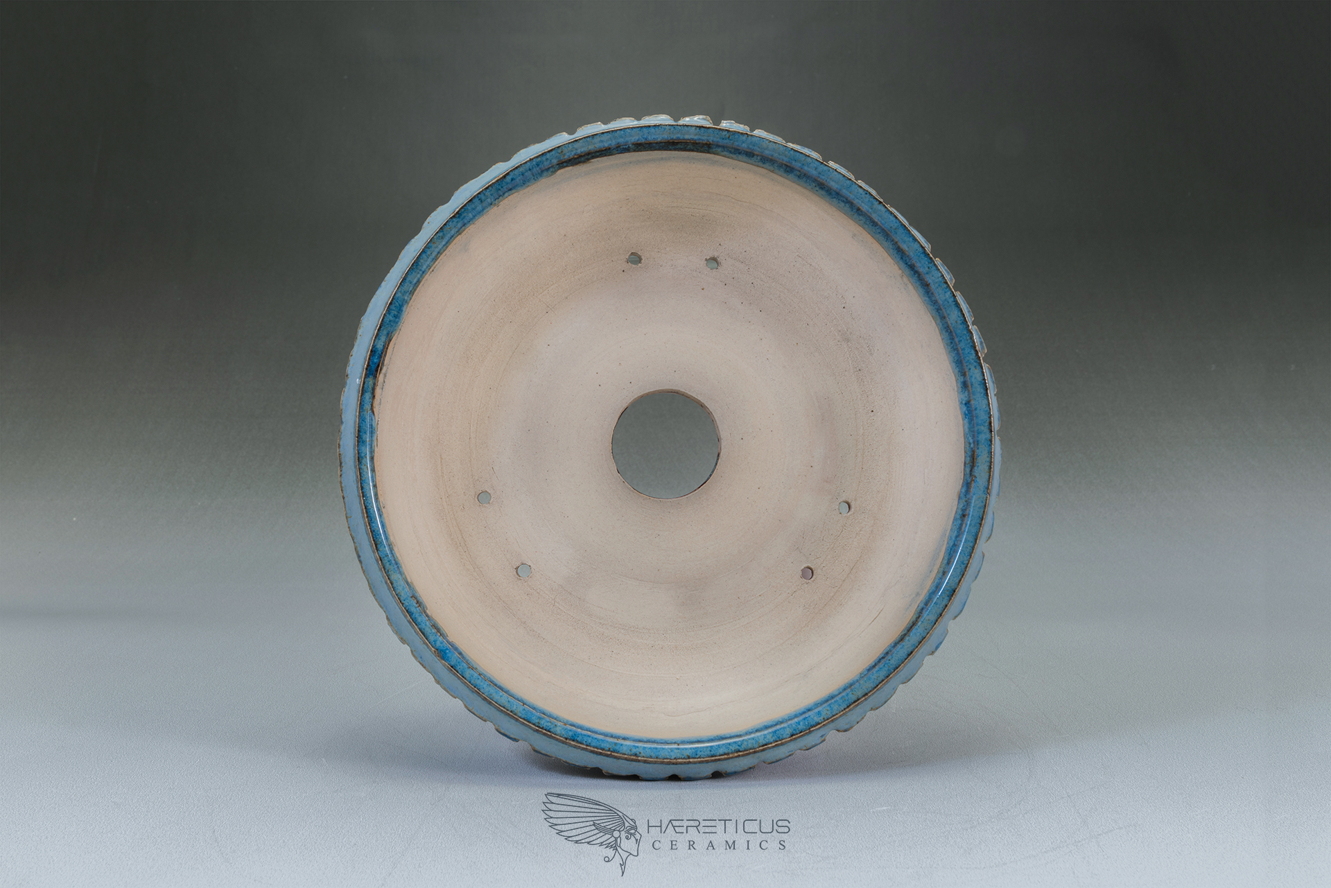 Shallow round shohin pot with a raised texture along the circumference. The light blue glossy glaze breaks up the texture, creating orange-brown tones.