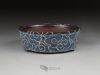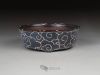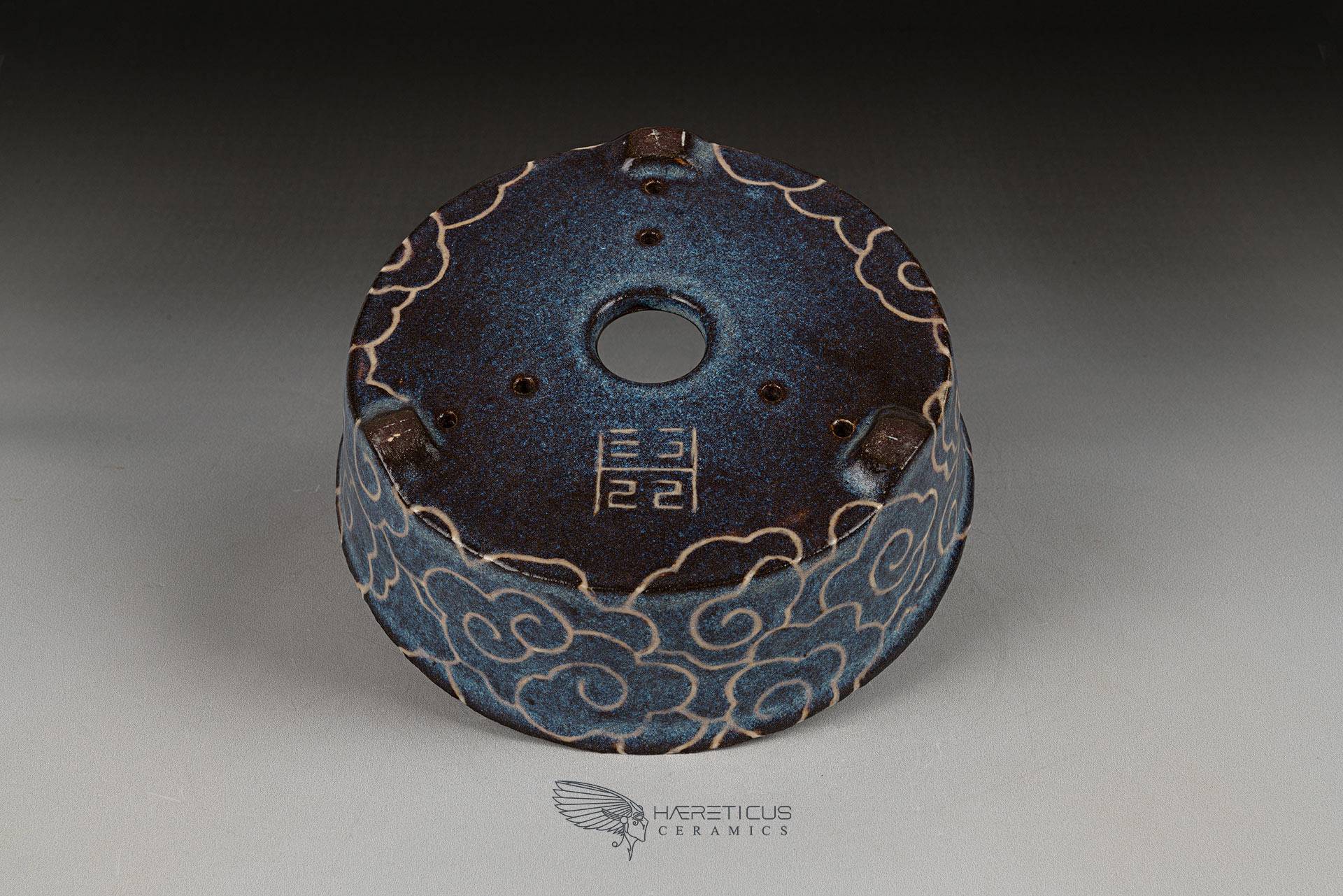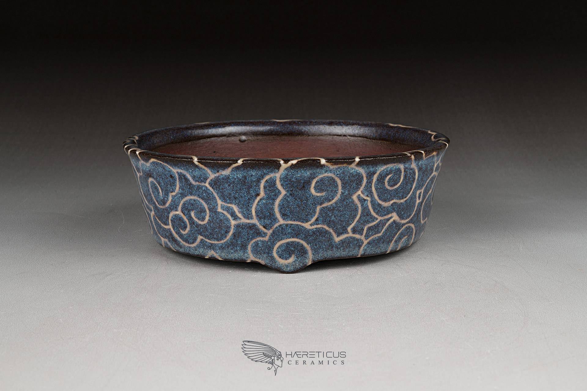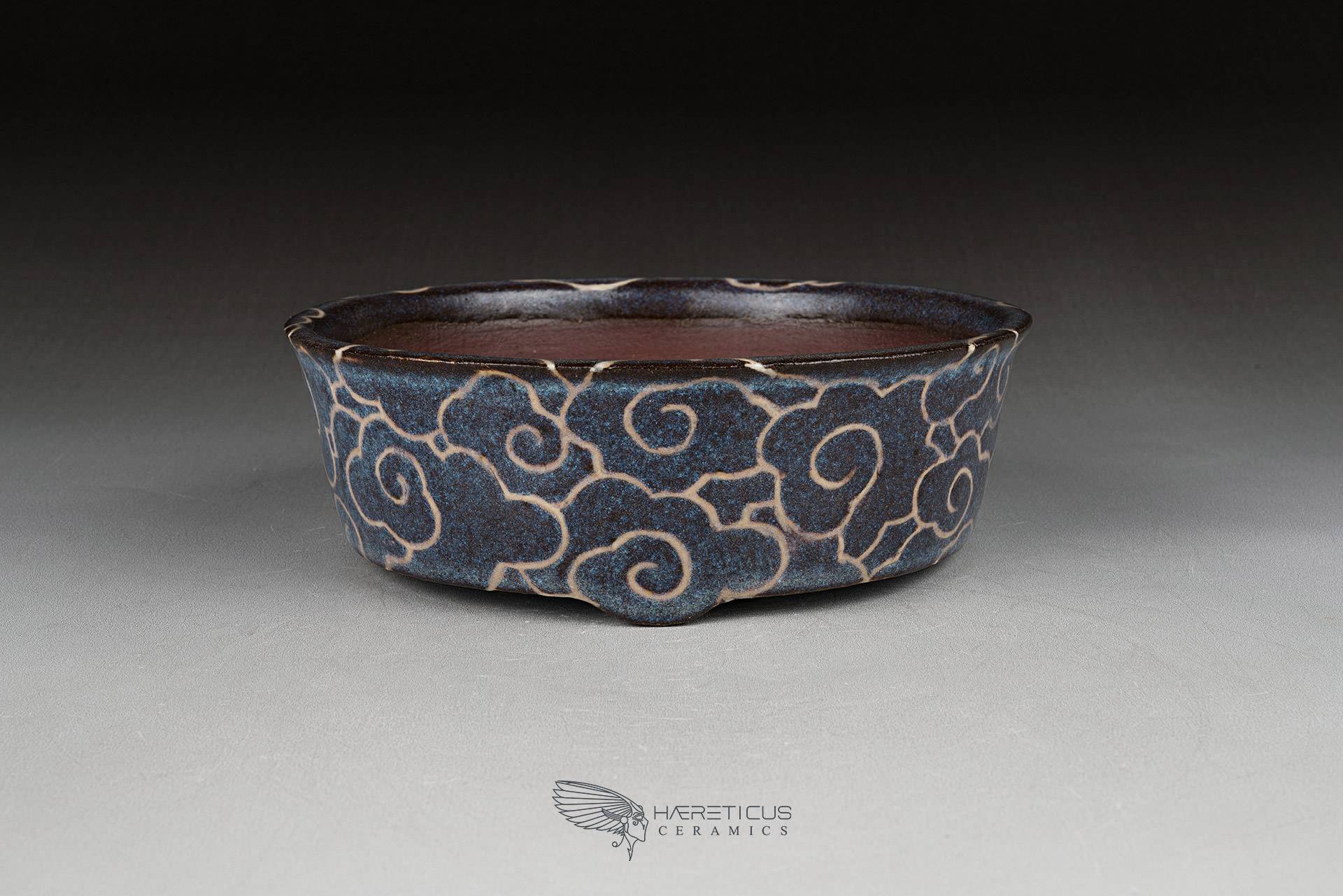 Stoneware pot with clouds engraved using the Mishima technique (engraving a design into clay, filling it with a contrasting engobe, and then removing the excess, leaving the color embedded in the engravings). This glaze reacts with the color of the clay it covers, so it turns blue on red clay and silvery white on light clay. Having been fired at just under 1300°C (2,372°F), it has undergone slight deformation, so when viewed straight from above, it is not perfectly round.