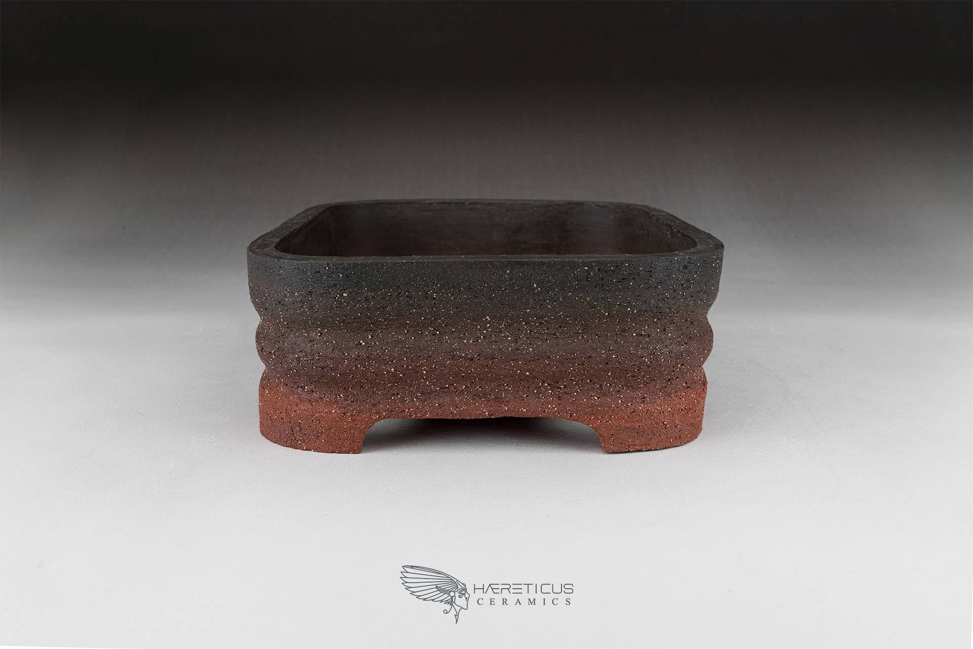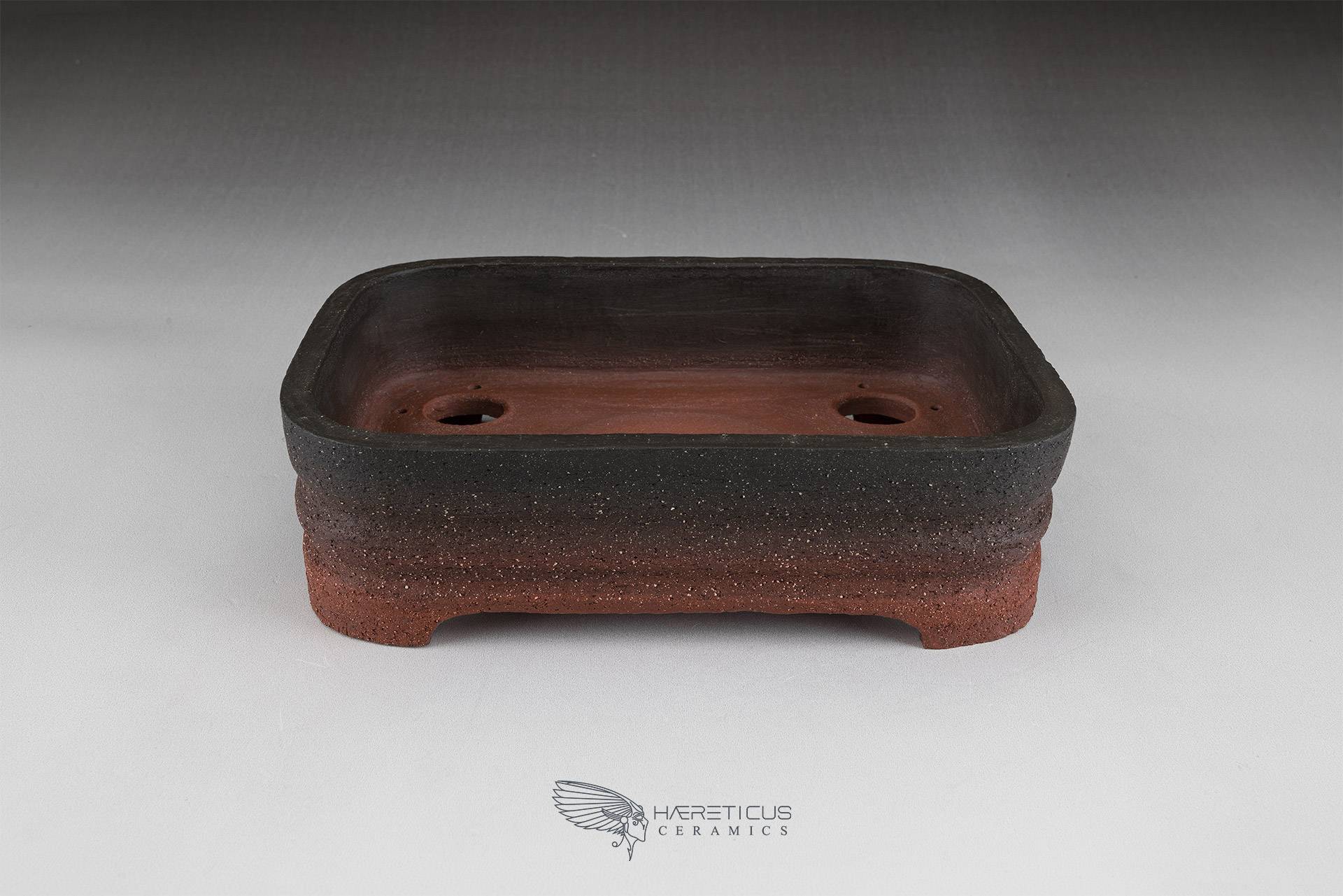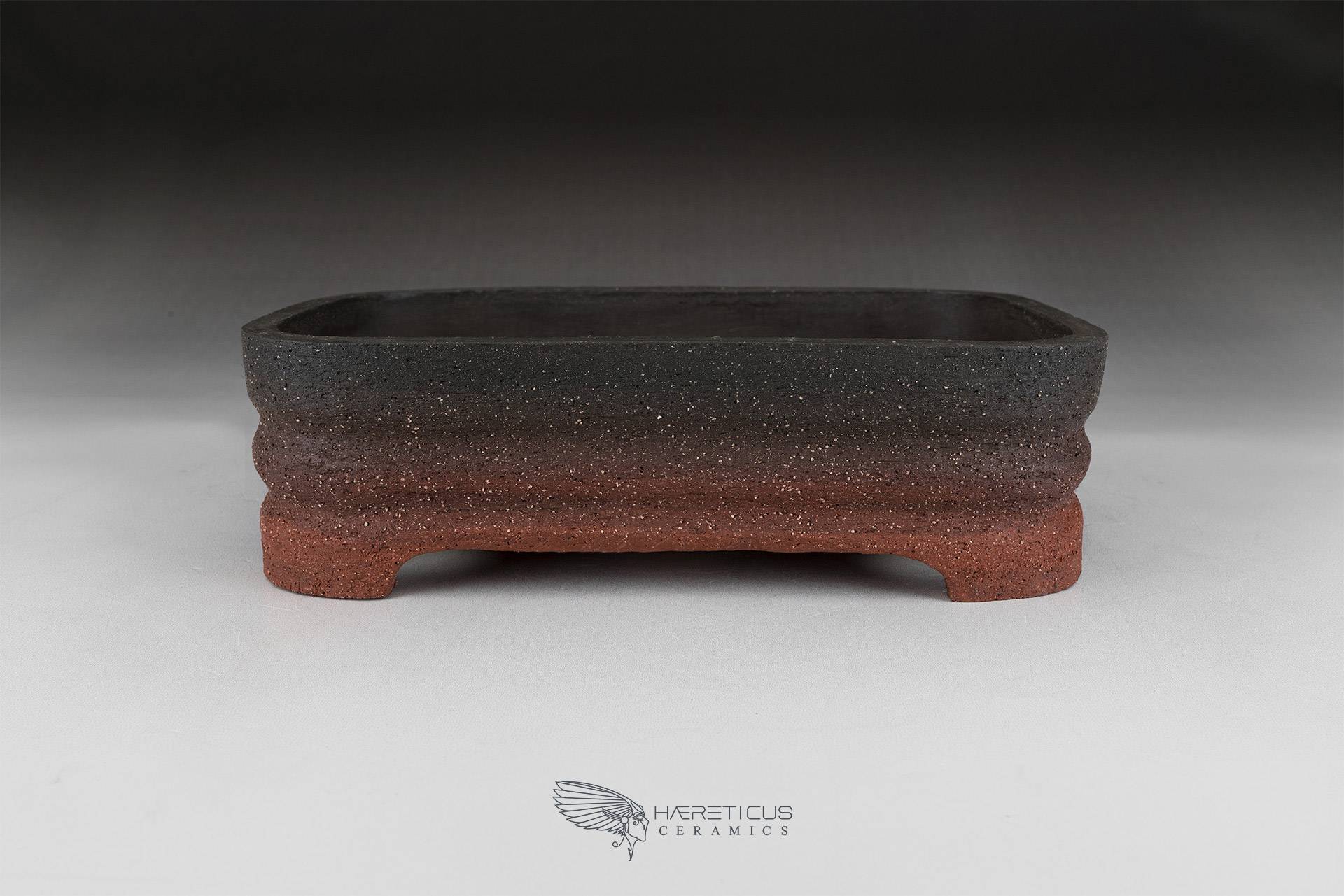 Rectangular pot, constructed from slabs (tatara-kurinuki), made of a neriage clay rich in chamotte, which gives the structure greater solidity and a rustic look. Two different clays, one black and one red, were blended in varying degrees and then pressed together to achieve a natural gradient, intrinsic of the pot's material.