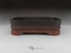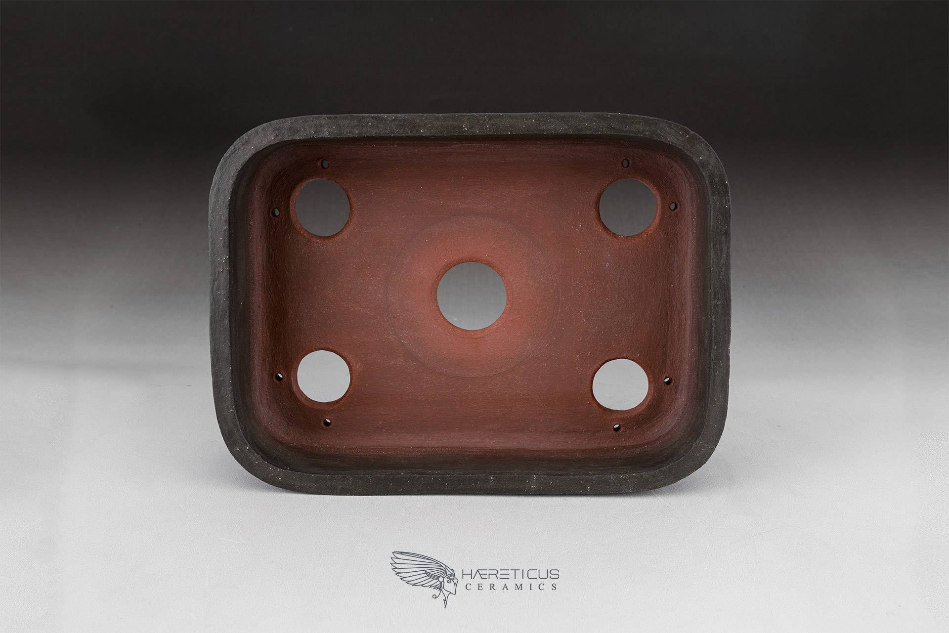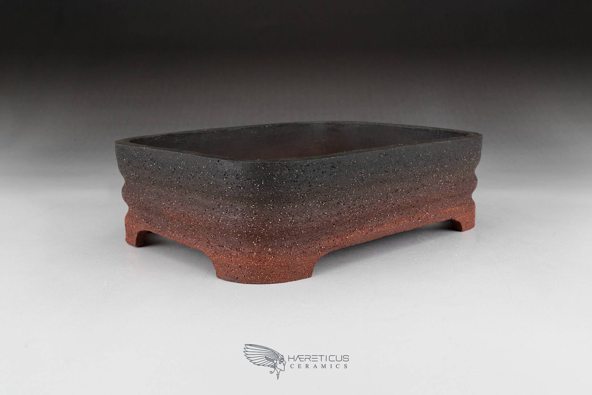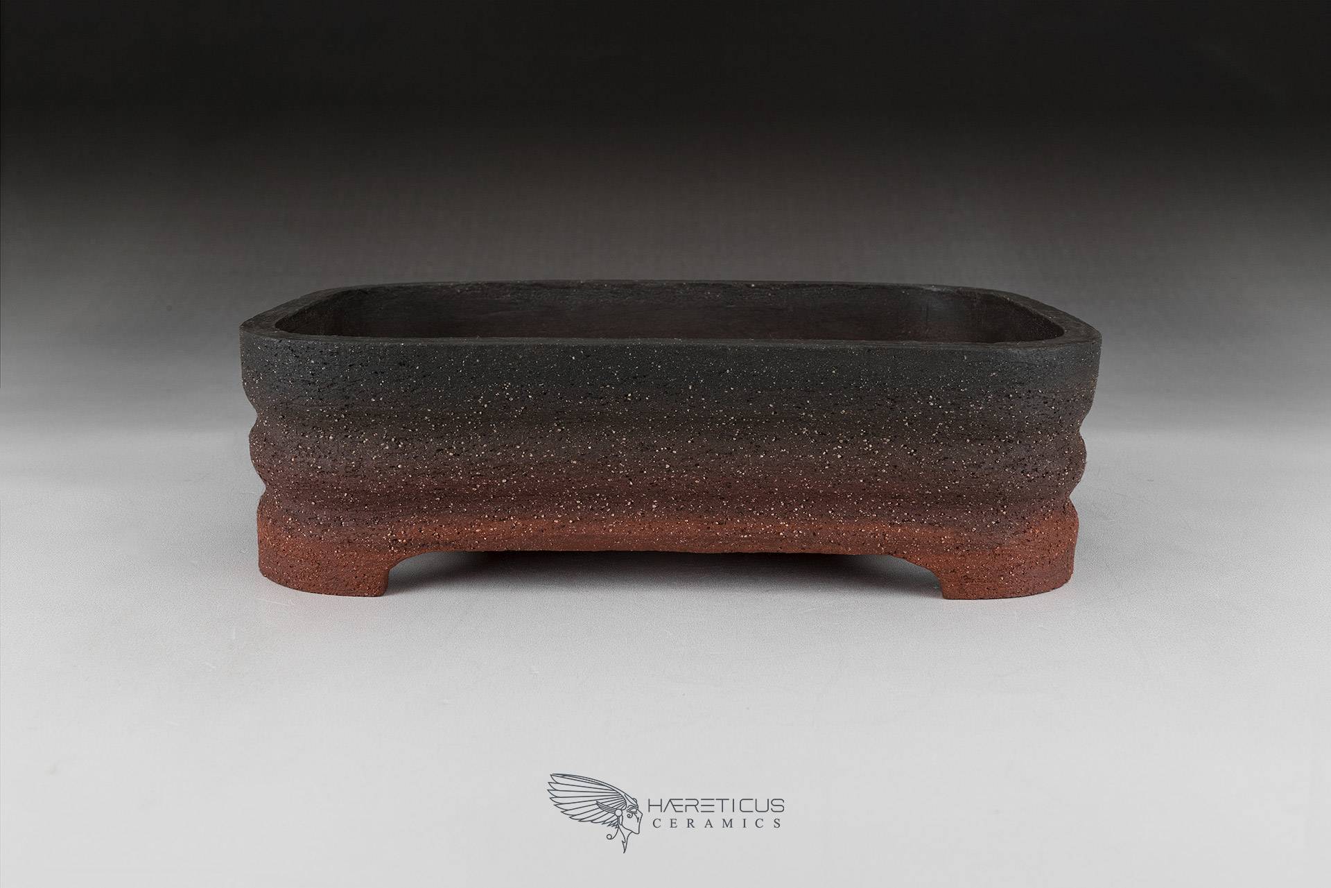 Rectangular pot, constructed from slabs (tatara-kurinuki), made of a neriage clay rich in chamotte, which gives the structure greater solidity and a rustic look. Two different clays, one black and one red, were blended in varying degrees and then pressed together to achieve a natural gradient, intrinsic of the pot's material.
