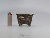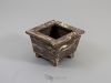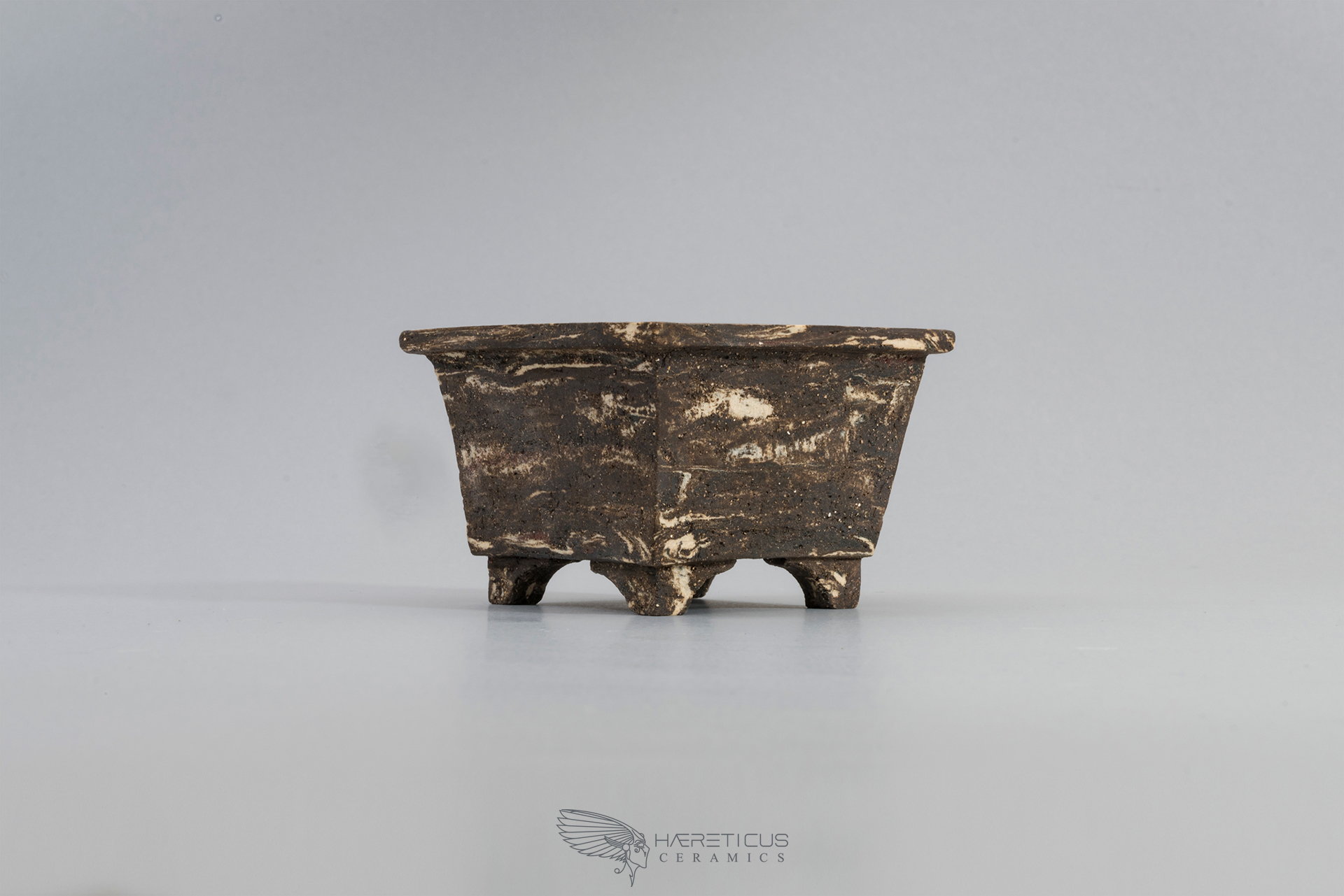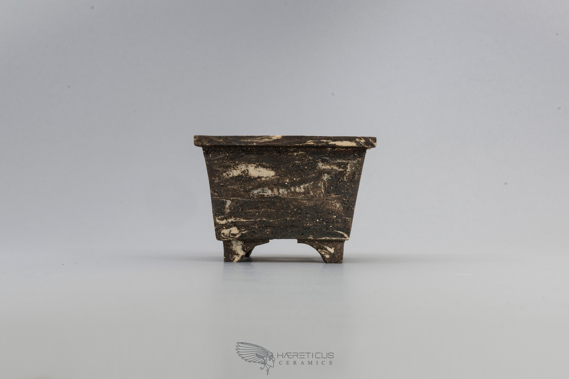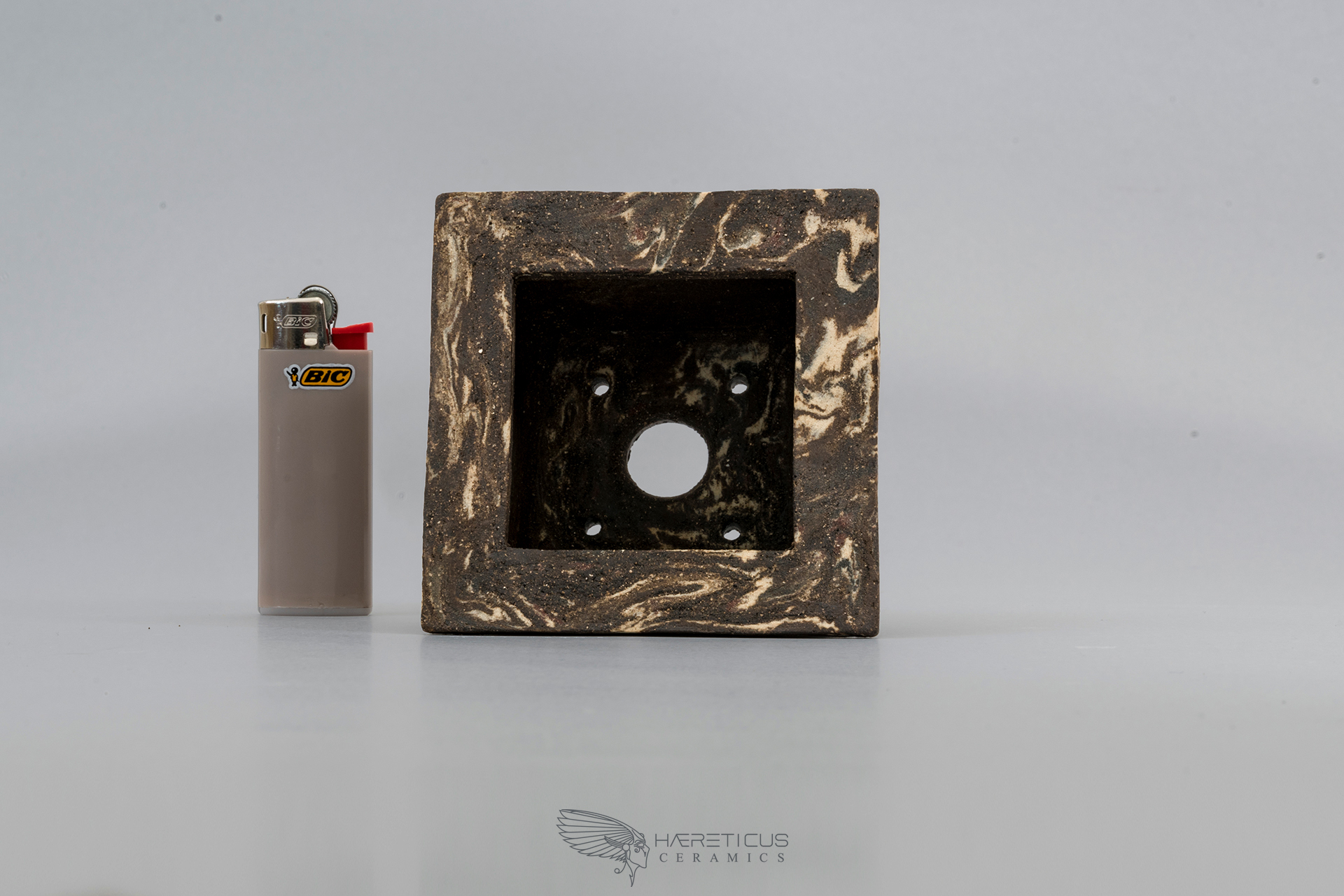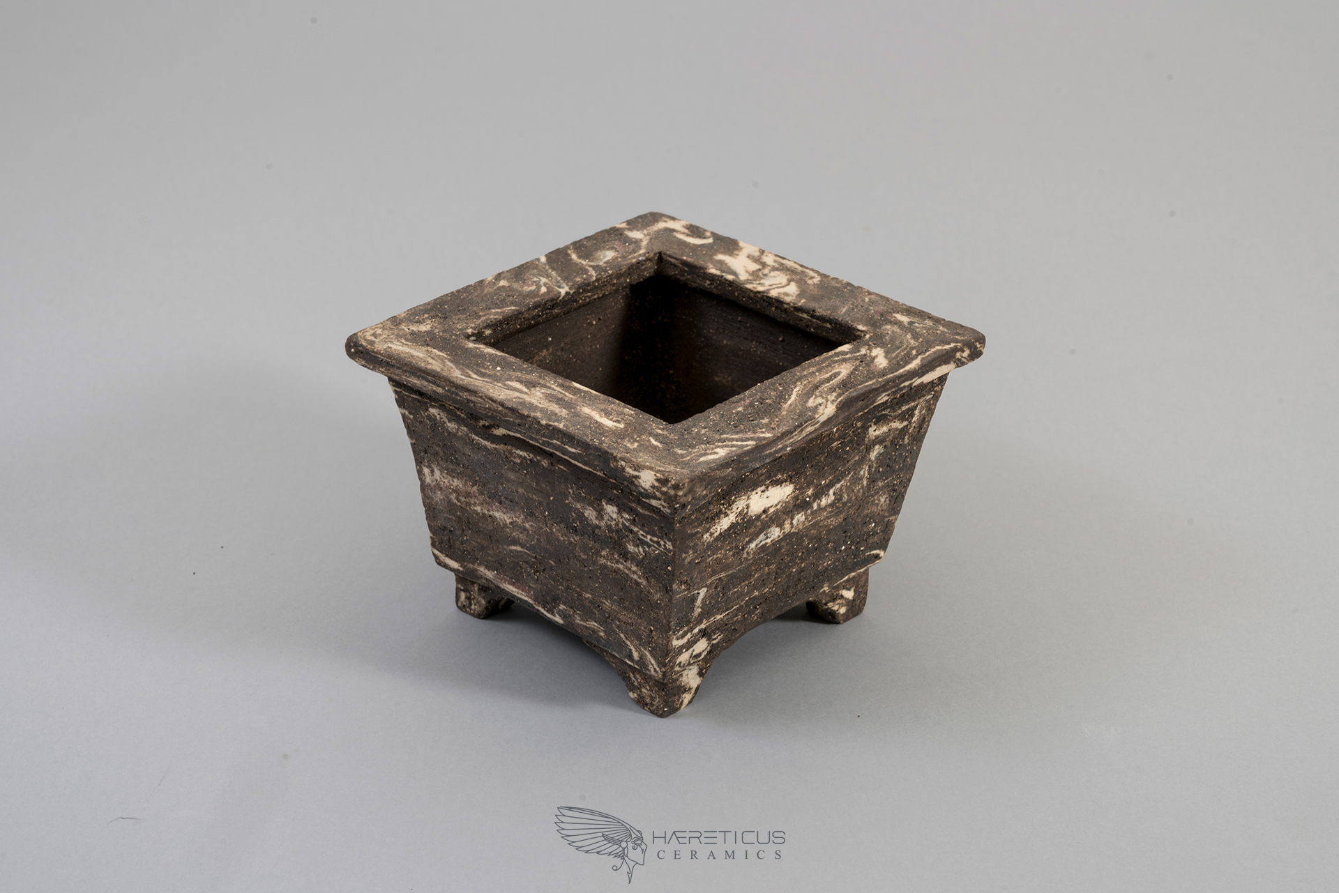 This square unglazed pot, constructed using the neriage technique (two or more clays of different colors mixed to create a marbled effect), was carved from a single block of clay (kurinuki technique). Ideal for a semi-cascade-style mame bonsai or for a shitakusa.