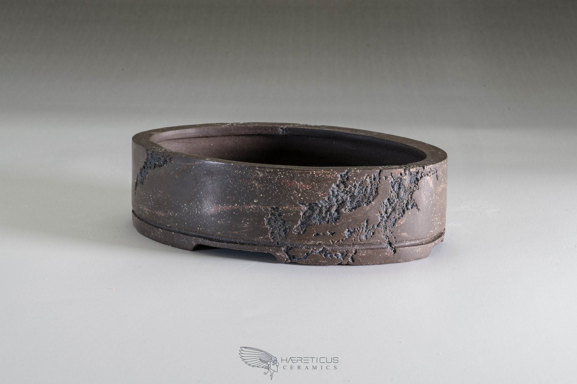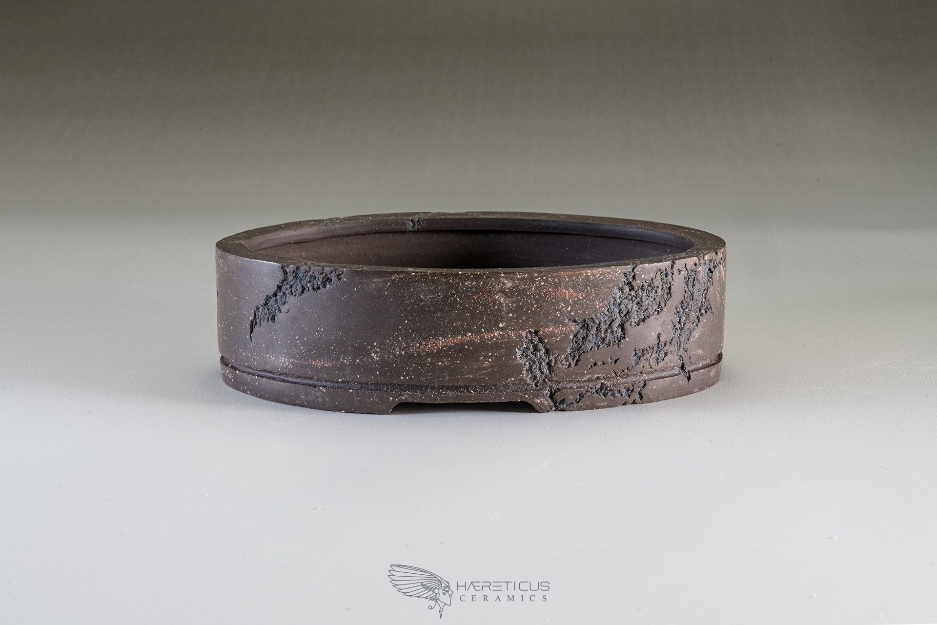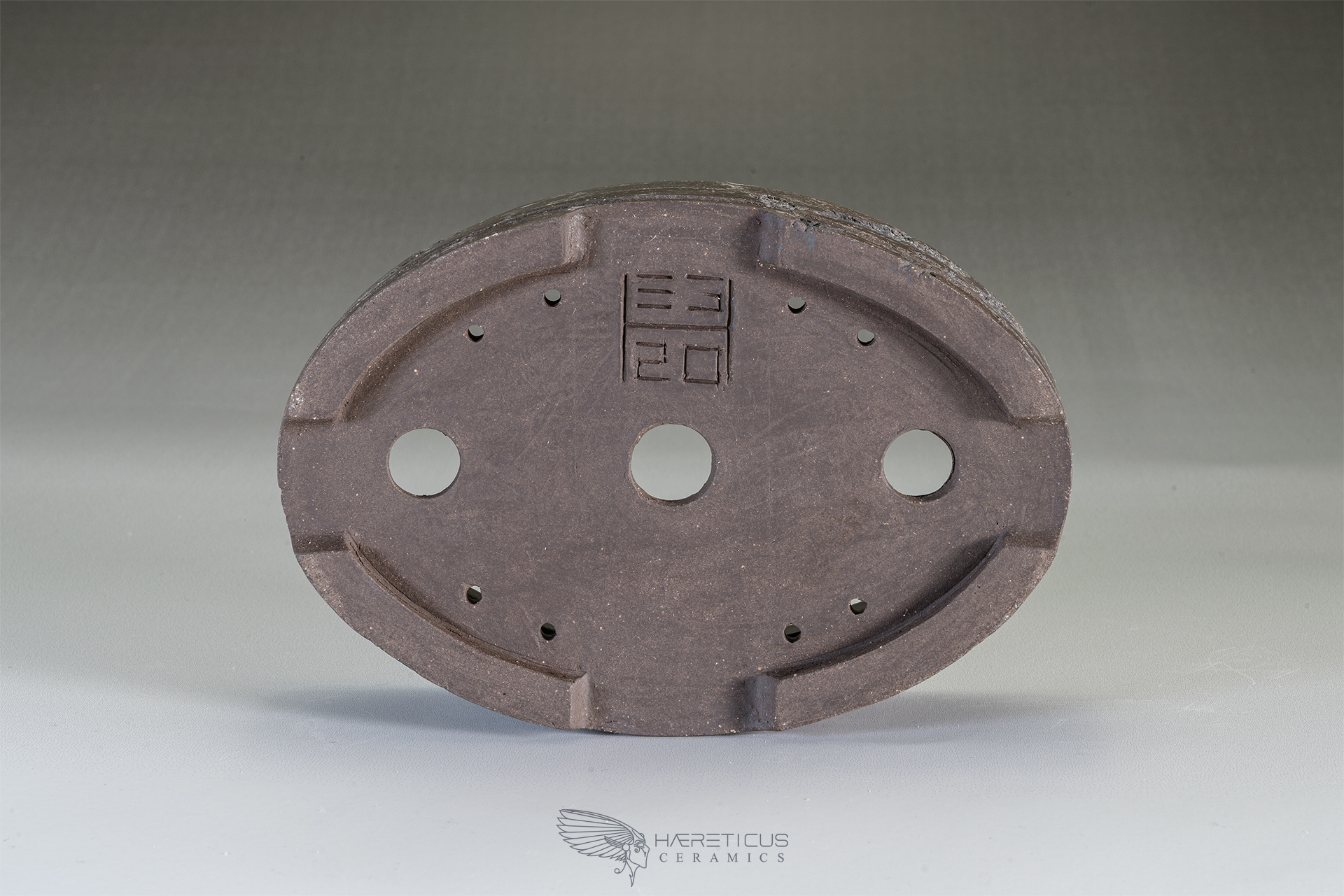 This little oval unglazed pot, carved with the Mushikui technique (worms eaten), has stright walls and 4 large shallow feet. The dark brown clay with hints of reddish colors was burnished to take a quite shiny satin appearence. On one side the carving was made leaving a part in the shape of the Japan map.