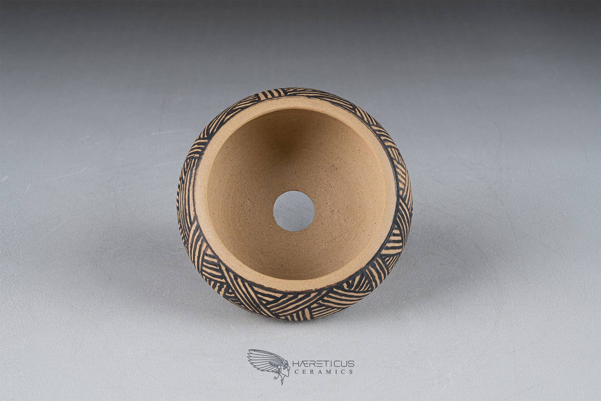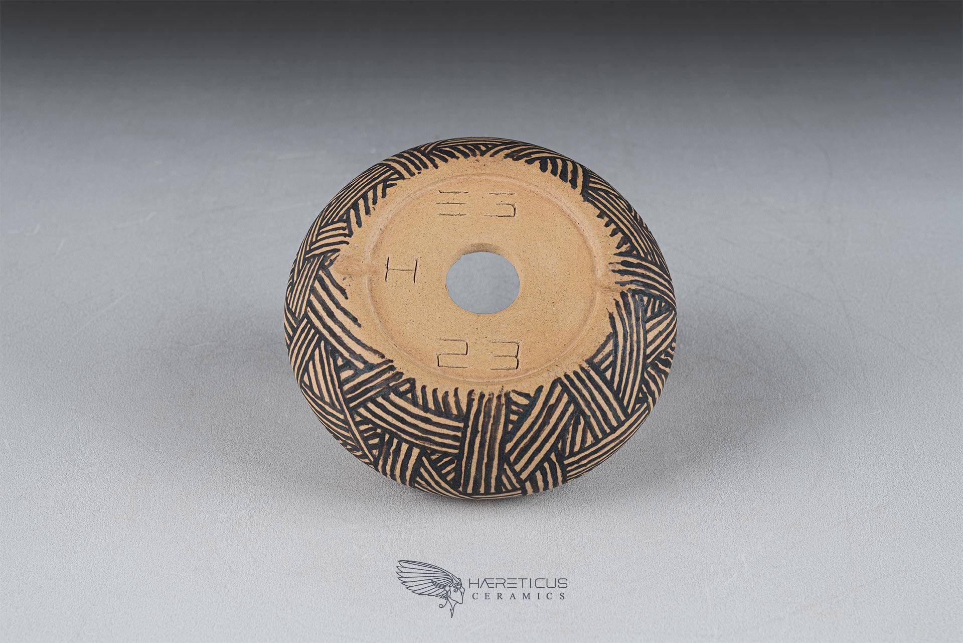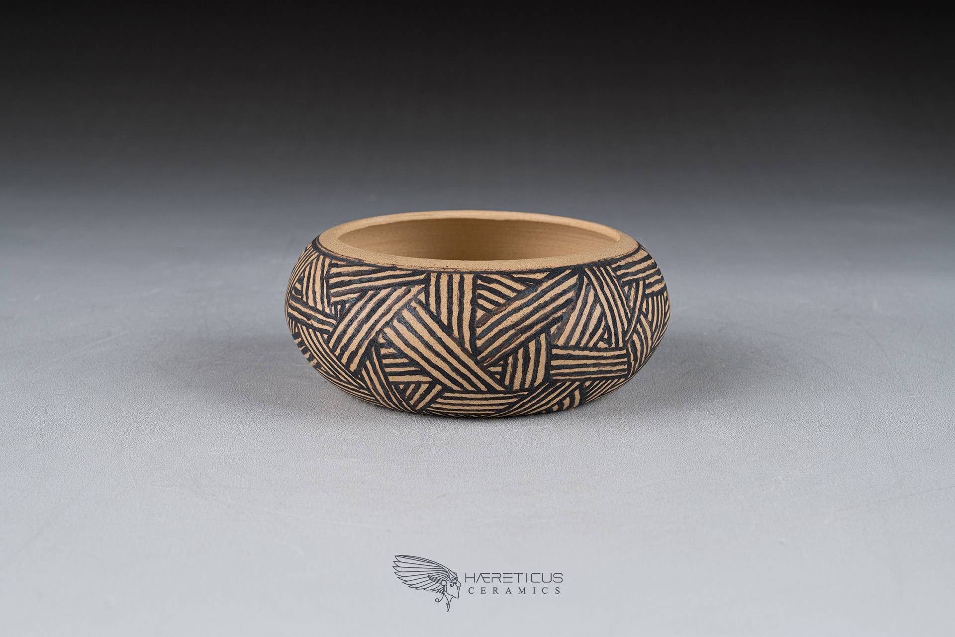 I wanted to create a more rustic, somewhat worn style for basket pots, and this idea gave rise to this pattern. The weaves are random, not ordered, creating a less geometric and static look. Painted with black iron oxides on sand-colored stoneware.