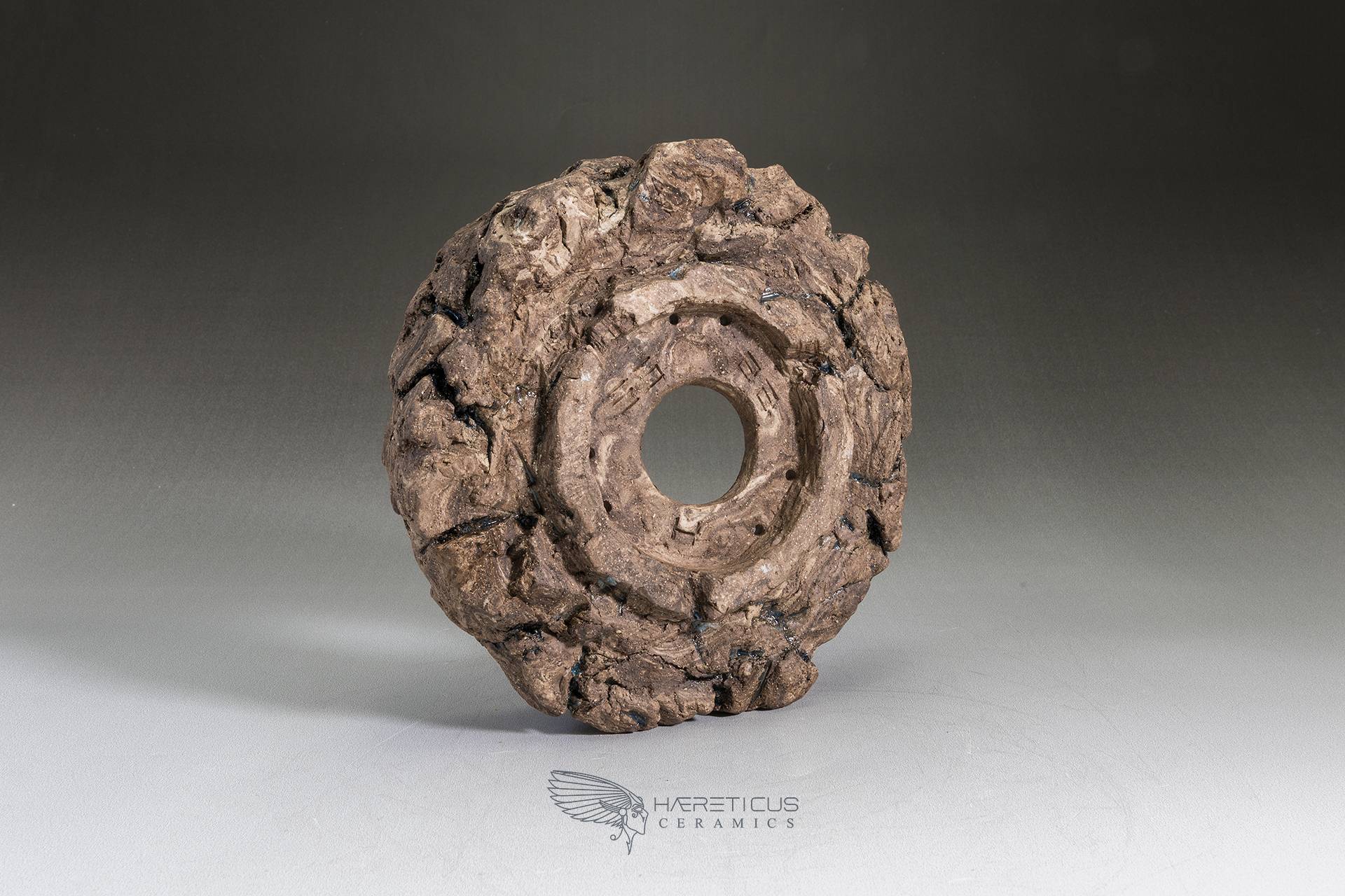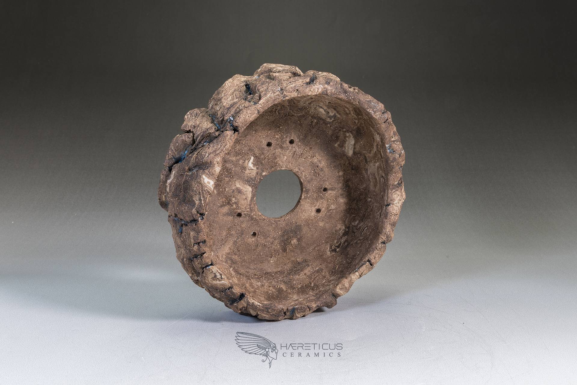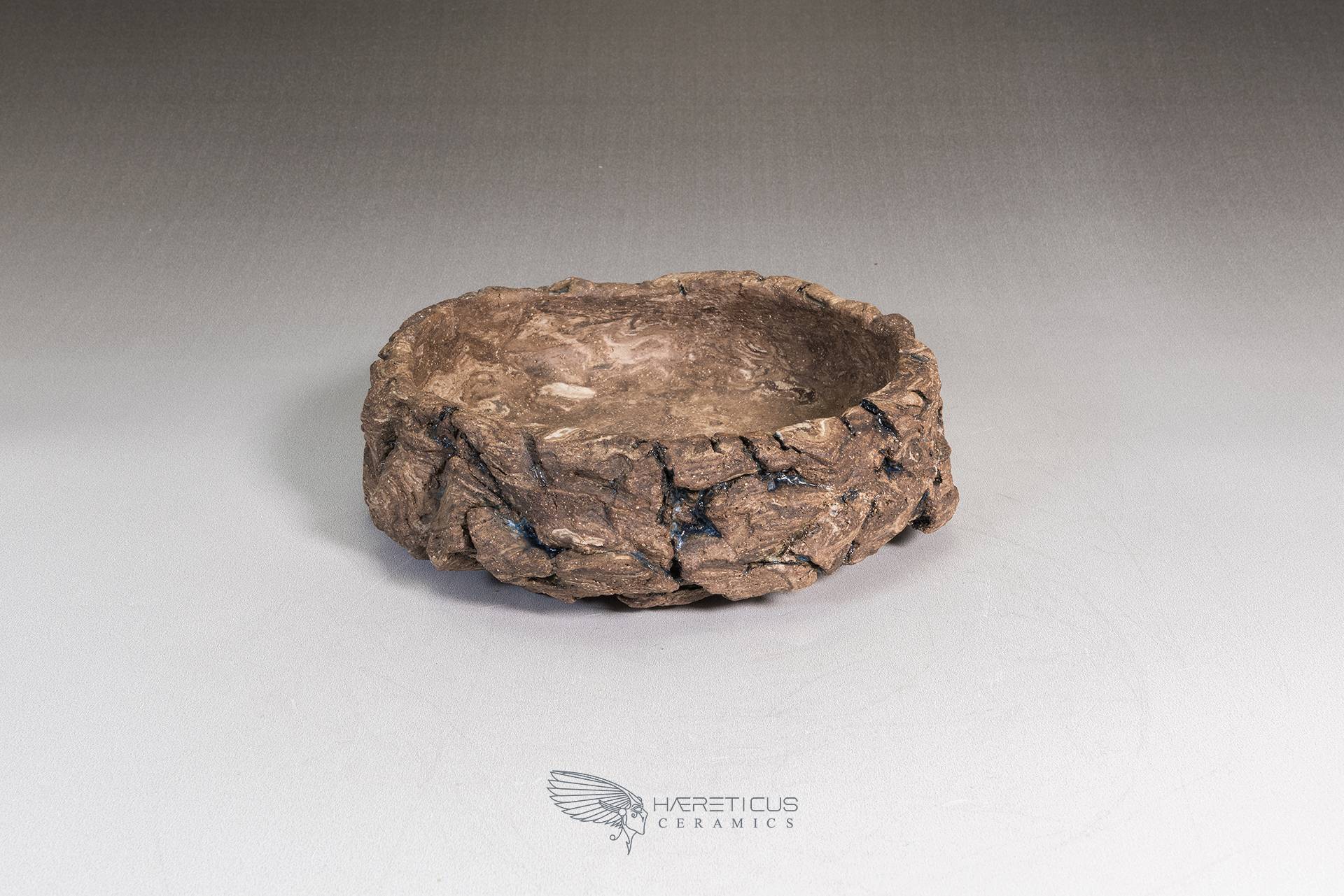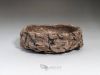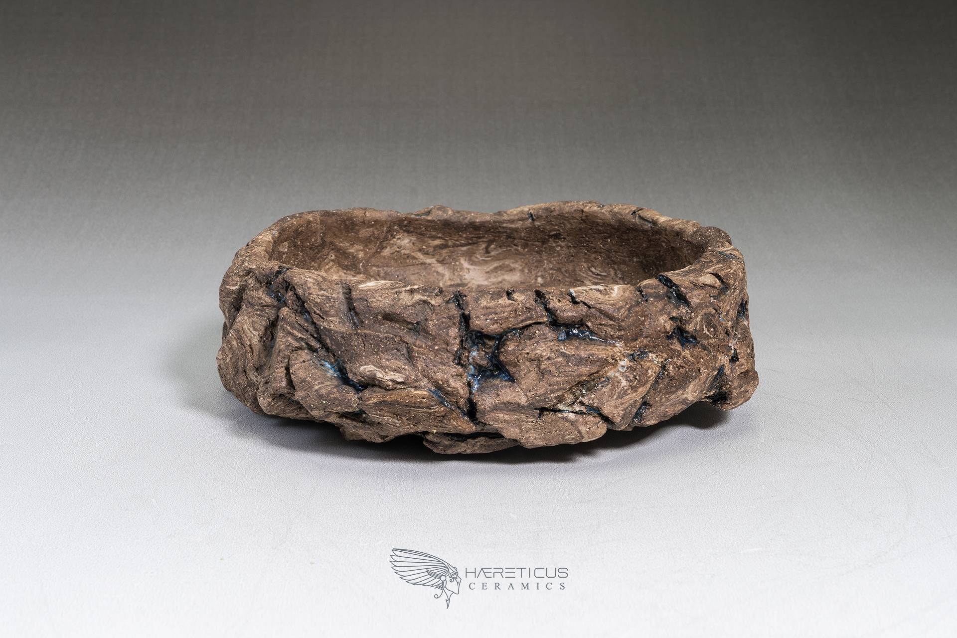 The pot was carved entirely from a single block of clays of different colors (kurinuki - neriage). A transparent glaze with bluish hues was then applied to the cracks and crevices to emulate water trickling down a rock.