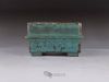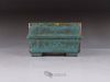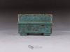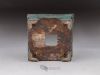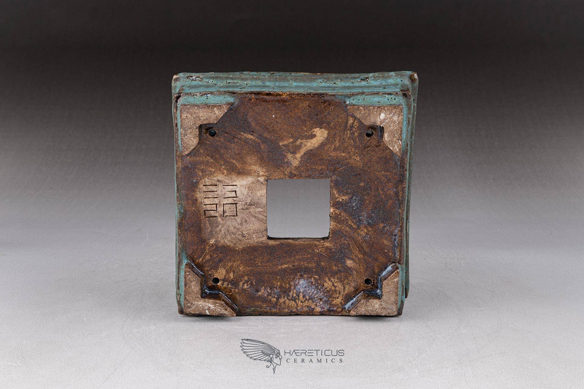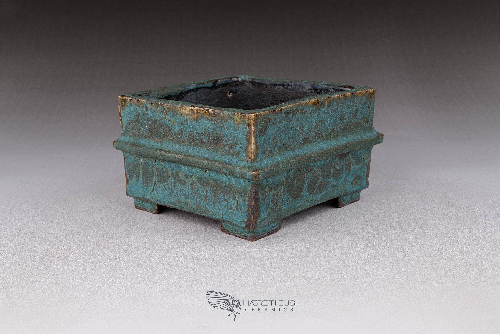 Small square pot, constructed from slabs (tatara-zukuri), with a rustic, worn look. The glaze is a satin antique bronze green that breaks on the variegated neriage clay. Ideal for a mame bonsai or a shitakusa.