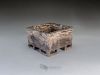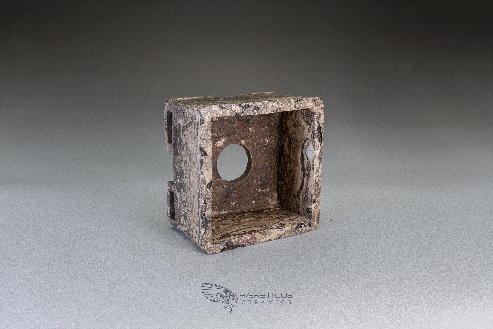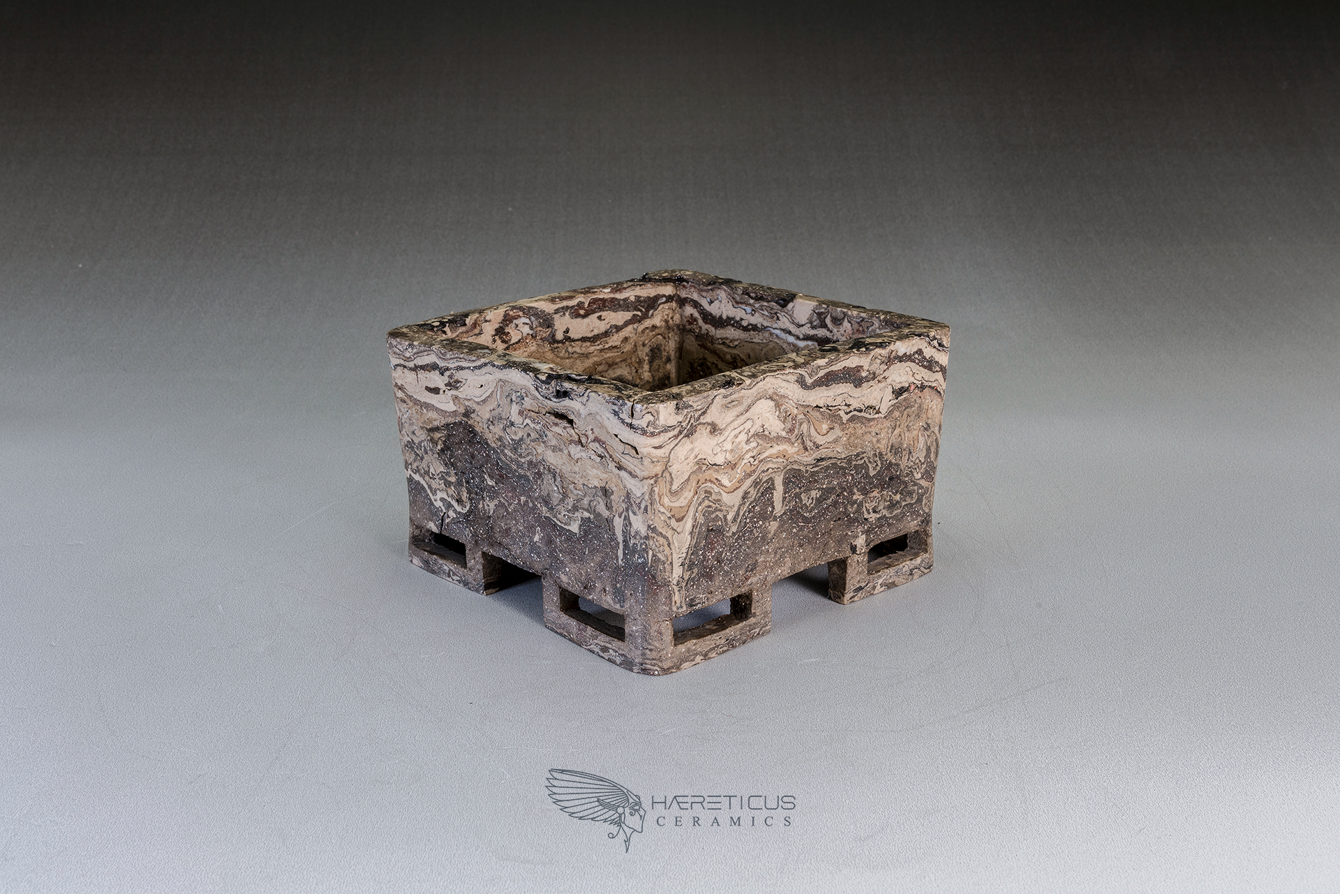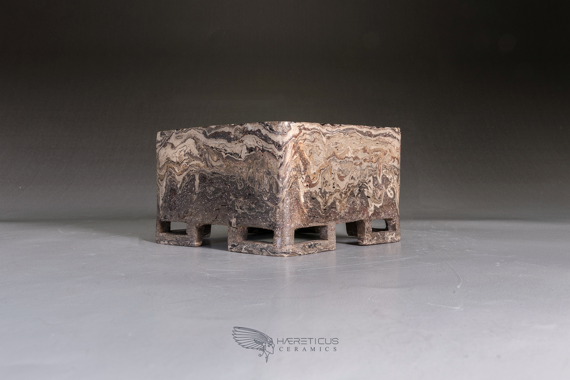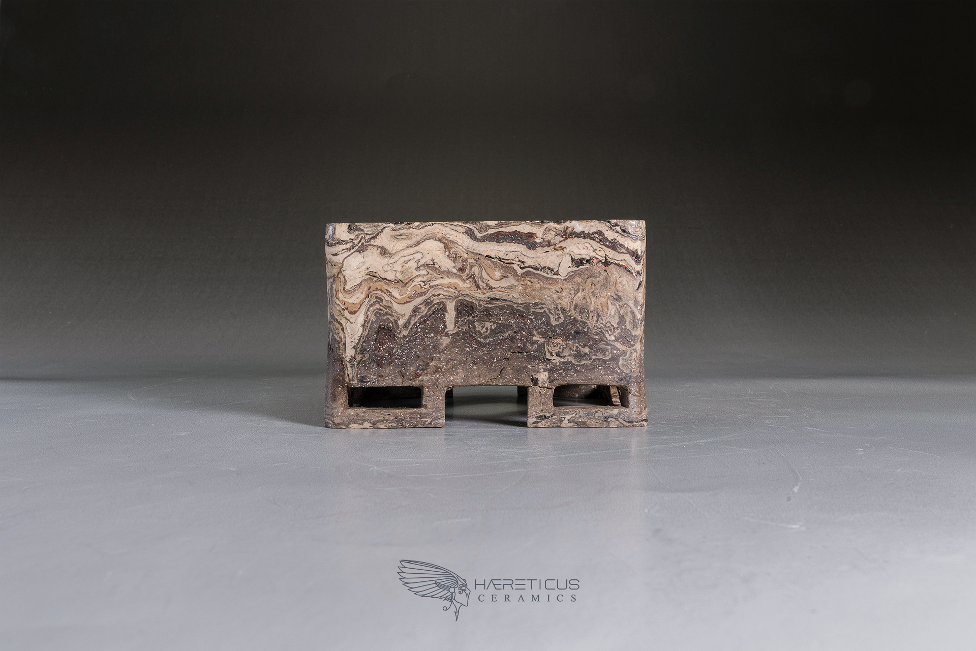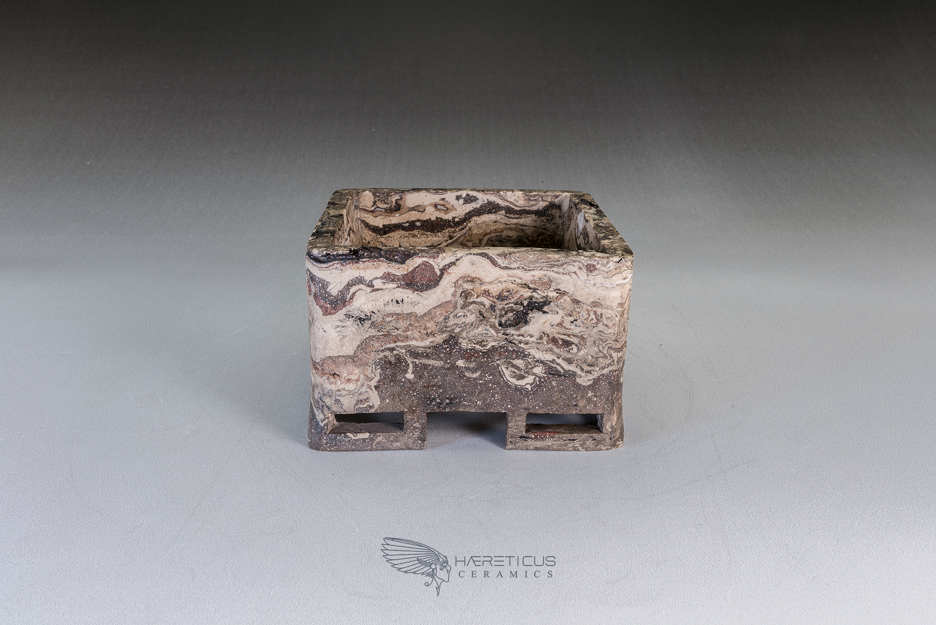 Suitable for a small shohin or a shitakusa, this pot was carved from a single block of different colored clays (Kurinuki technique). The four corner feet are hollowed to visually lighten the overall shape. After firing at 1280°C, it was polished on the outside to enhance the marbled feel of the stoneware.