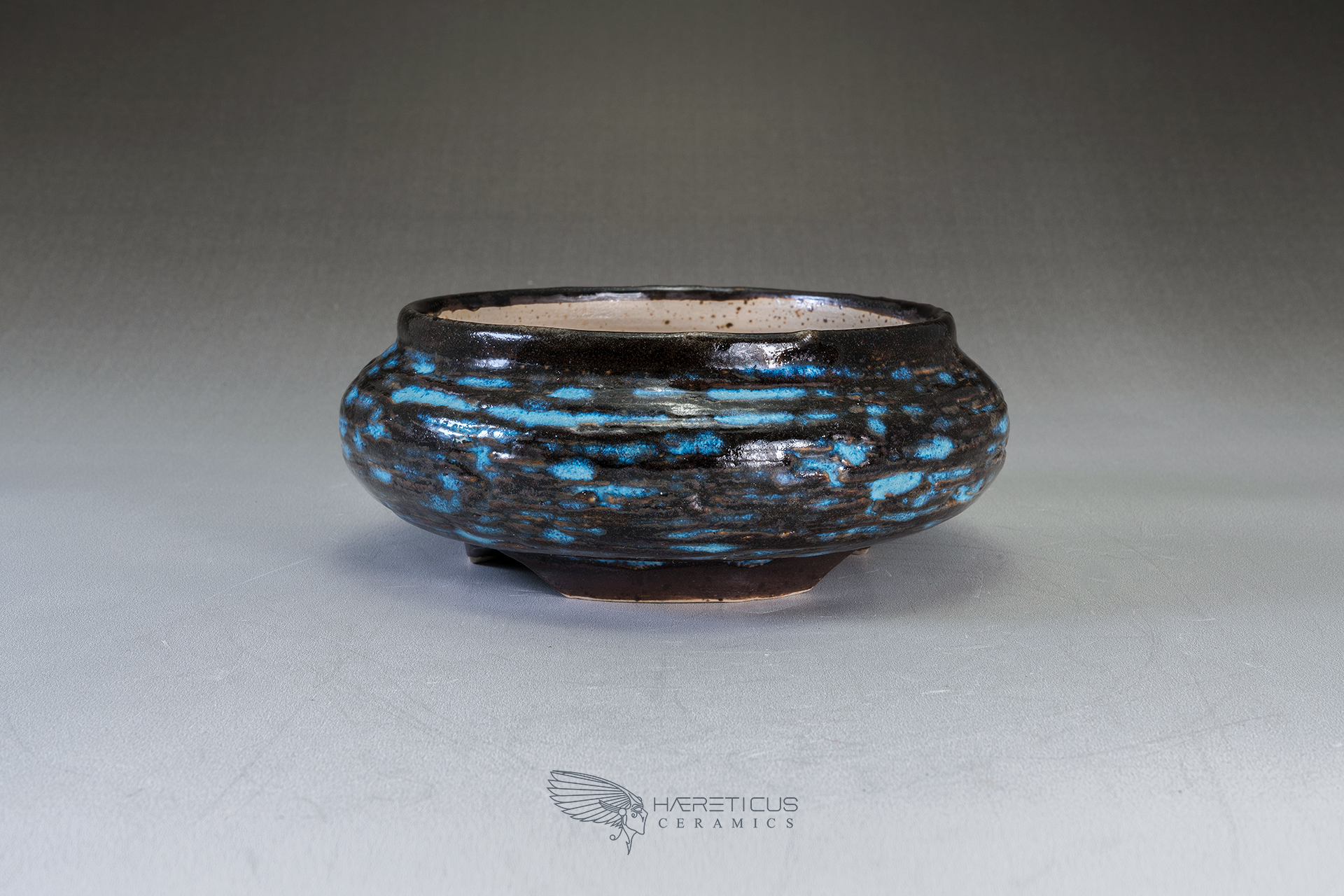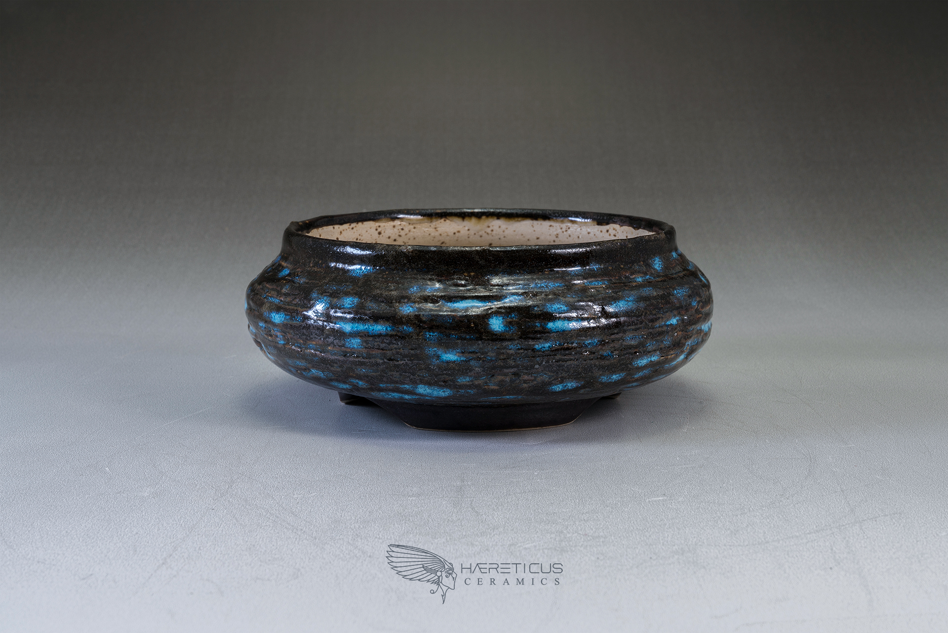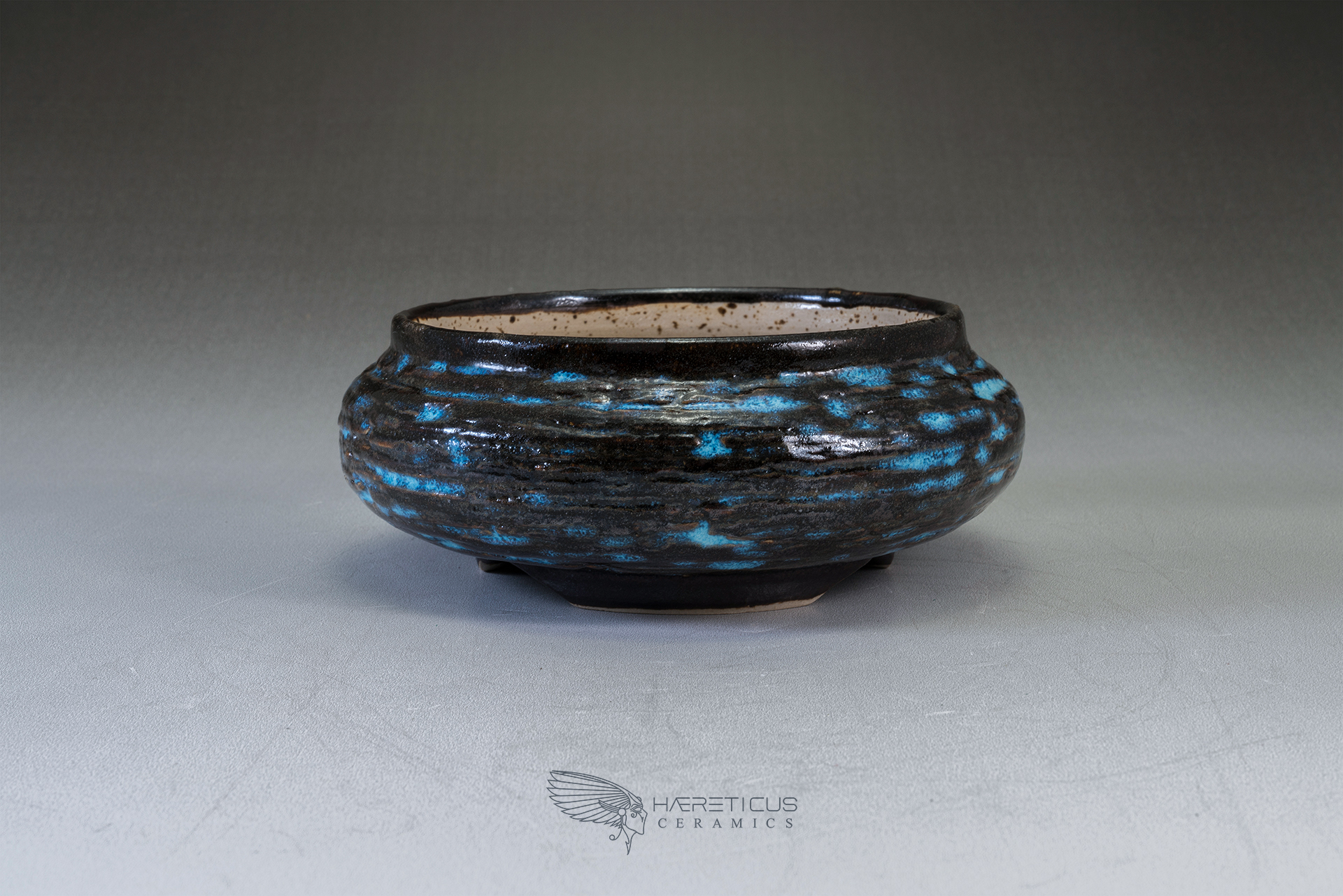 This mame pot made was on the potter's wheel and then carved. The pot was coated with a base glossy black glaze covered with a light blue one that only appears in the deeper grooves. EG - 2018