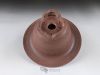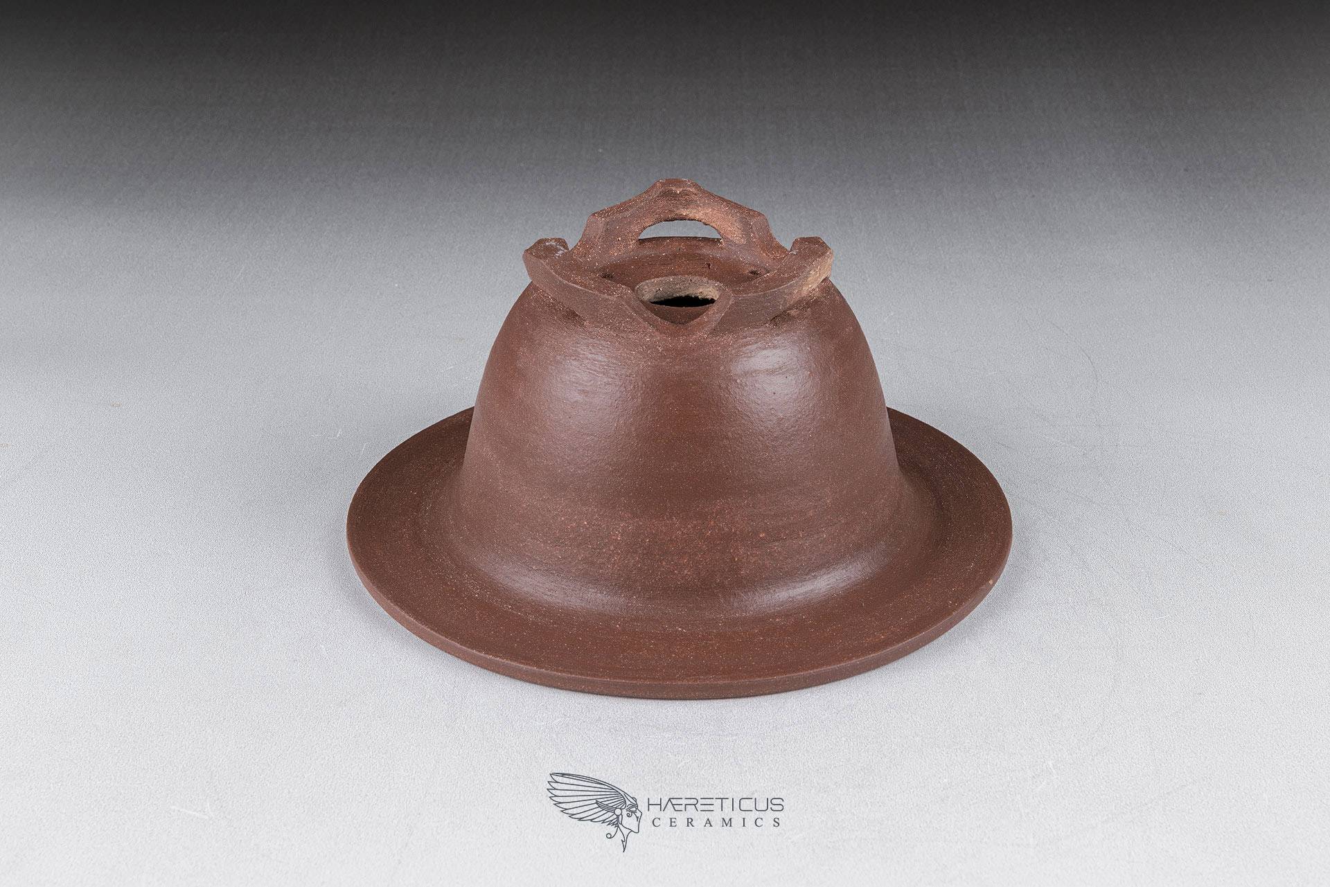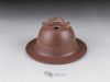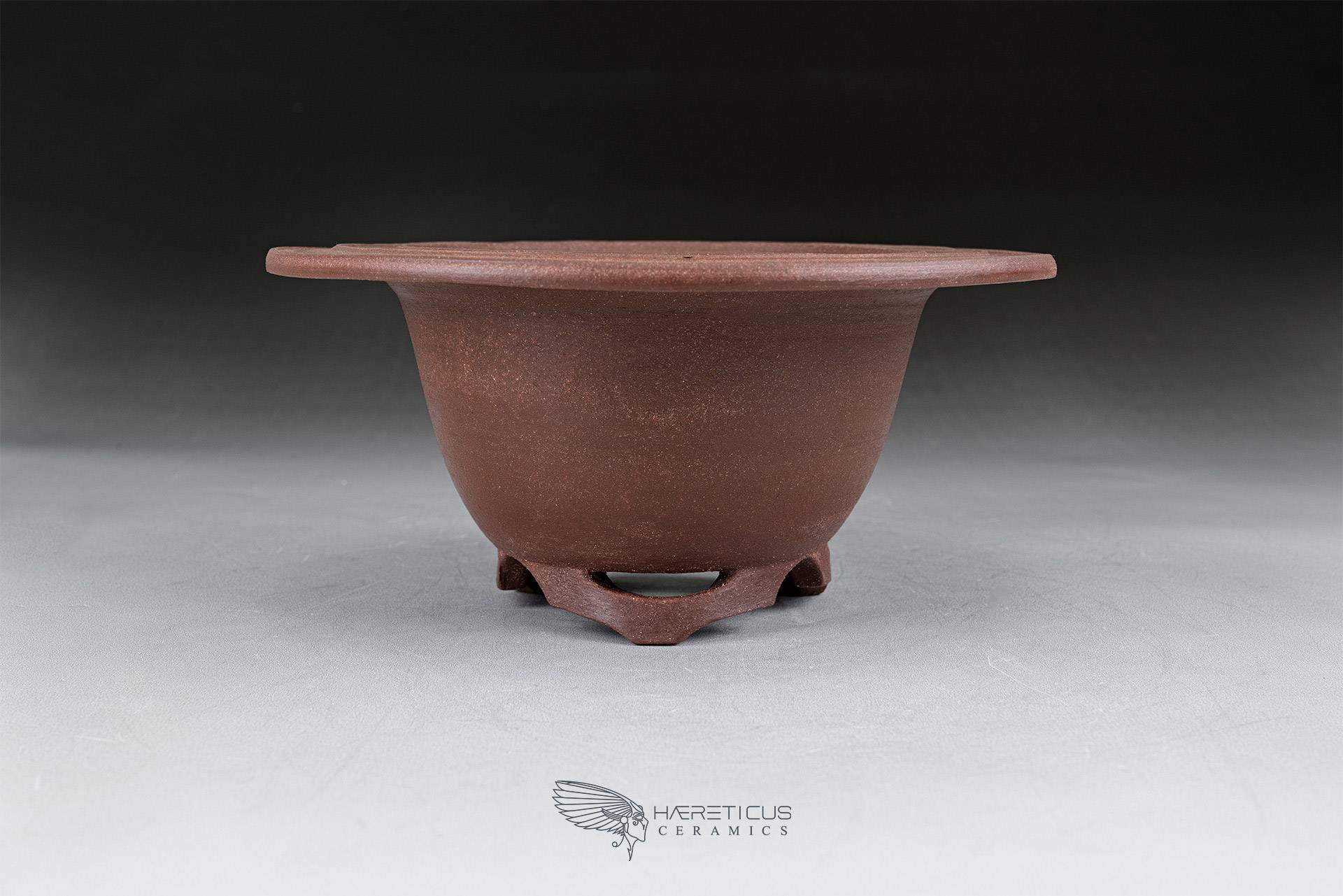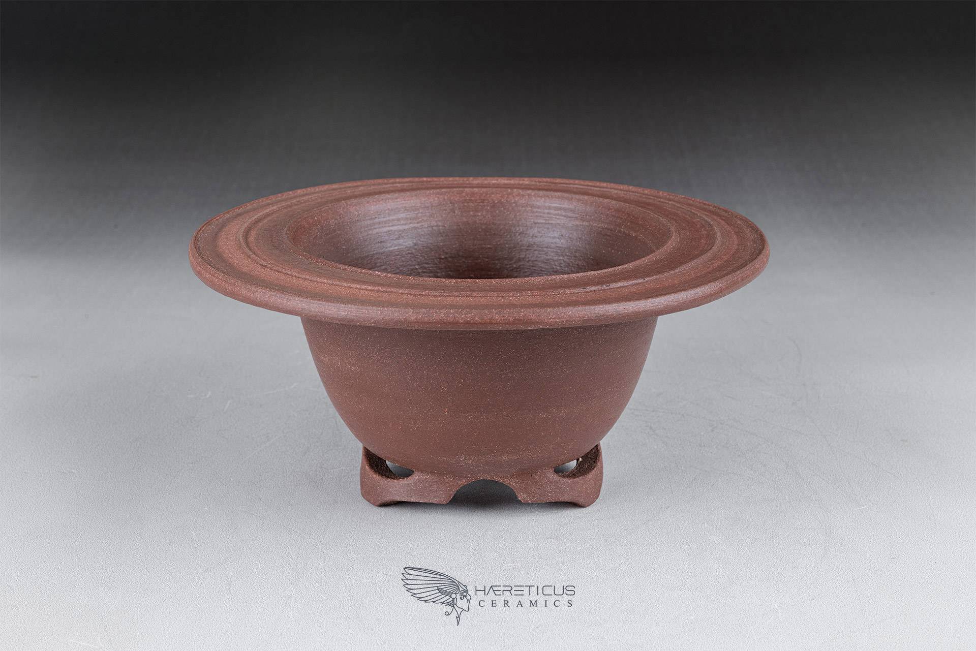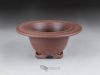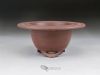 Round, wide-rimmed stoneware pot in a muted sienna brown with lighter hues at the base. The upper rim features concentric reliefs depicting gentle ripples of water breaking on the shore.
