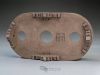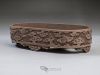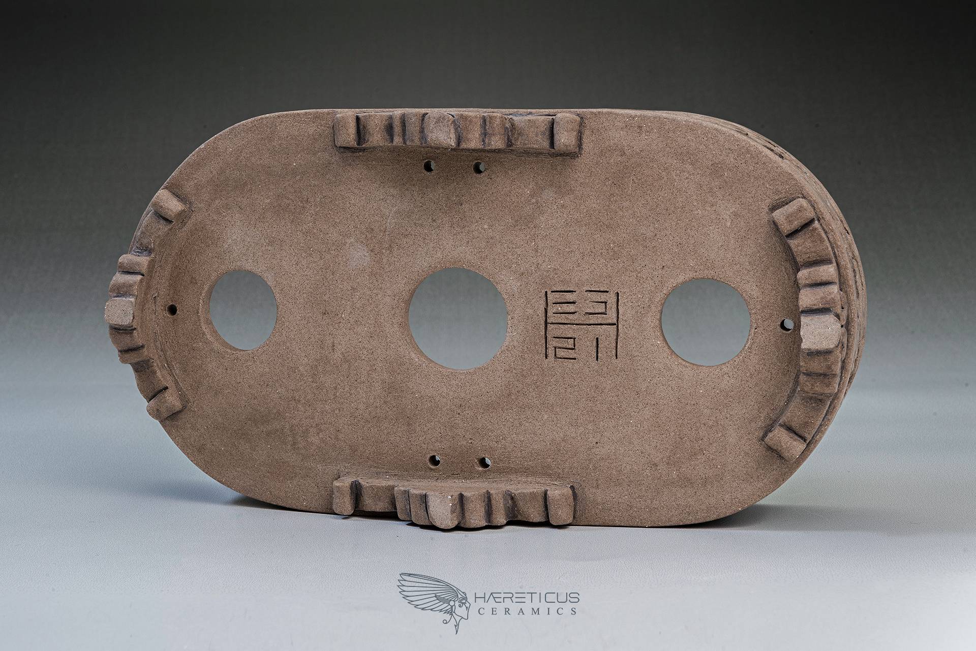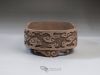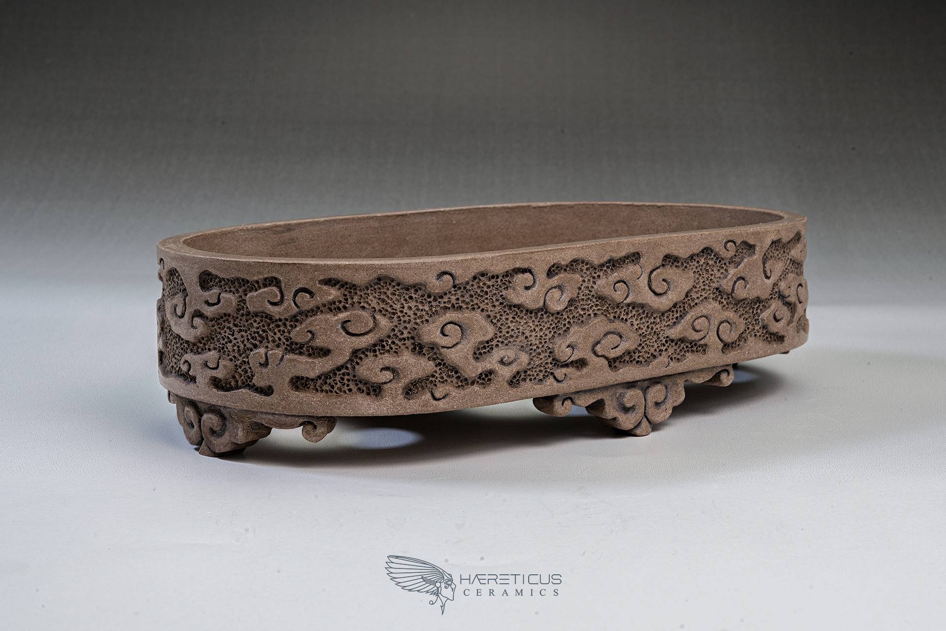 Made from stoneware slabs (Tatara-zukuri) and then carved out to reveal the clouds in bas-relief. The spaces between the clouds were then punched around the entire surface. The feet were designed and then custom-made just for this pot. The surface is unglazed and stained just with oxides.