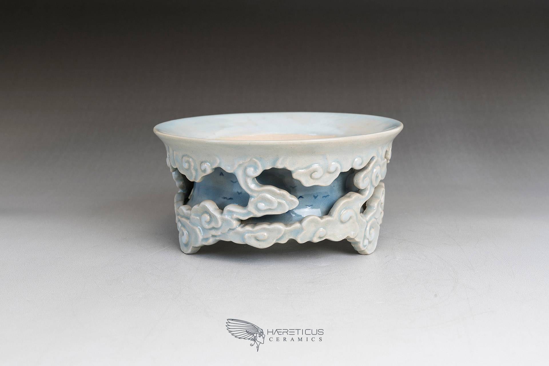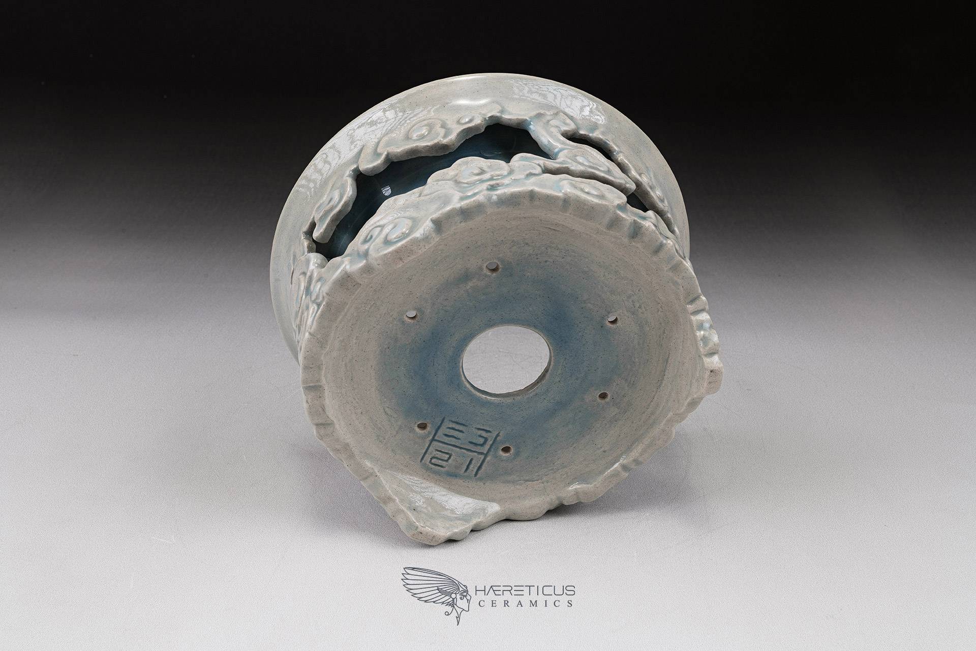This was one of my first experiments with double-walled pots. These types of pots enhance the three-dimensionality of the subject represented, lending depth and dynamism. So I like to imagine a bonsai tree blowing in the wind of a cloudy spring sky. It was made on a potter's wheel, then dry-sculpted, and finally coated with various celadon glazes.