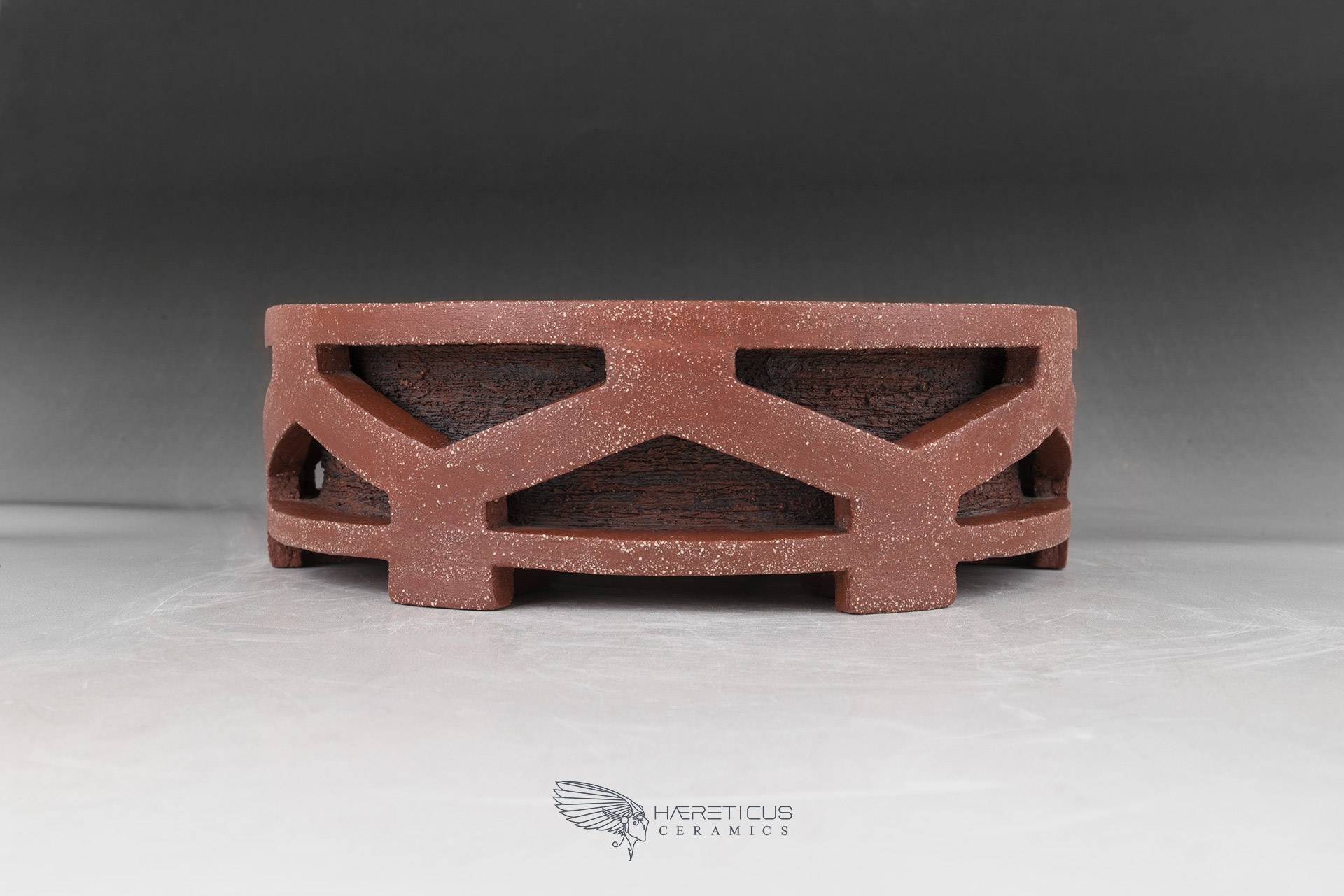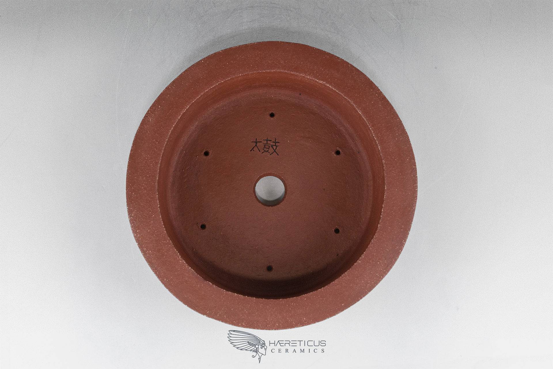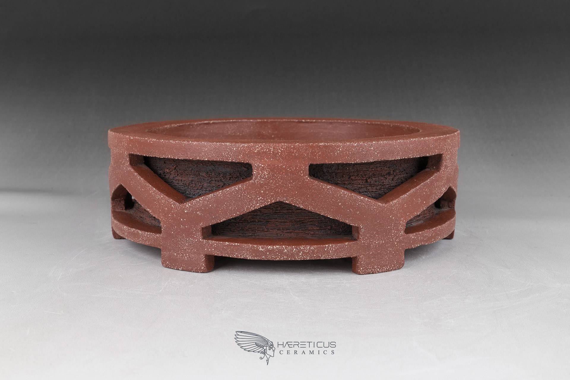 This pot represents one of my first forays into the world of bonsai pots. I wanted to create a new drum pot shape inspired not by the classic Nagado Daiko (barrel-shaped with rivets) but rather by the Okedo Daiko (where the hides are pulled with ropes). The shape is deliberately stylized and simplified so as not to overwhelm the overall appearance, especially when paired with a bonsai.