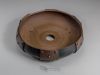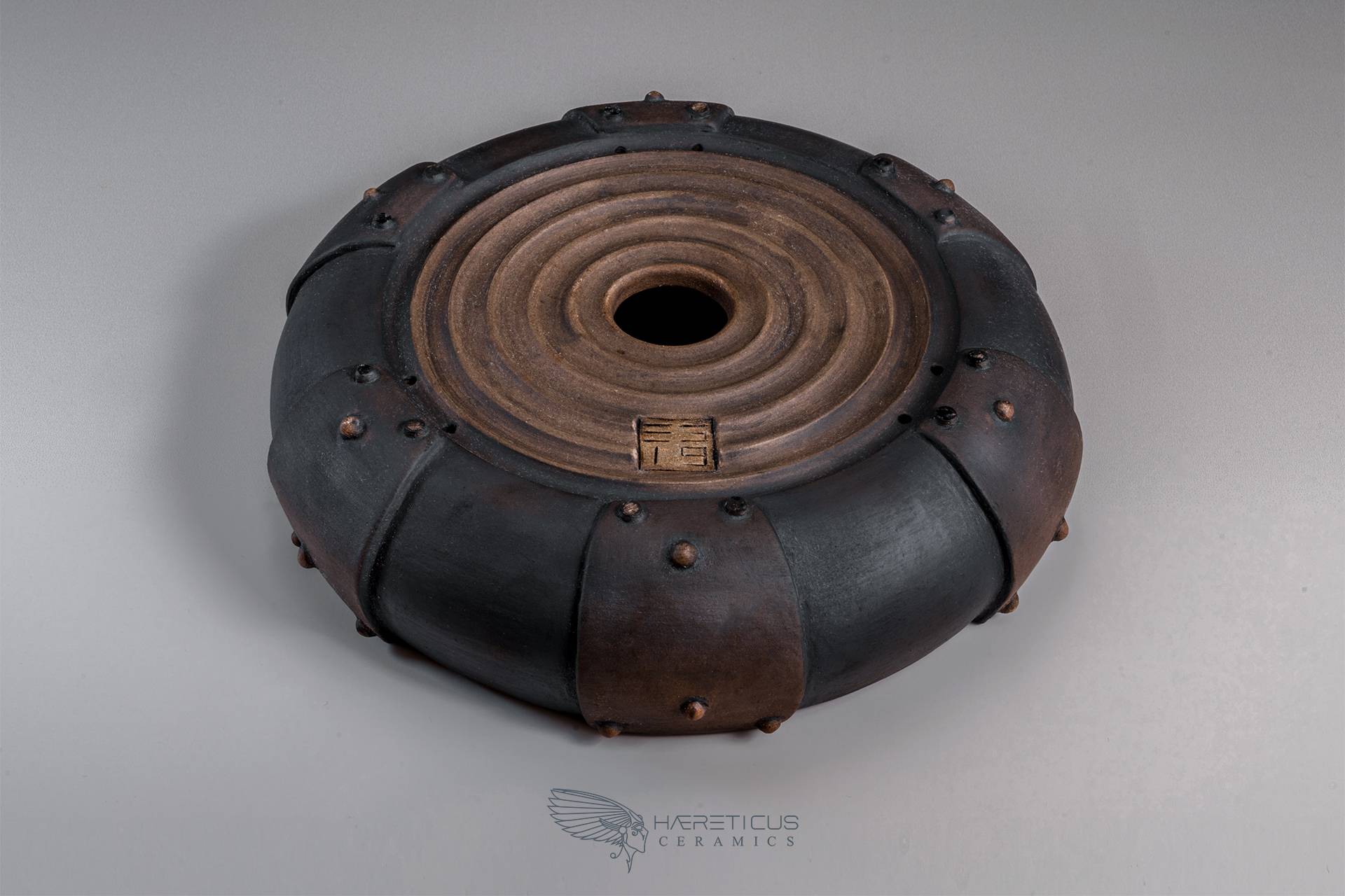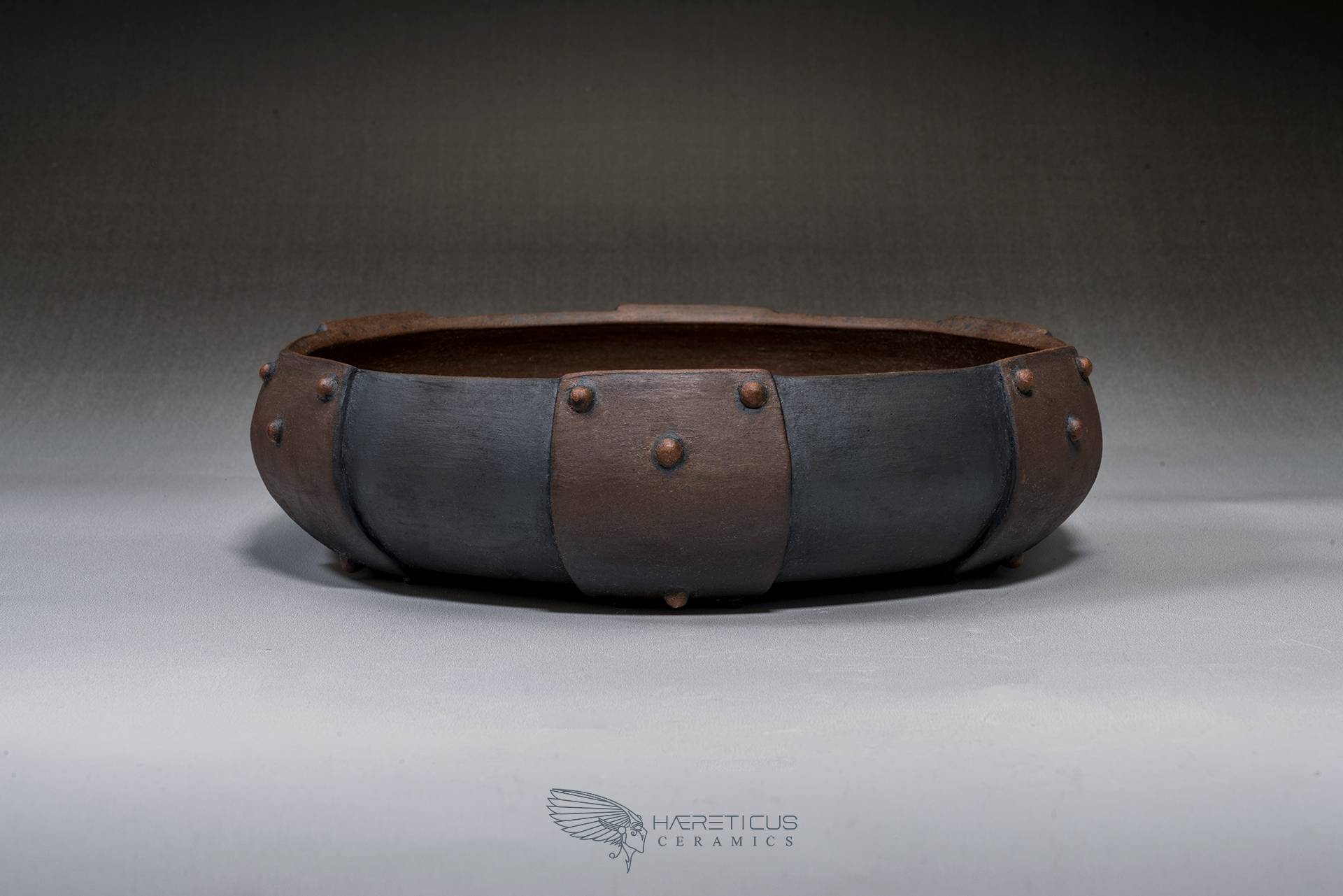 One of my first pots, the second from the "oddpot" series. It was made on a potter wheel, and then the raised parts and rivets were added. It was then coated with oxides and fired at 1270°C. EG - 2019 (Private collection)