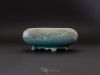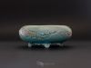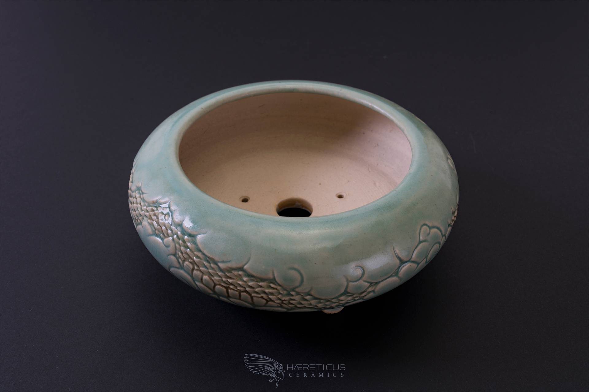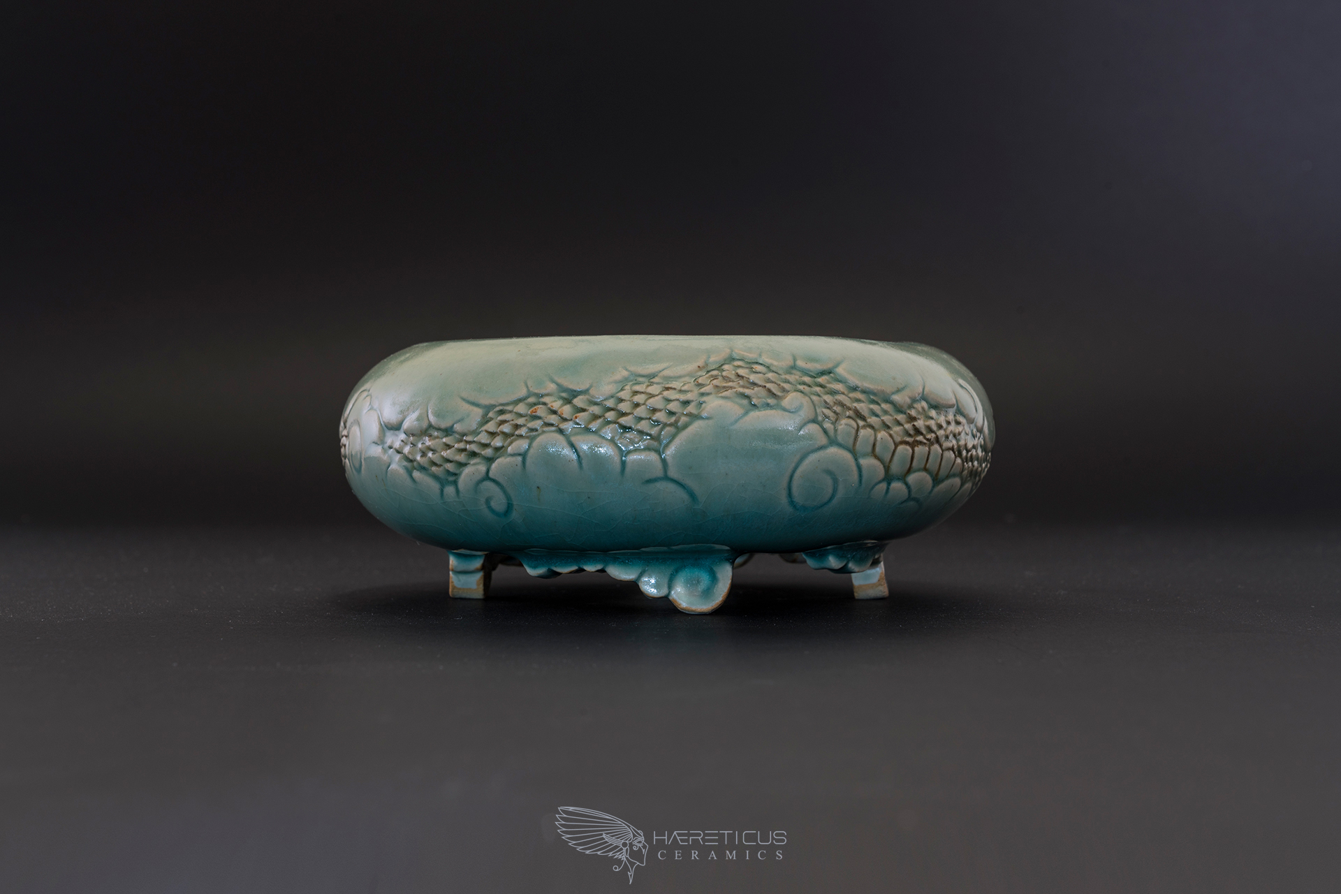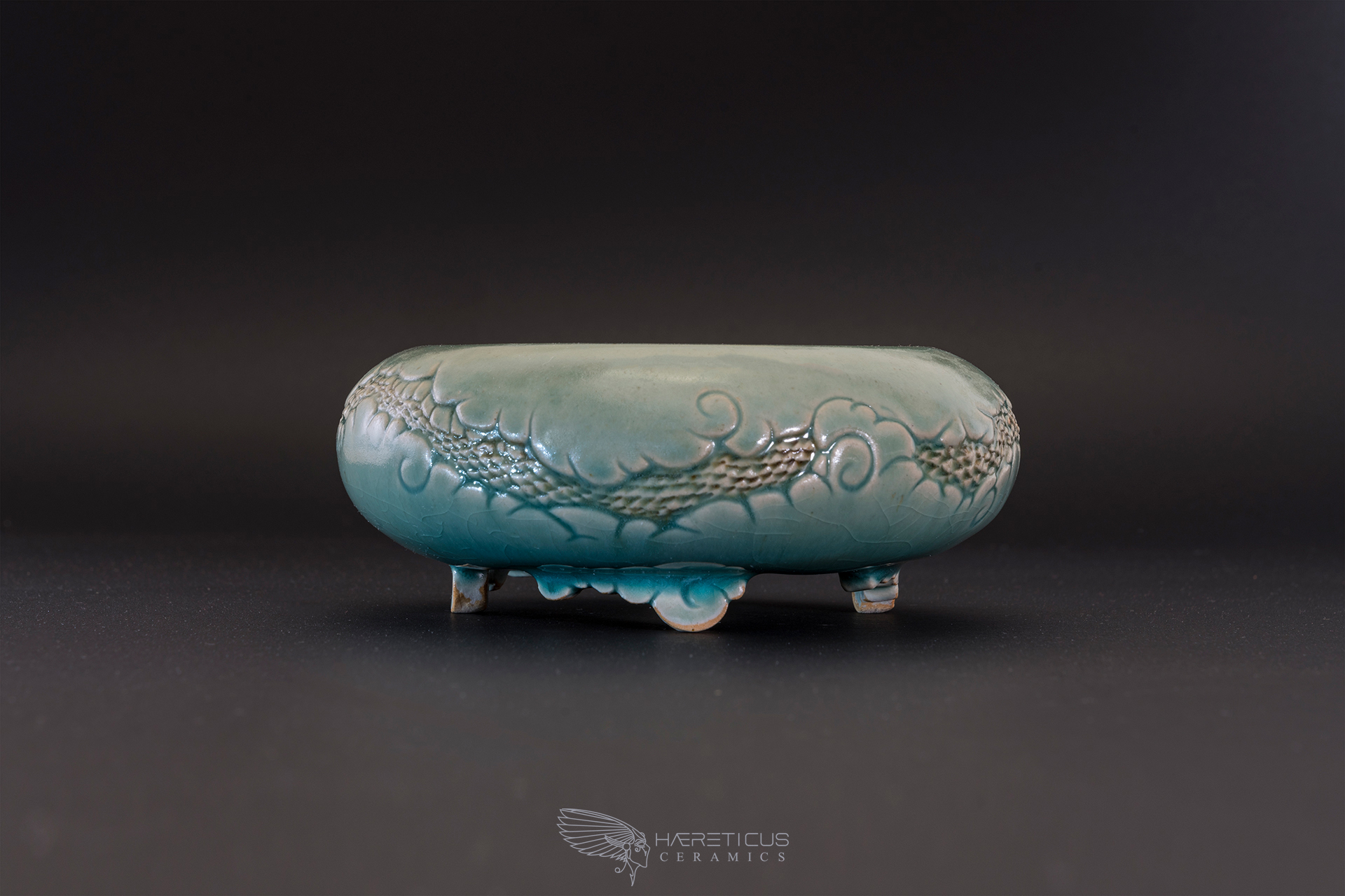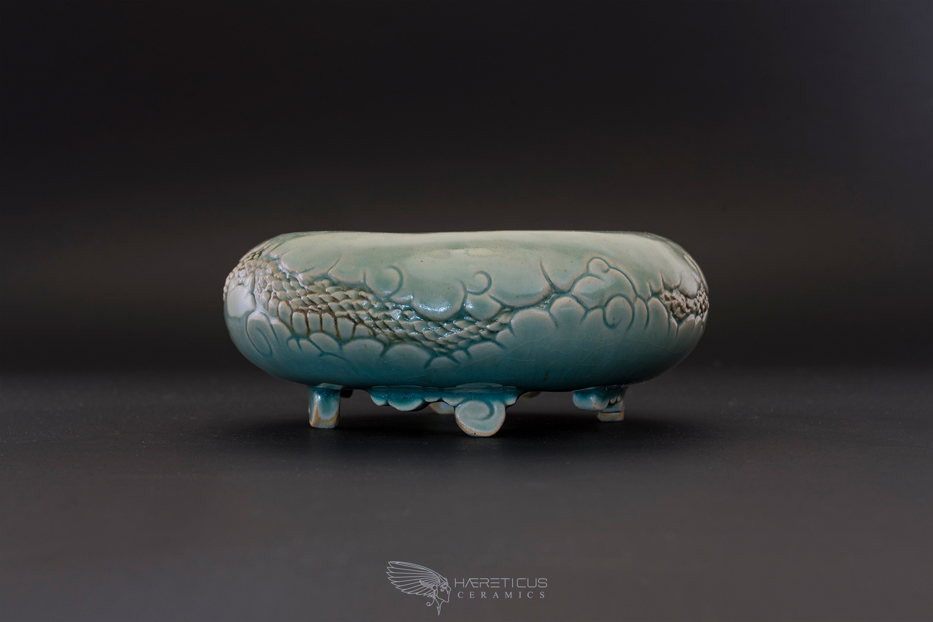 The pot, made of white stoneware, was made on the pottery-wheel and then hand-sculpted with clouds and a dragon crossing them. The four feet were also individually sculpted into the shape of clouds. It was then coated with a teal celadon glaze.