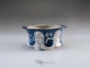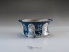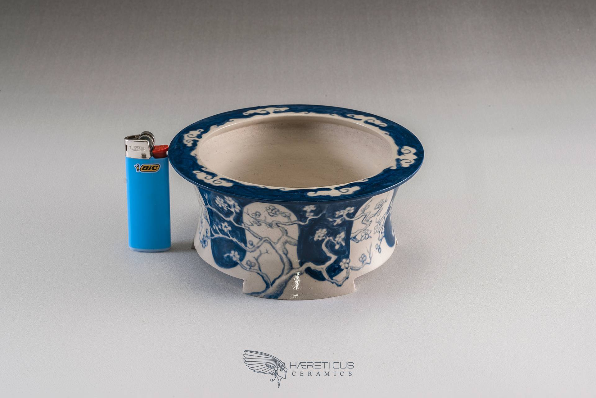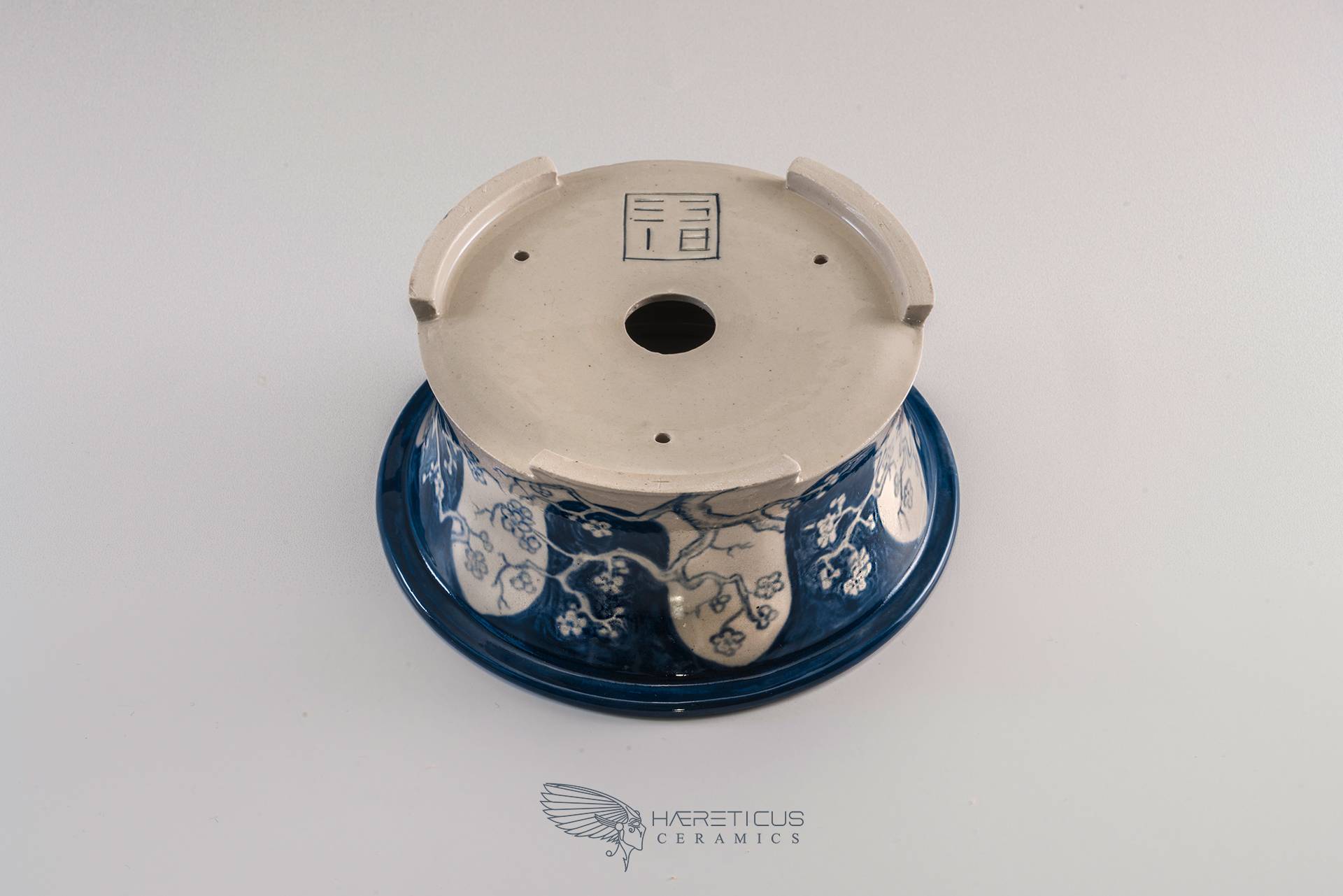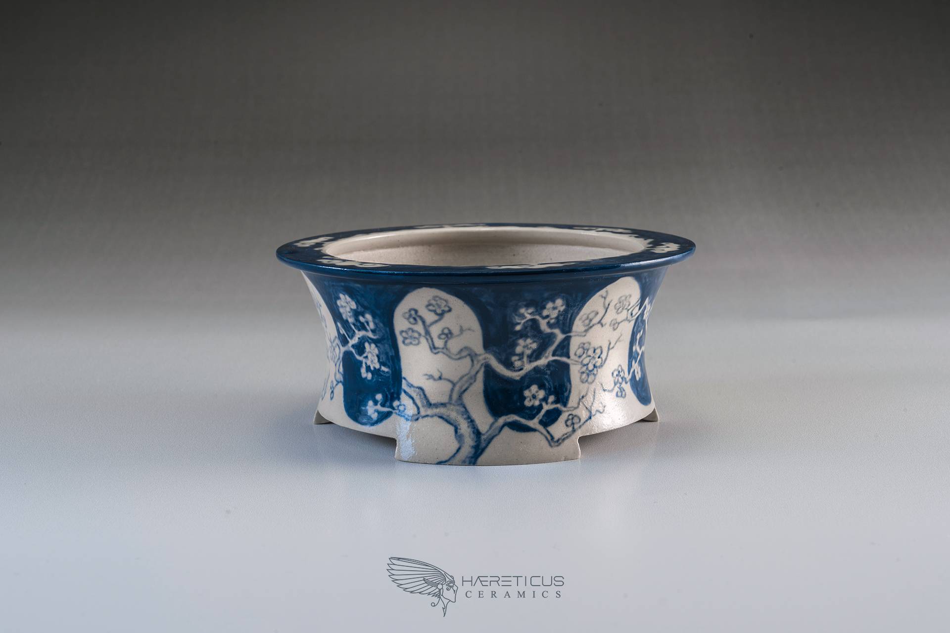 One of my first attempts at the sometsuke technique (blue cobalt gosu ink on withe clay-porcelain): a small stoneware pot for han-kengai or shitakusa. The wavy blue motif, inspired by the ancient Seto ware, is interspersed with three painted flowering trees