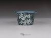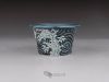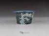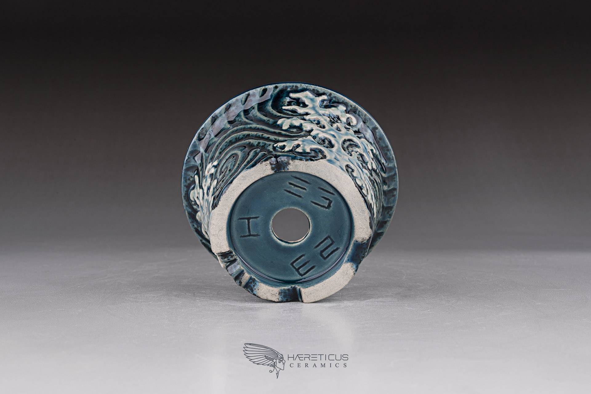 Small mame / shitakusa pot, hand-sculpted with a stormy wave motif. Each of the three waves is directed differently to better match the movement of the plant. Glazed with celadon glazes that highlight the textures and depth.