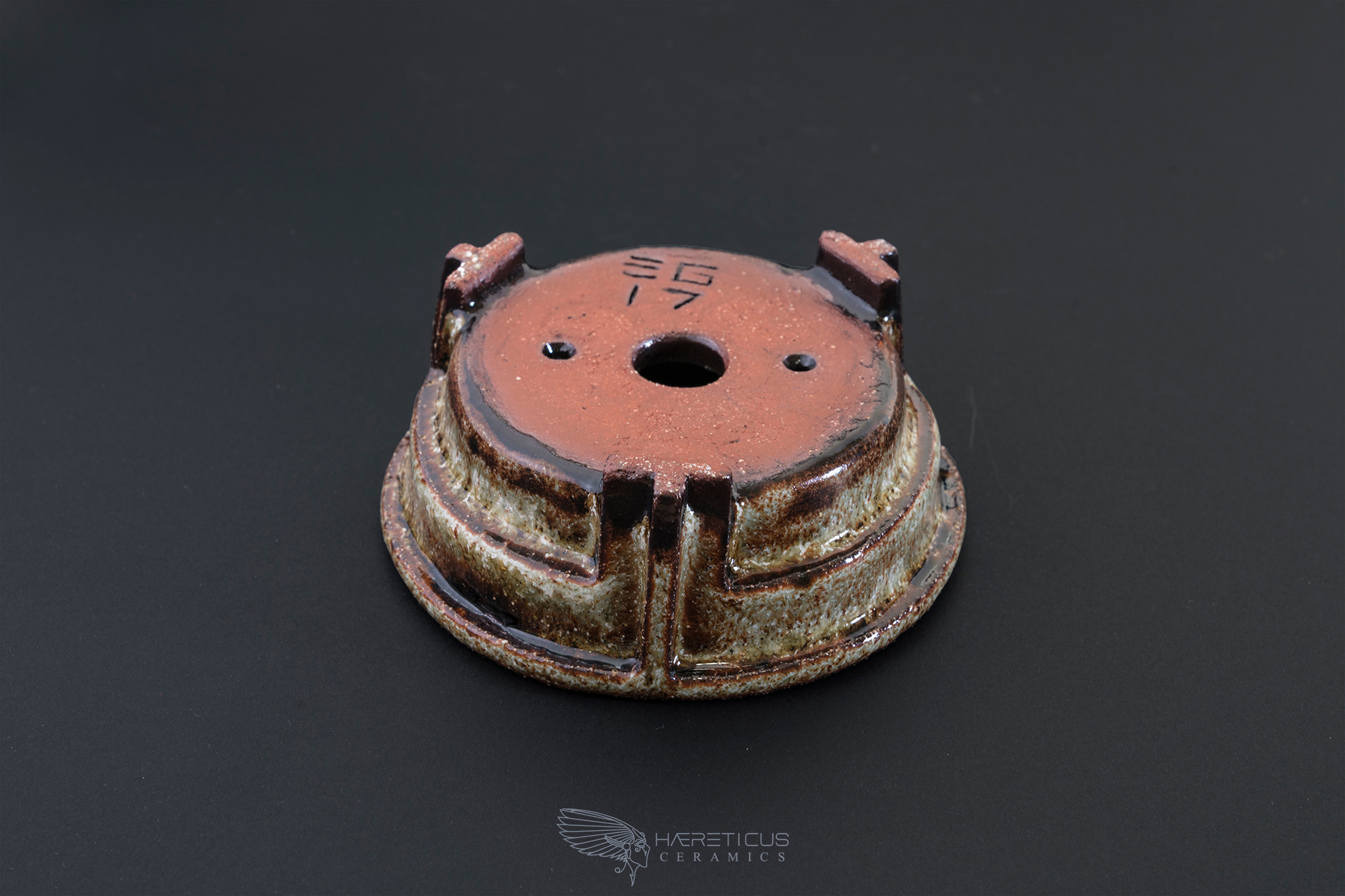 The pot is made of brown stoneware and fired at 1230C. It is coated with a variegated glaze in earthy tones. Ideal for mame bonsai or shitakusa (companion plants). EG - 2017