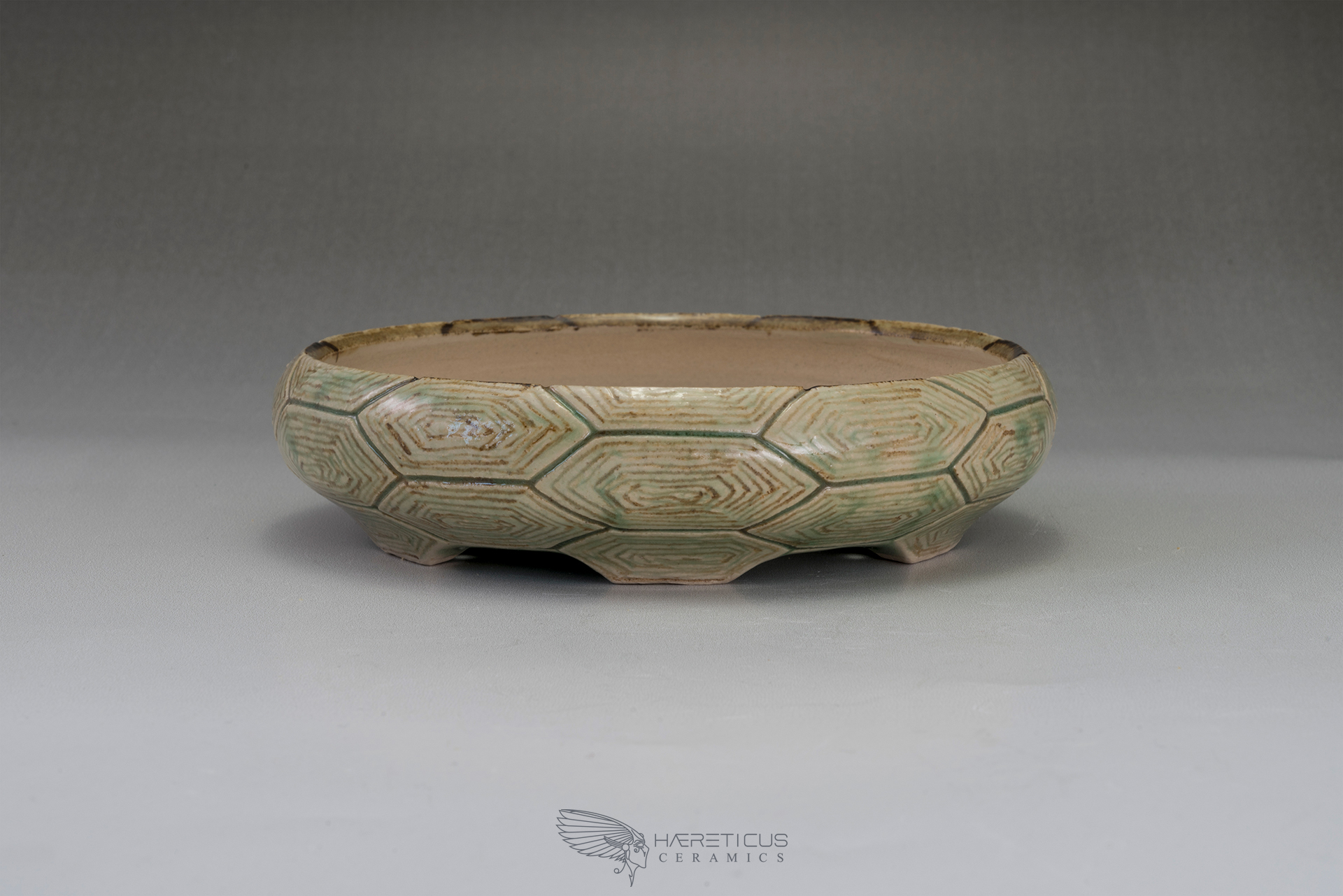 Round pot with a hand-engraved texture reminiscent of a turtle's shell. The wheel-turned pot is then engraved with precise measurements and proportions, drawing lines that form the hexagons. These are then hollowed out to reveal the plates that form the shell. The pot is then painted with ferrous oxides and coated with a celadon glaze that highlights the texture.