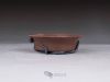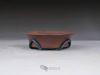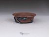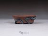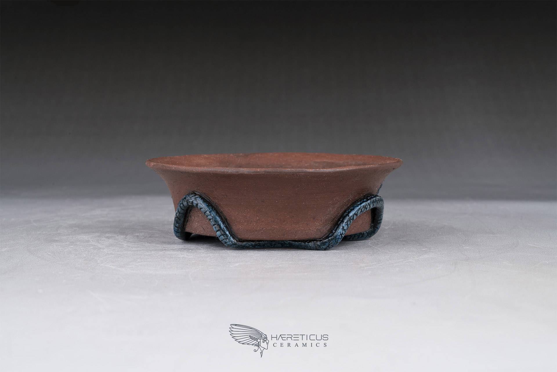 This round unglazed mame pot has been decorated with a hand-carved and glazed snake that encircles the bottom and sides, also serving as the pot's feet. EG - 2025