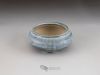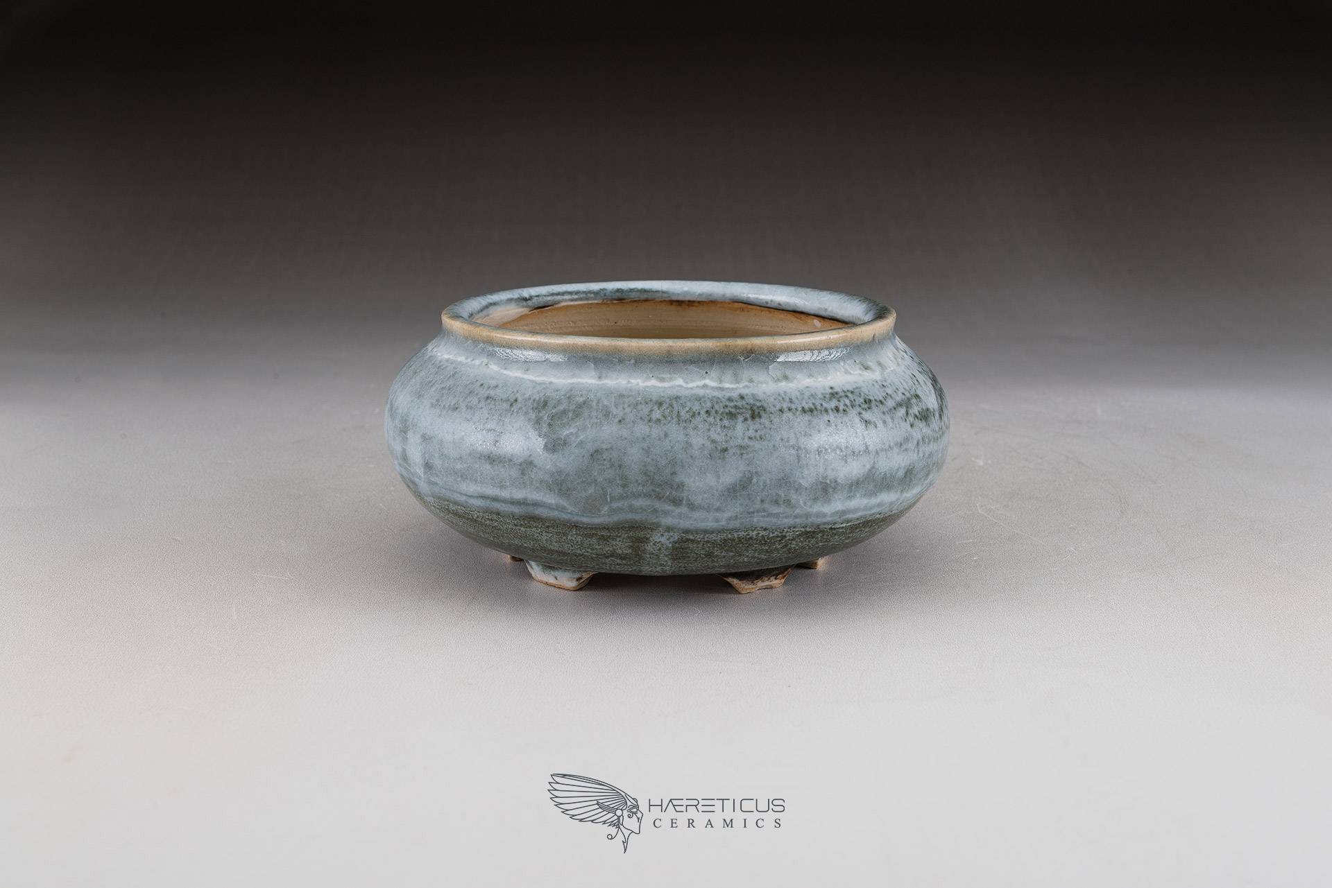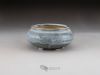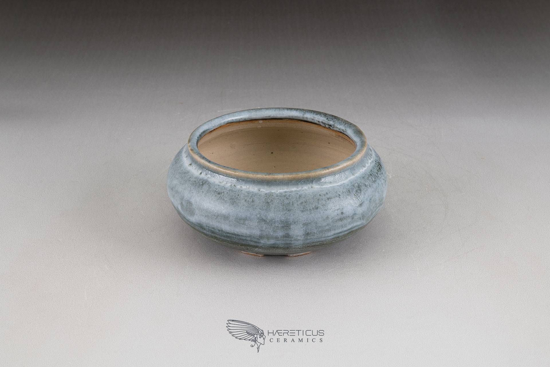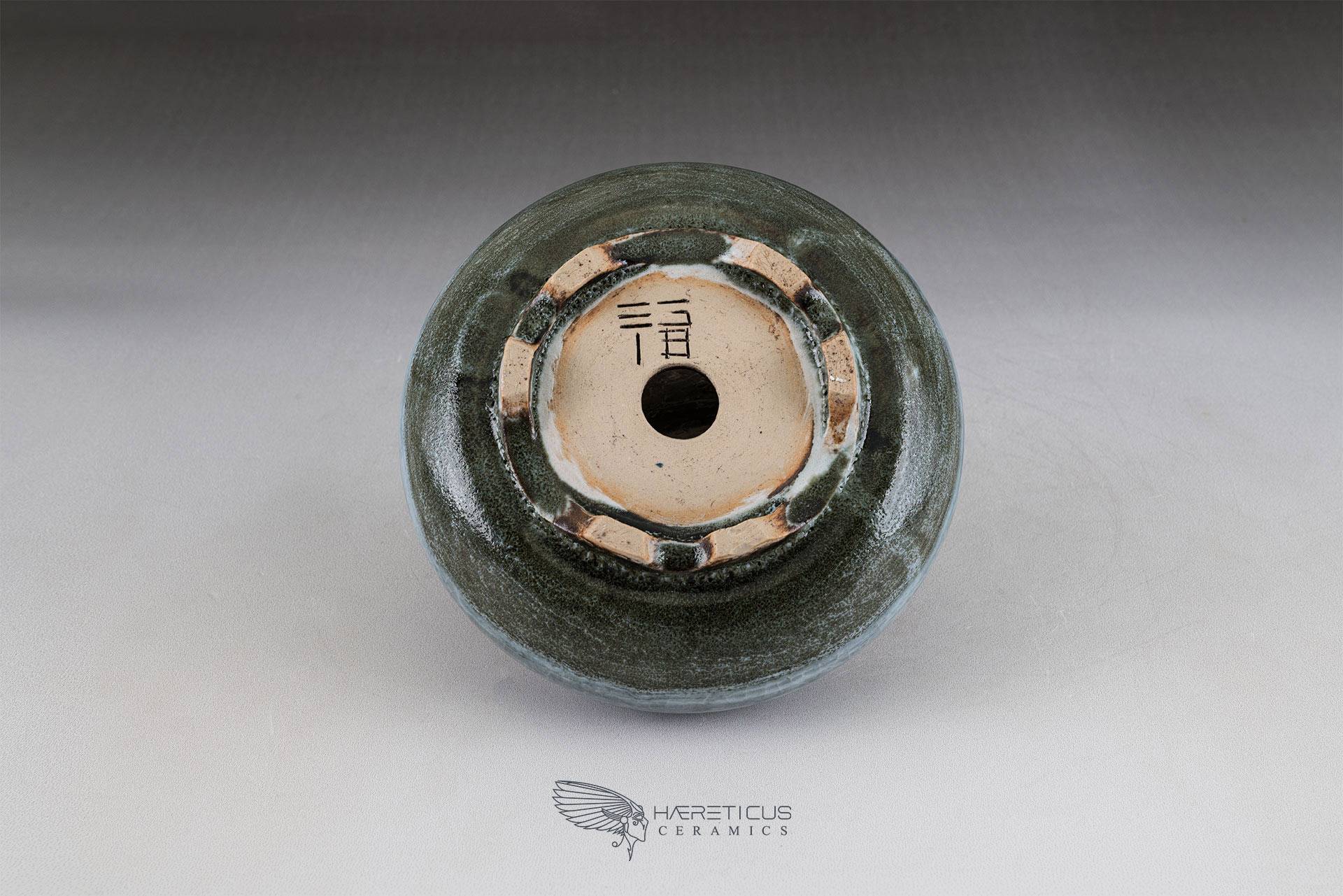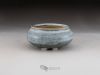 Small shitakusa pot, coated with two different glazes: a forest green oribe base overlaid with a semi-gloss white with light blue highlights. EG - 2018