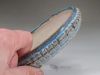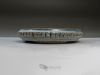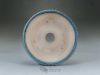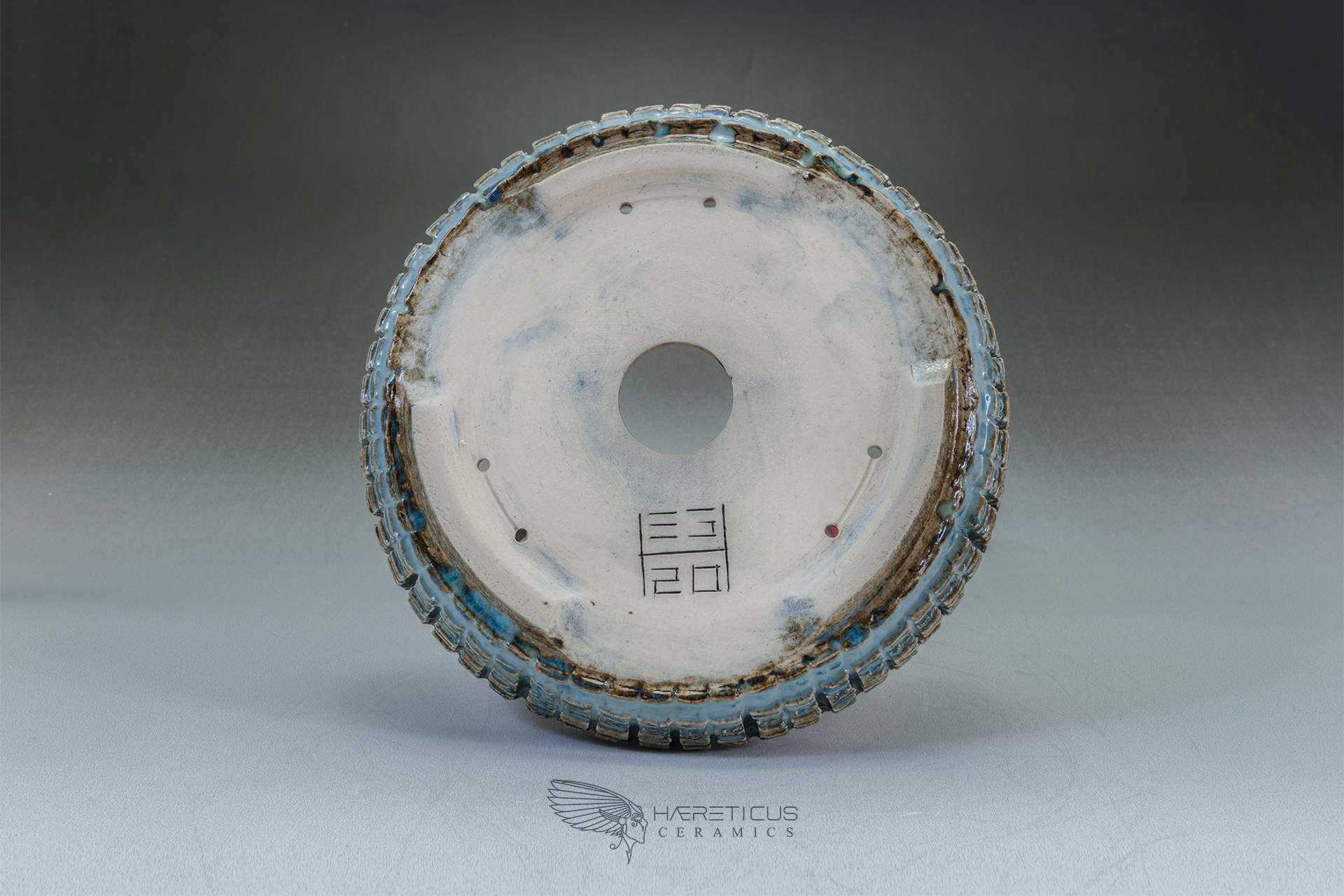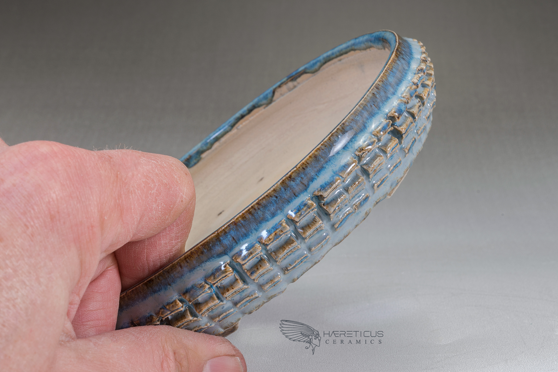 Shallow round shohin pot with a raised texture along the circumference. The light blue glossy glaze breaks up the texture, creating orange-brown tones.