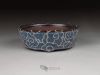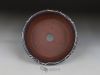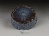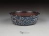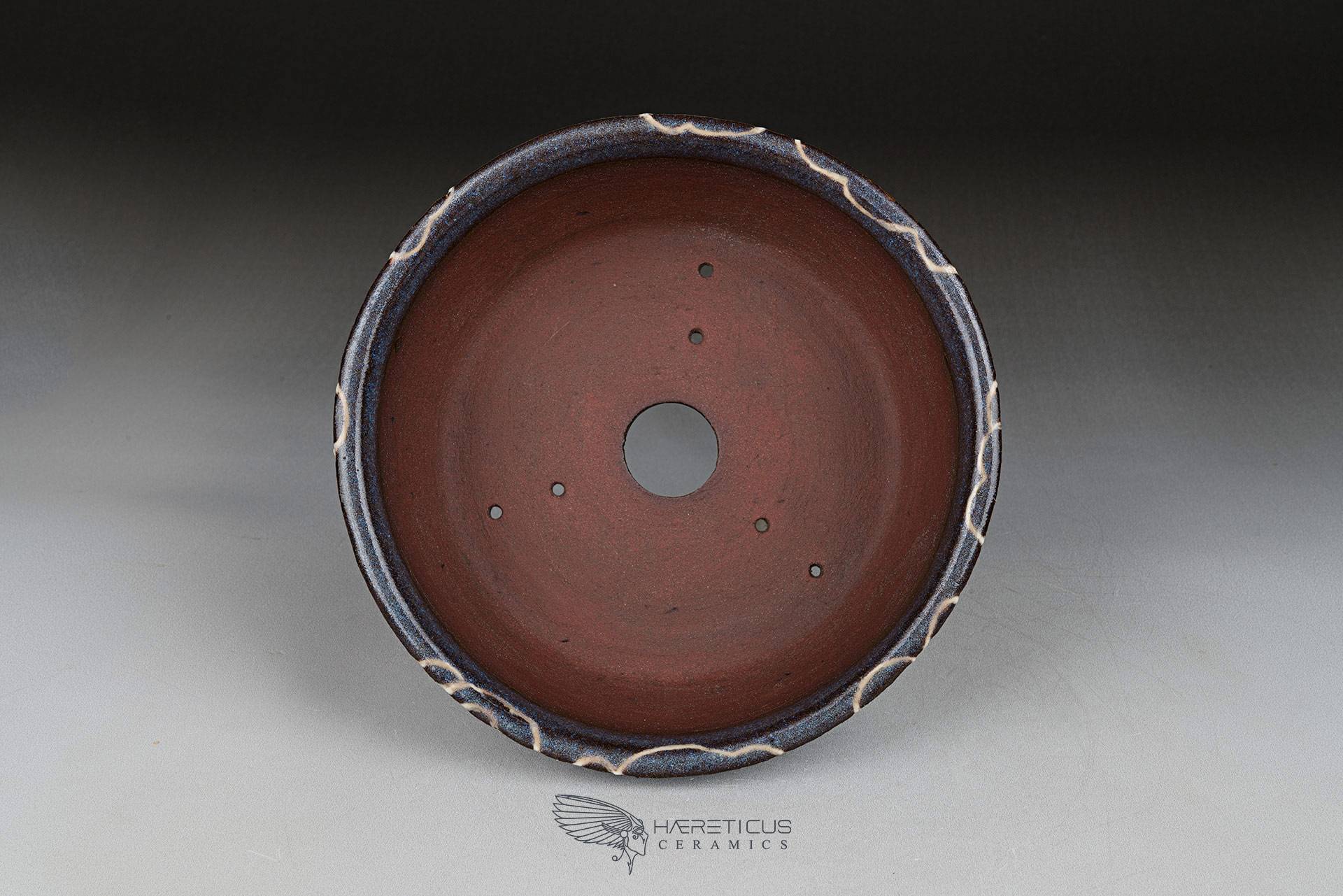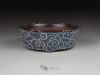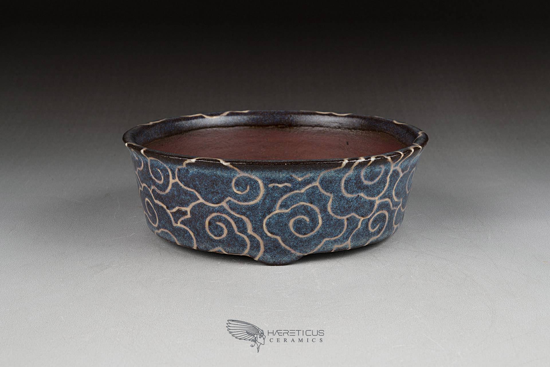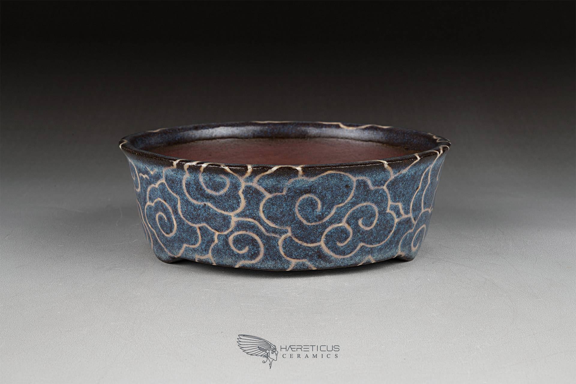 Stoneware pot with clouds engraved using the Mishima technique (engraving a design into clay, filling it with a contrasting engobe, and then removing the excess, leaving the color embedded in the engravings). This glaze reacts with the color of the clay it covers, so it turns blue on red clay and silvery white on light clay. Having been fired at just under 1300°C (2,372°F), it has undergone slight deformation, so when viewed straight from above, it is not perfectly round.