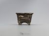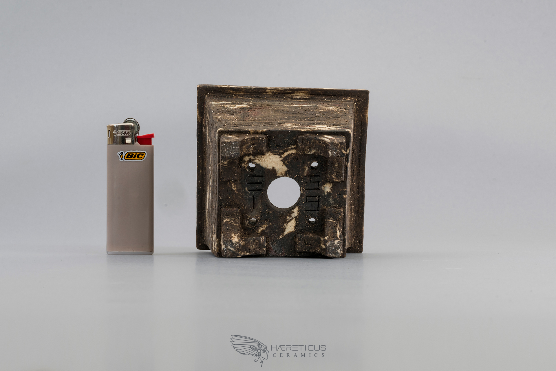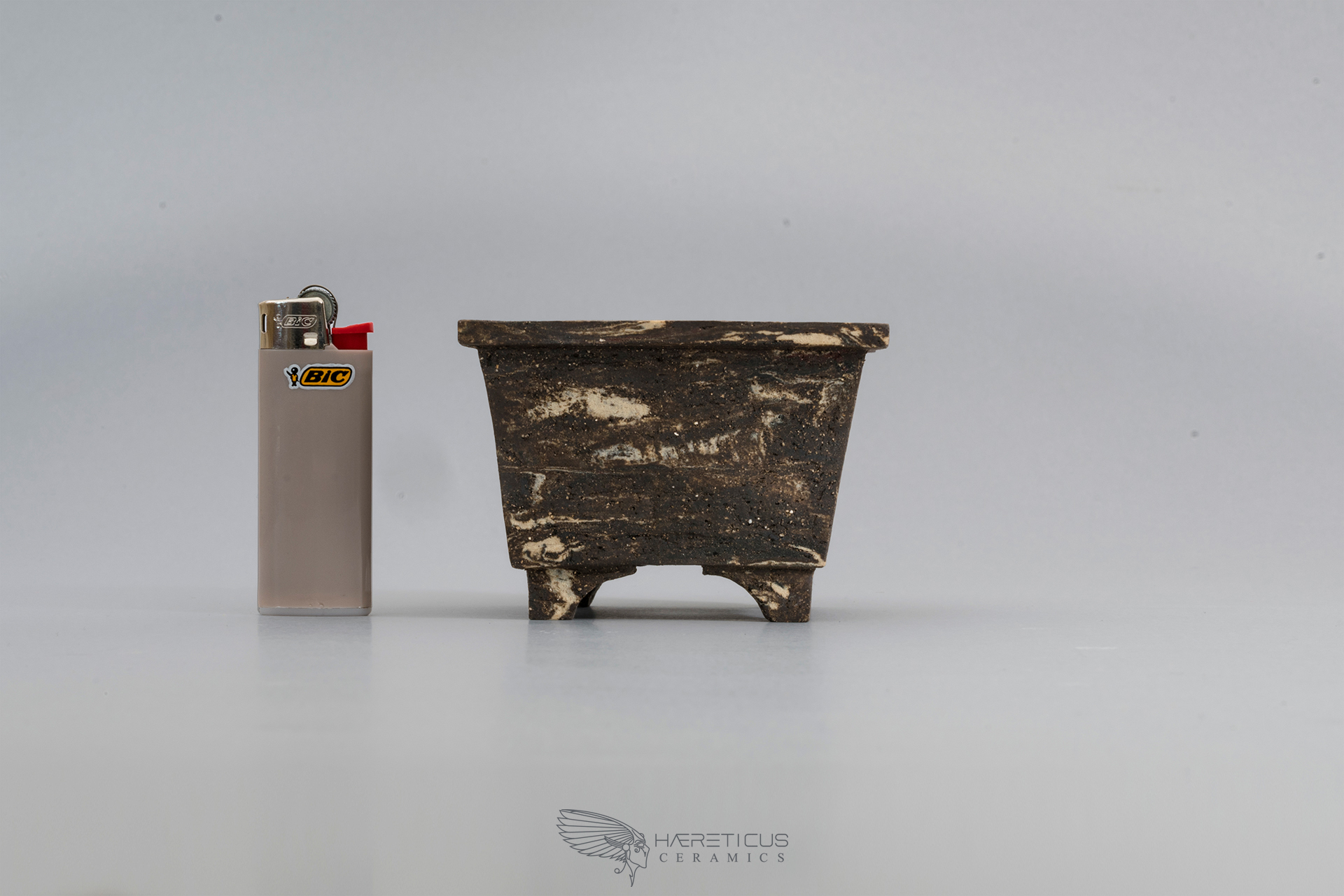 This square unglazed pot, constructed using the neriage technique (two or more clays of different colors mixed to create a marbled effect), was carved from a single block of clay (kurinuki technique). Ideal for a semi-cascade-style mame bonsai or for a shitakusa.
