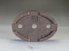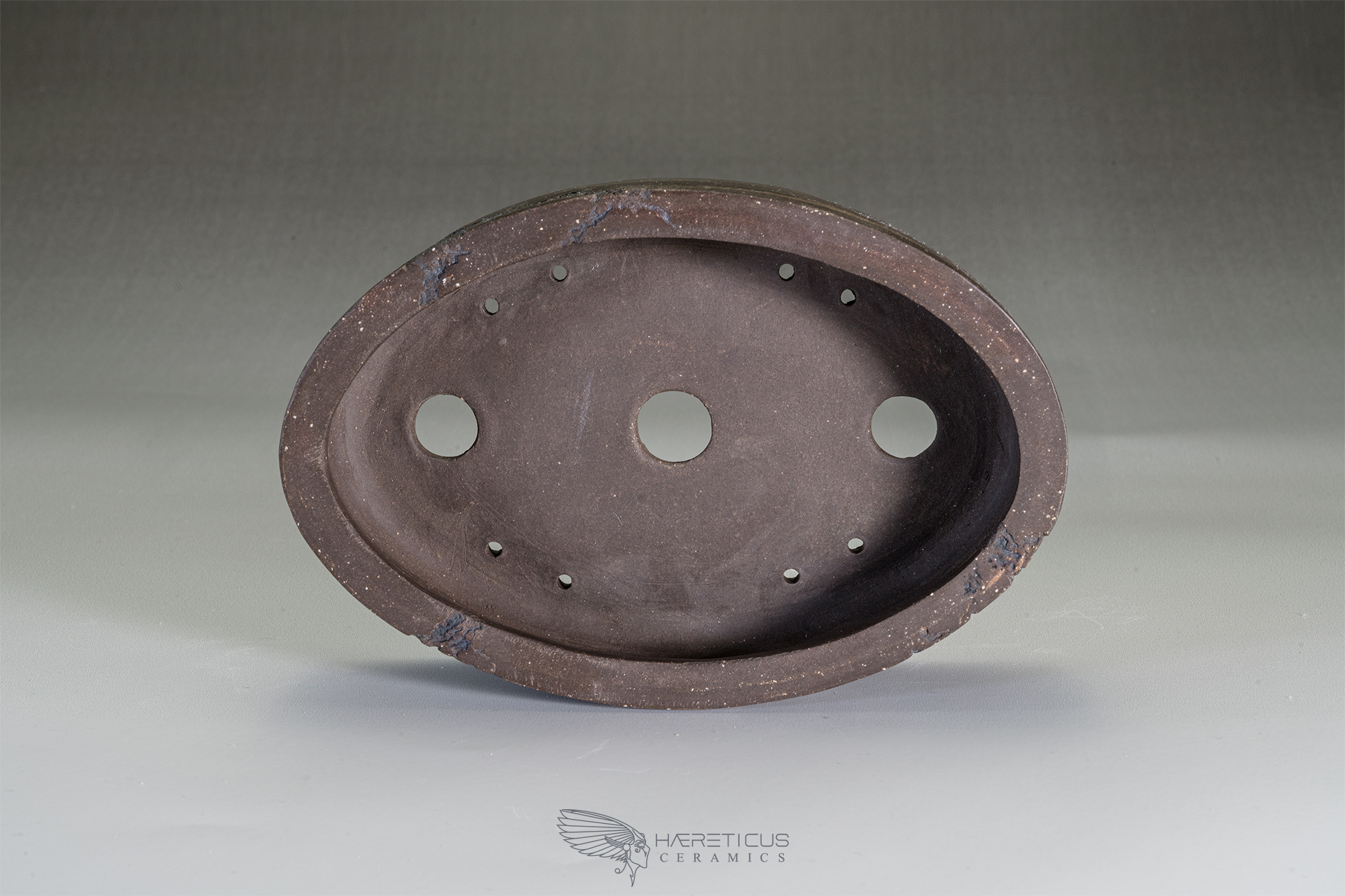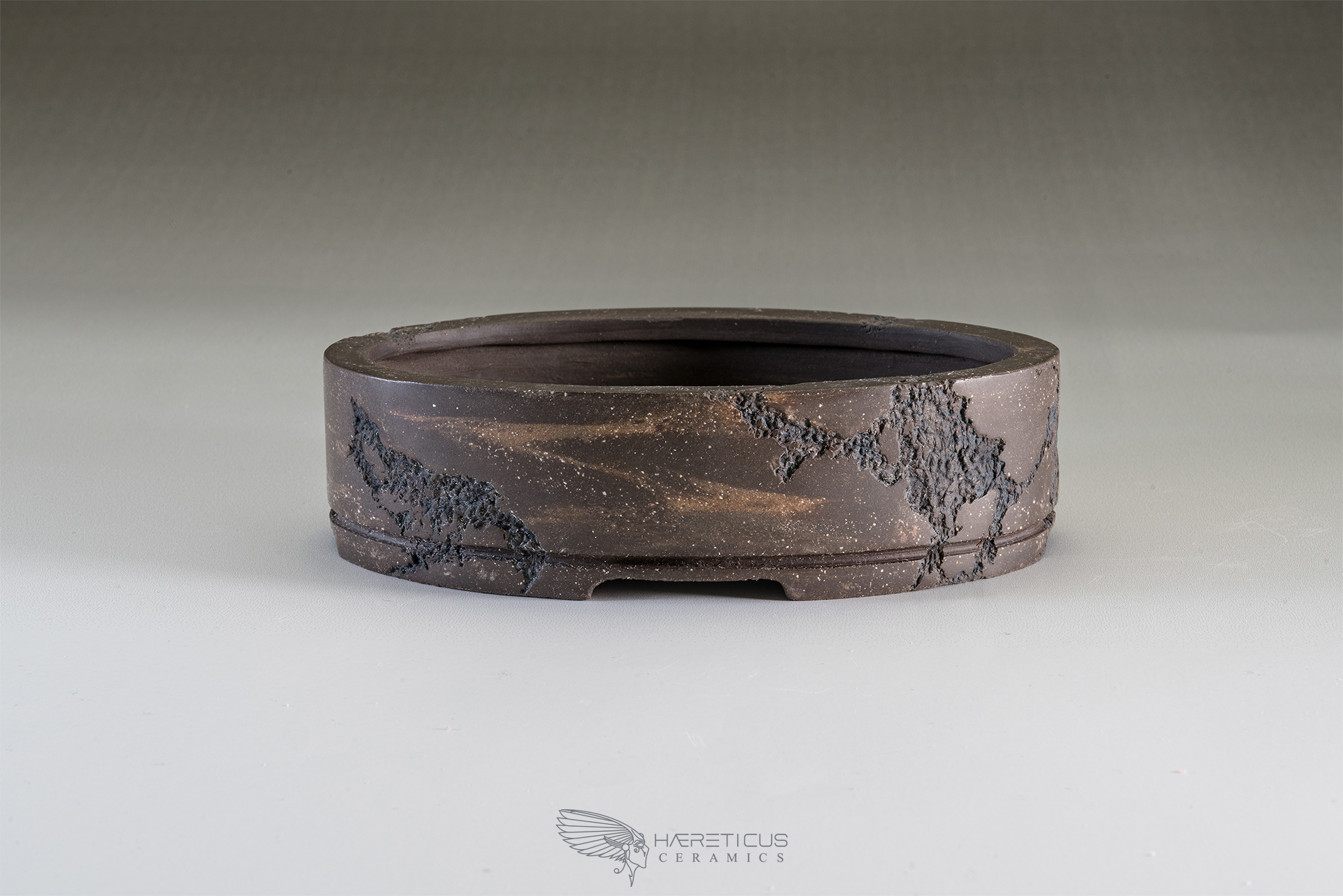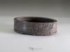 This little oval unglazed pot, carved with the Mushikui technique (worms eaten), has stright walls and 4 large shallow feet. The dark brown clay with hints of reddish colors was burnished to take a quite shiny satin appearence. On one side the carving was made leaving a part in the shape of the Japan map.