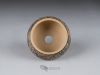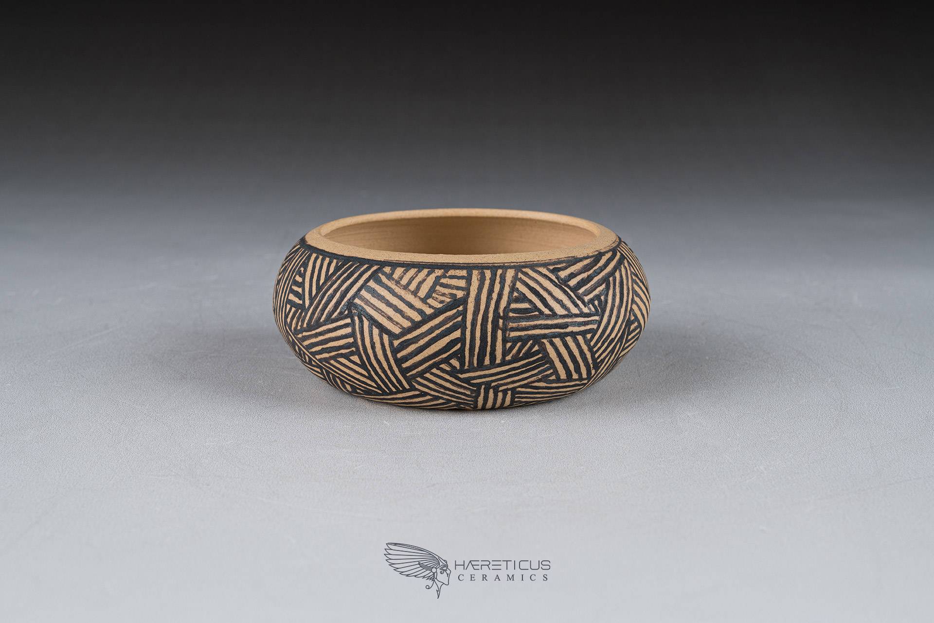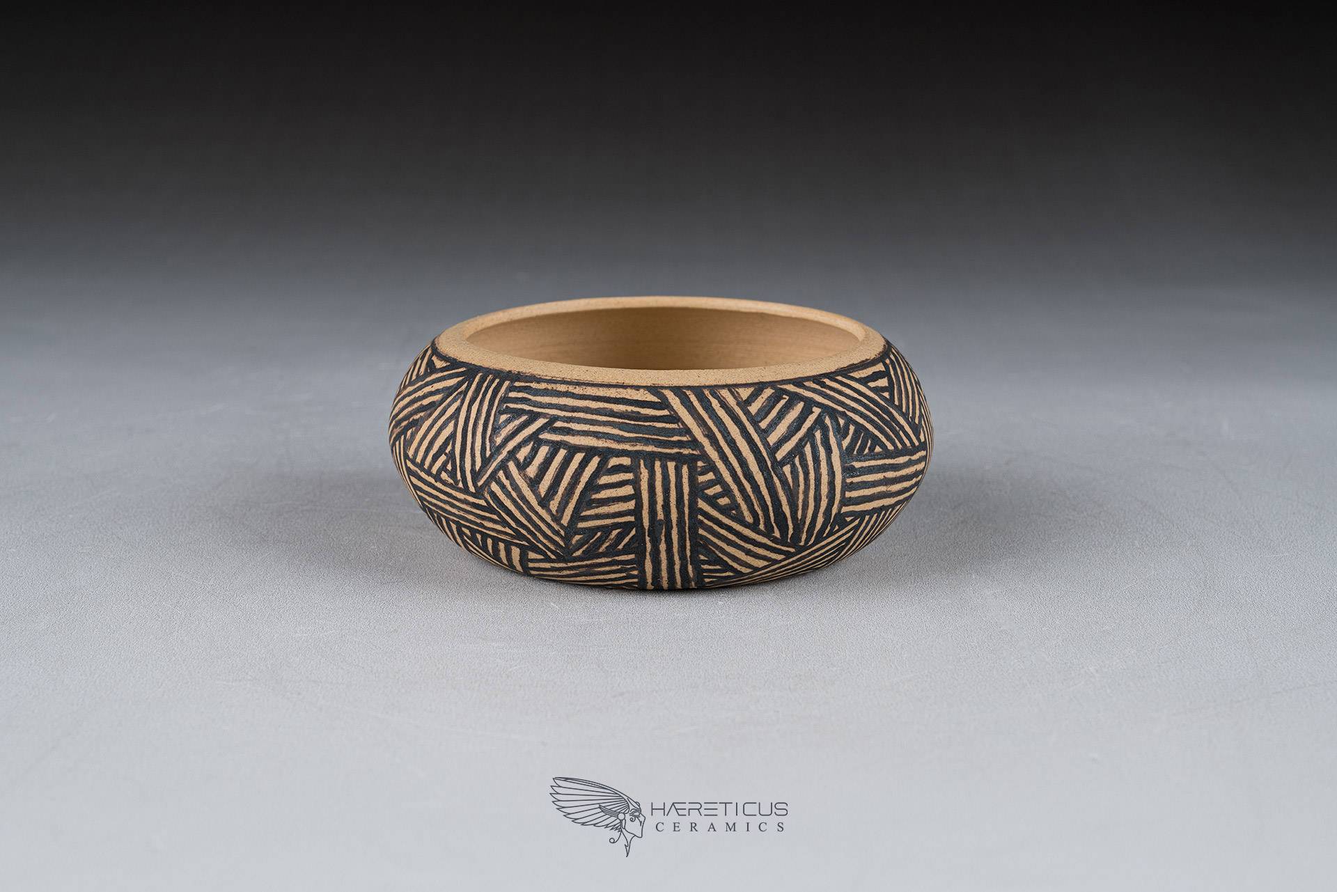 I wanted to create a more rustic, somewhat worn style for basket pots, and this idea gave rise to this pattern. The weaves are random, not ordered, creating a less geometric and static look. Painted with black iron oxides on sand-colored stoneware.