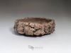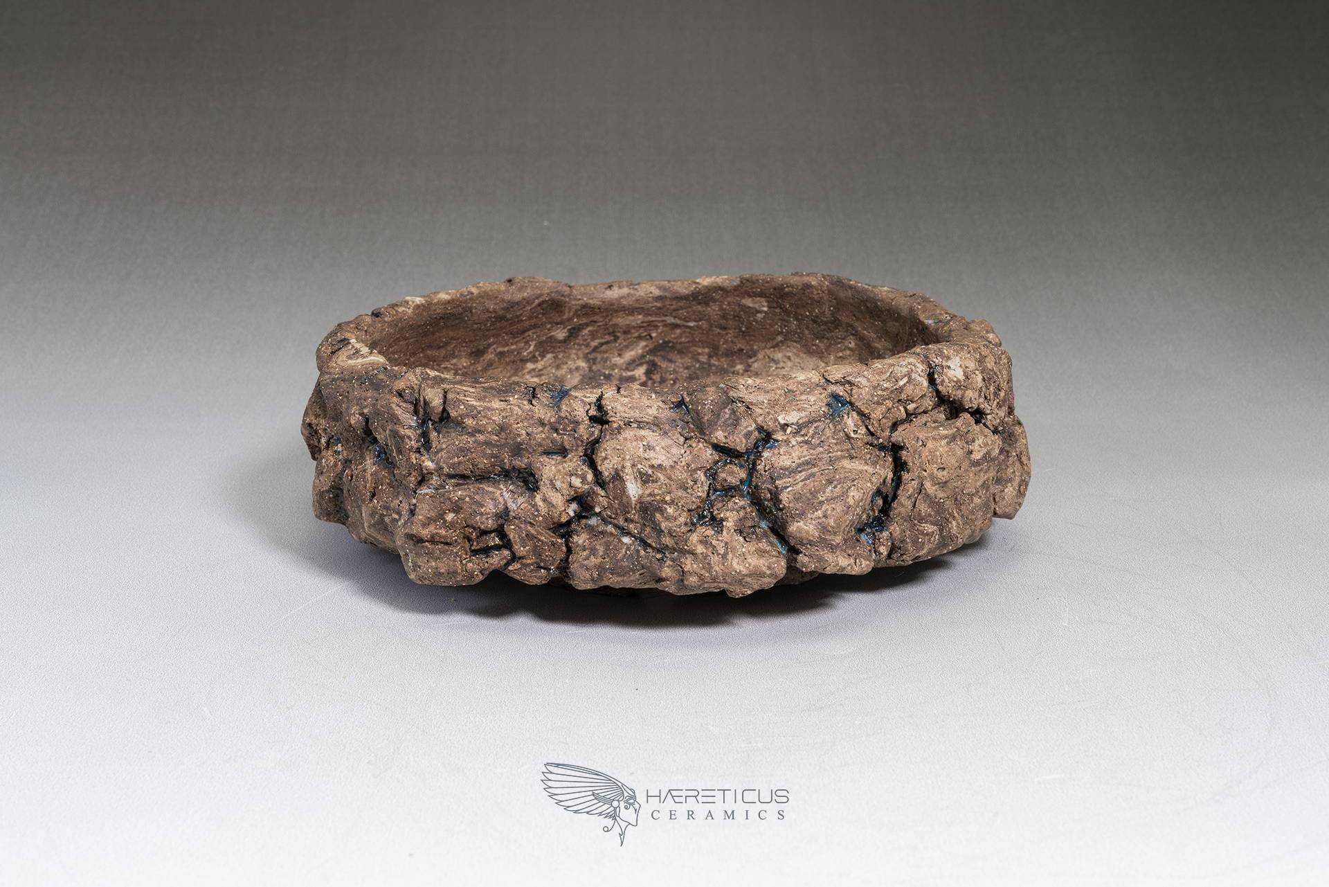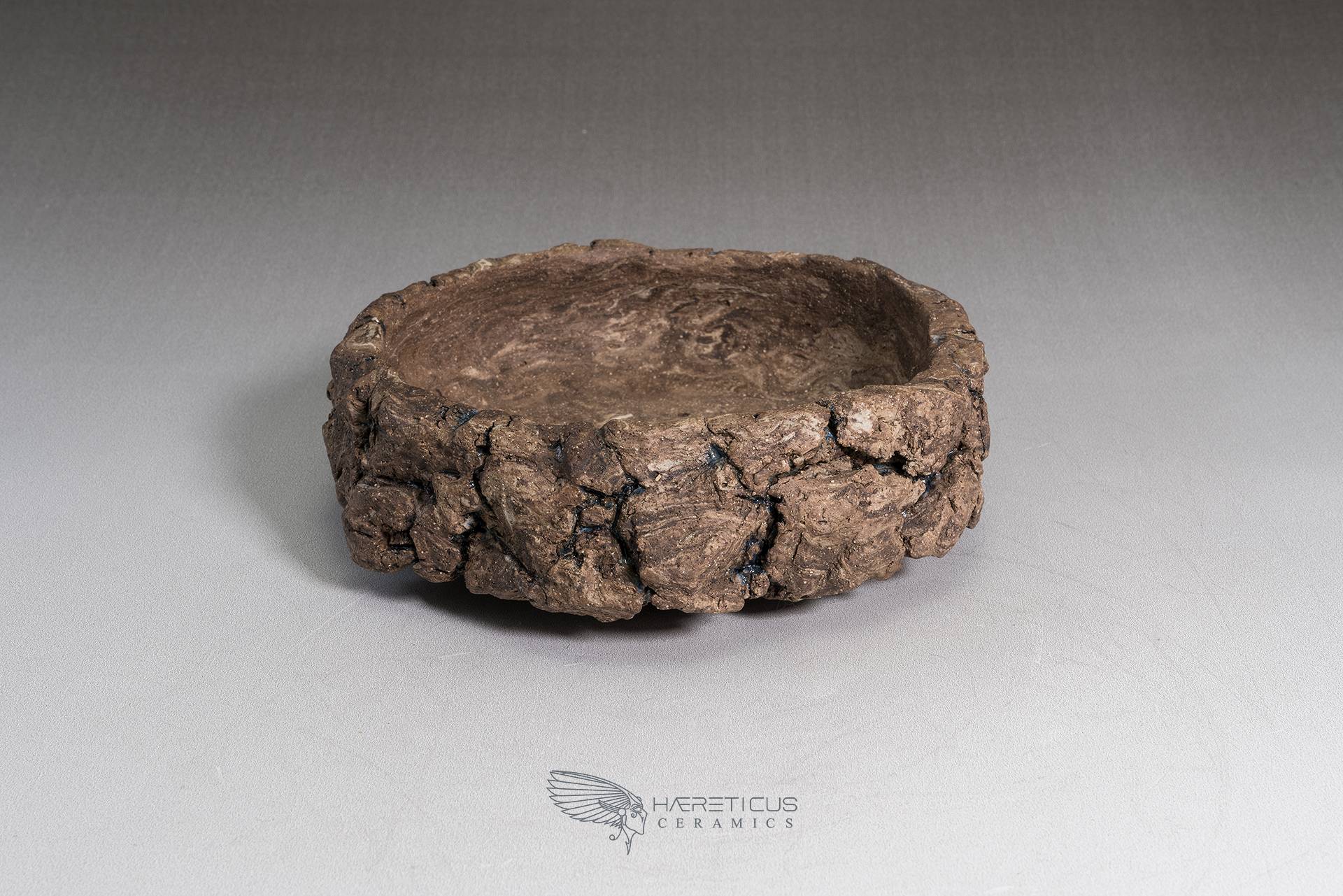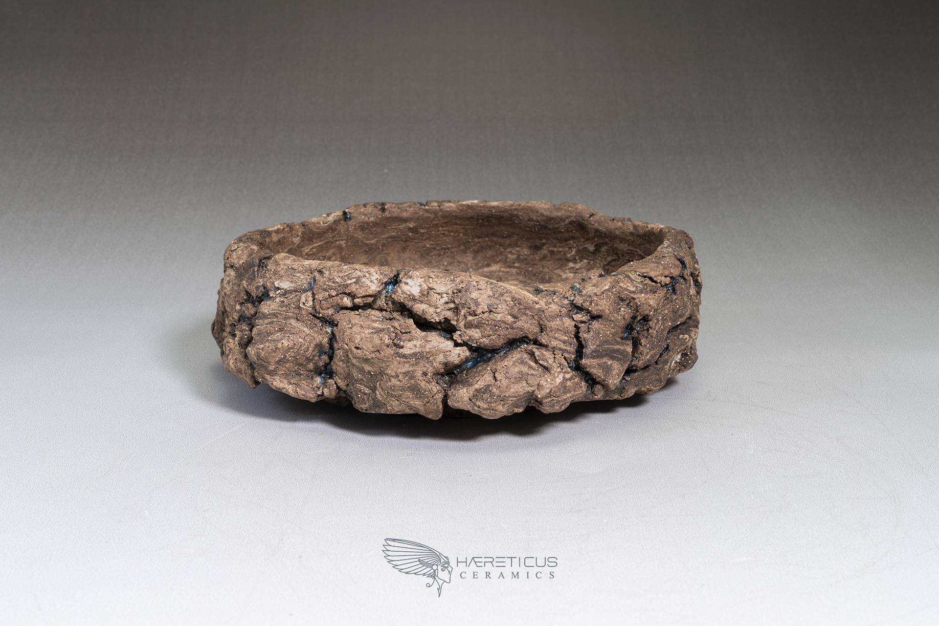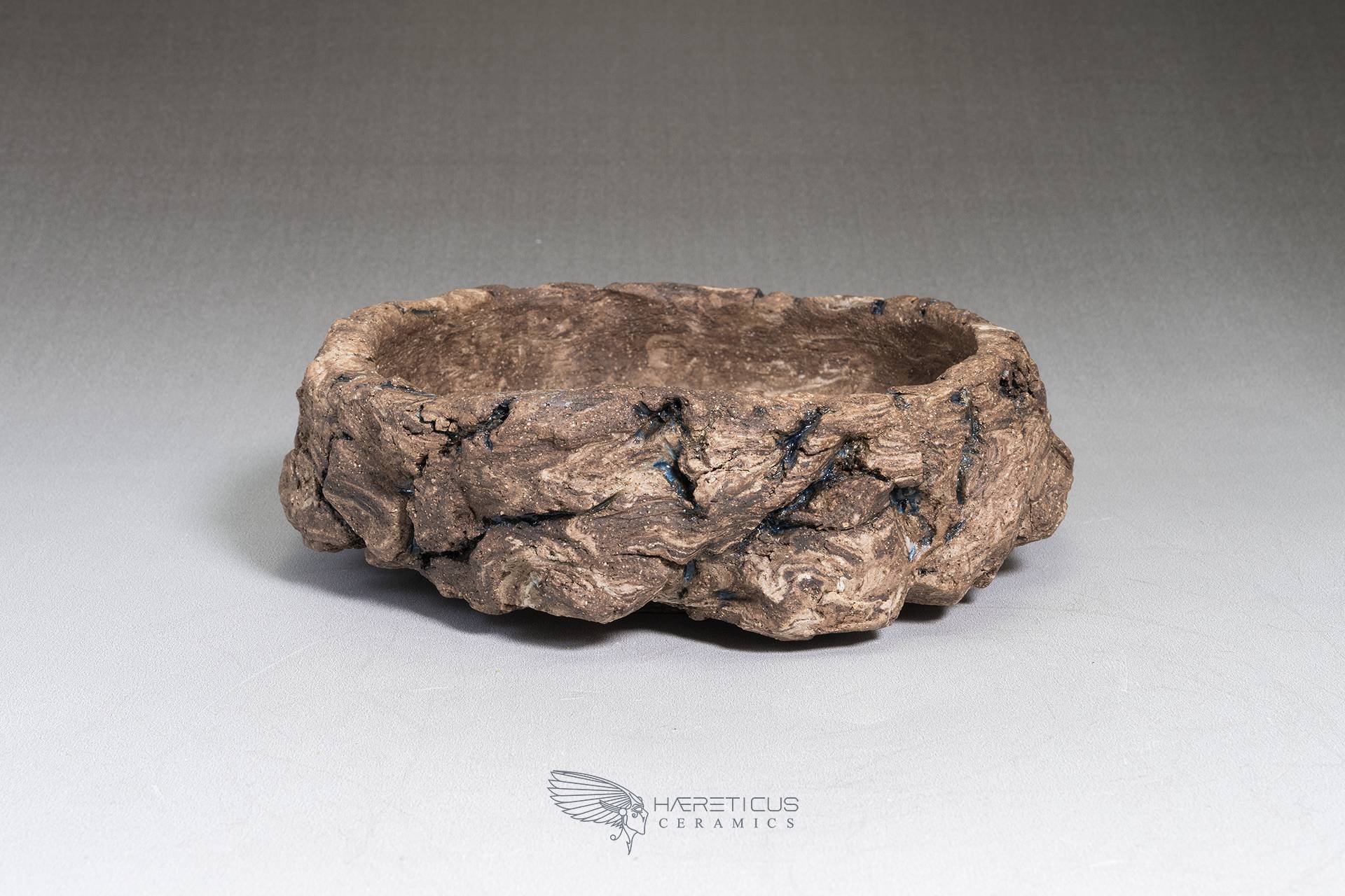 The pot was carved entirely from a single block of clays of different colors (kurinuki - neriage). A transparent glaze with bluish hues was then applied to the cracks and crevices to emulate water trickling down a rock.