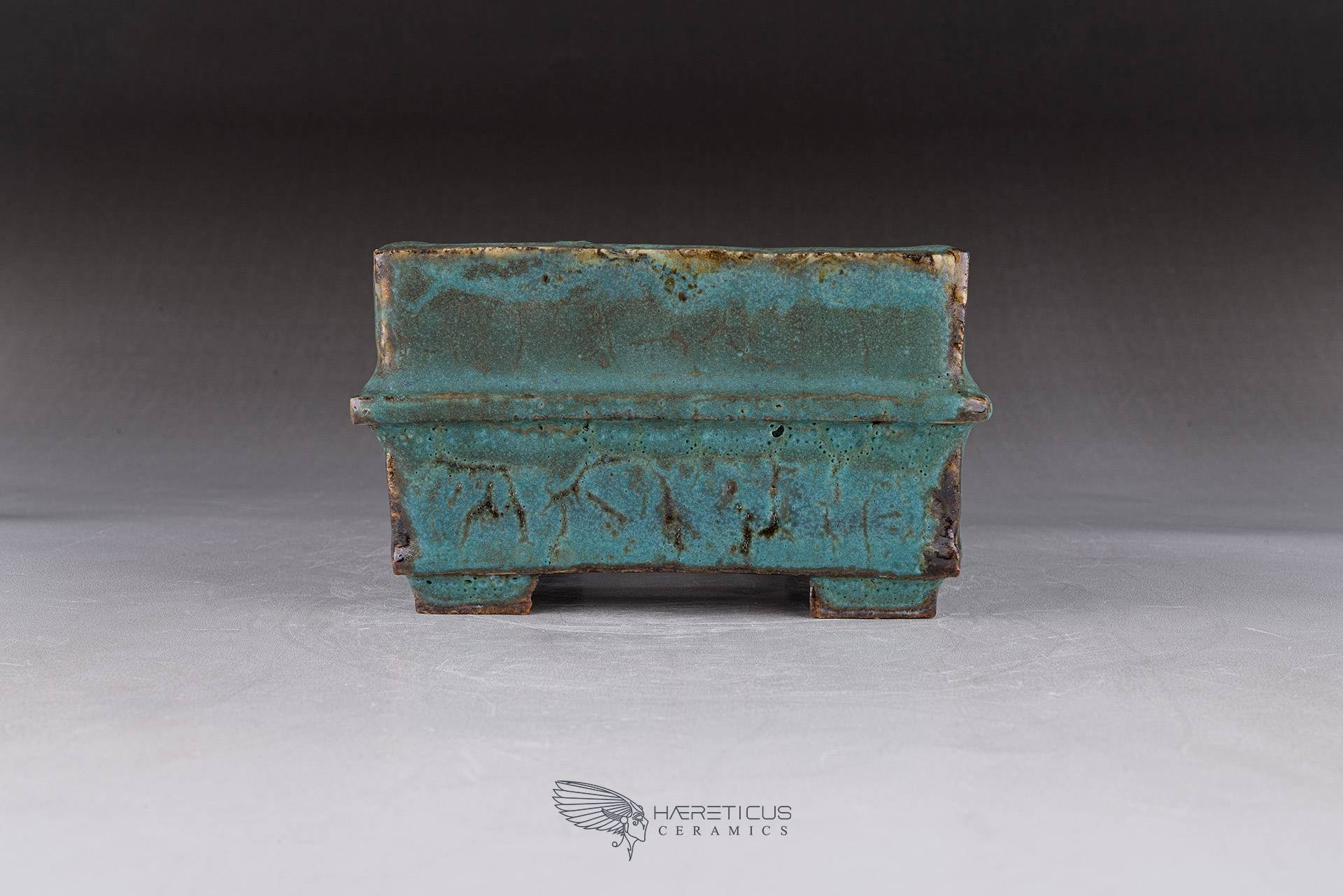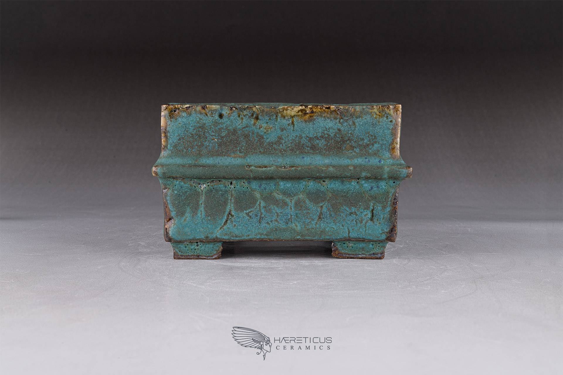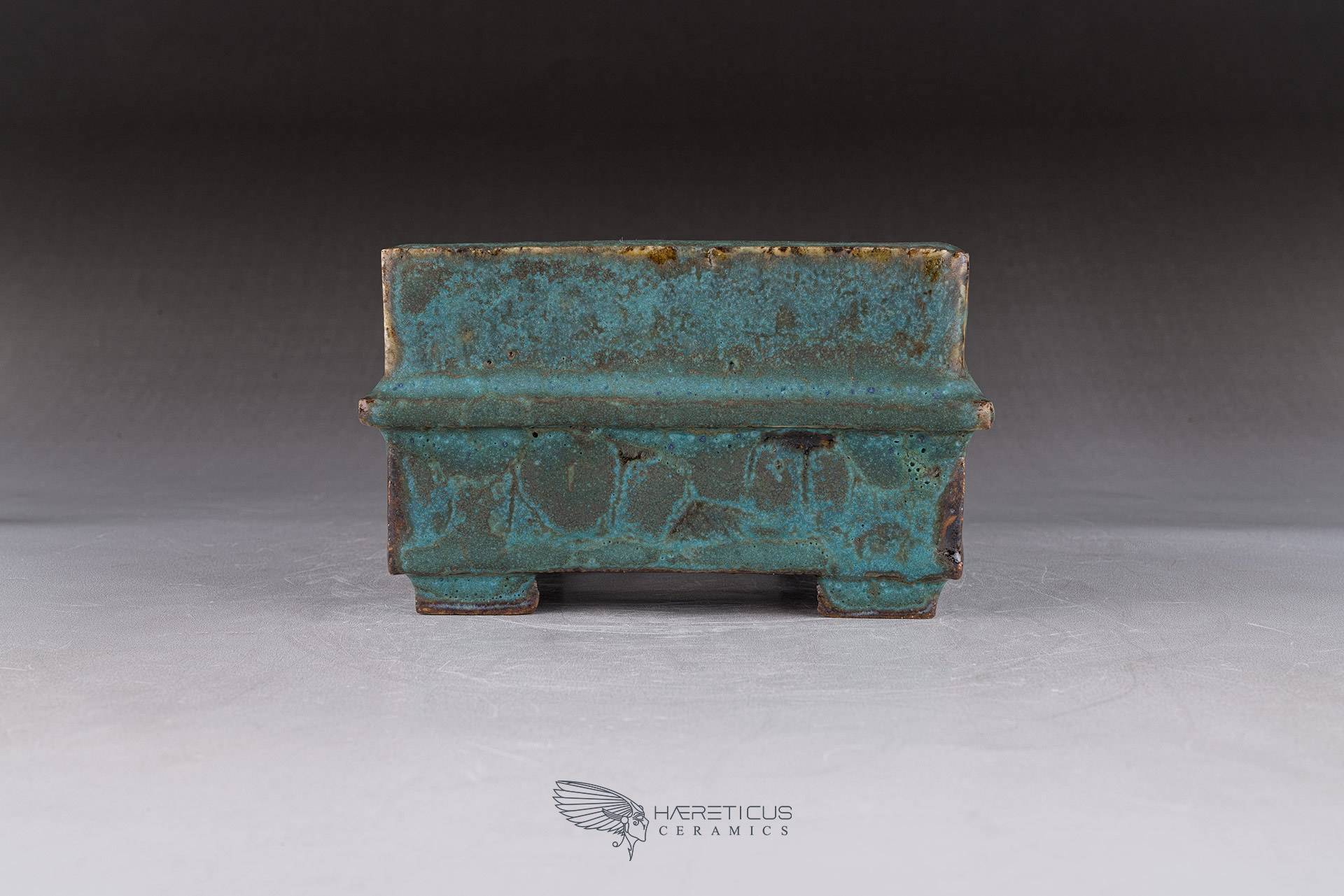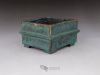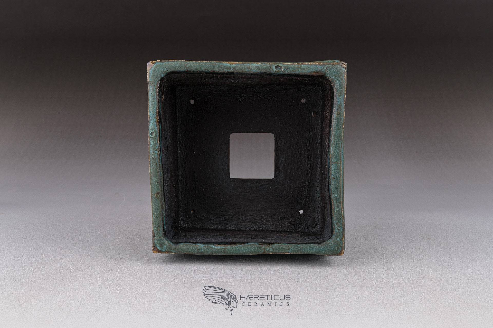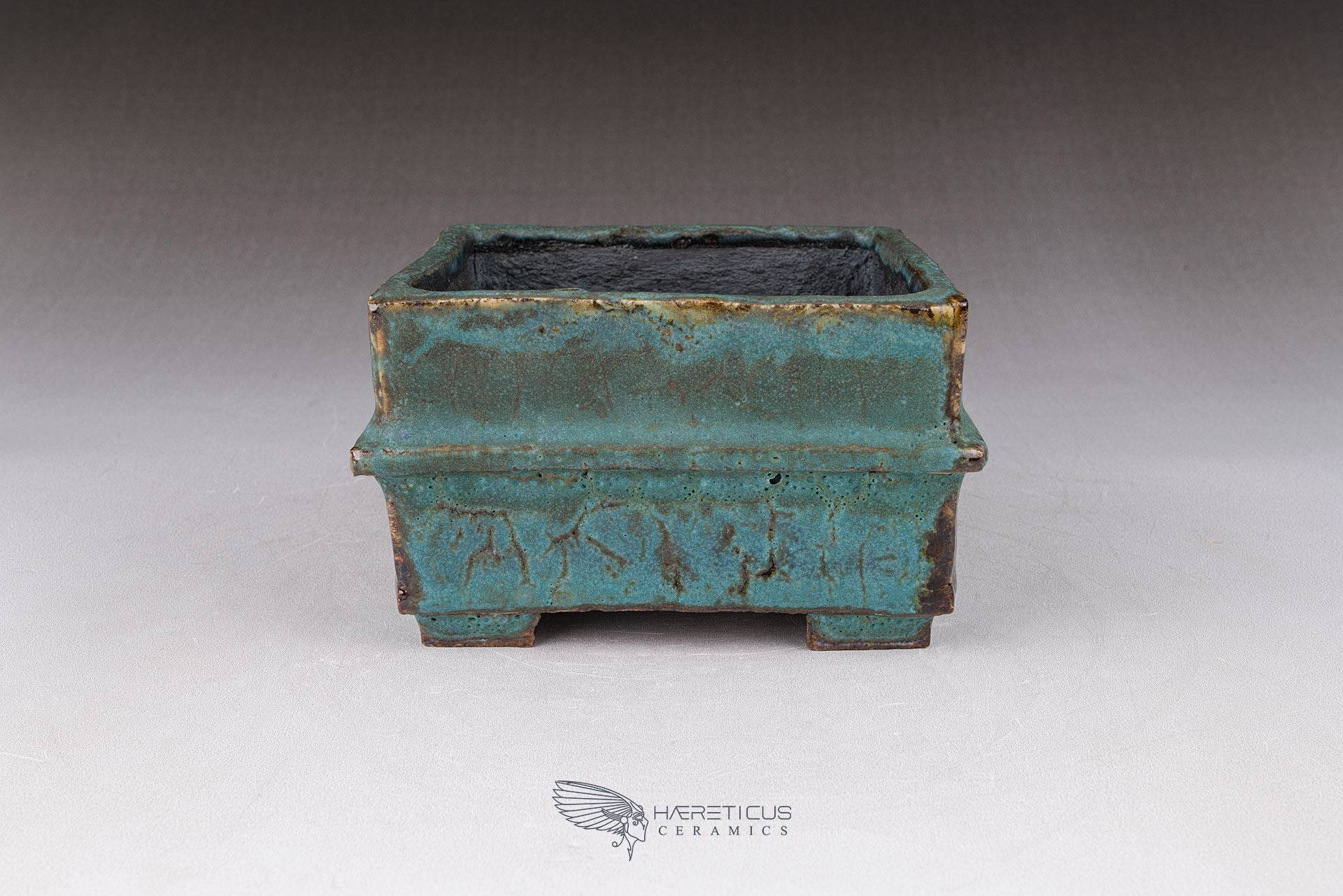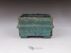 Small square pot, constructed from slabs (tatara-zukuri), with a rustic, worn look. The glaze is a satin antique bronze green that breaks on the variegated neriage clay. Ideal for a mame bonsai or a shitakusa.