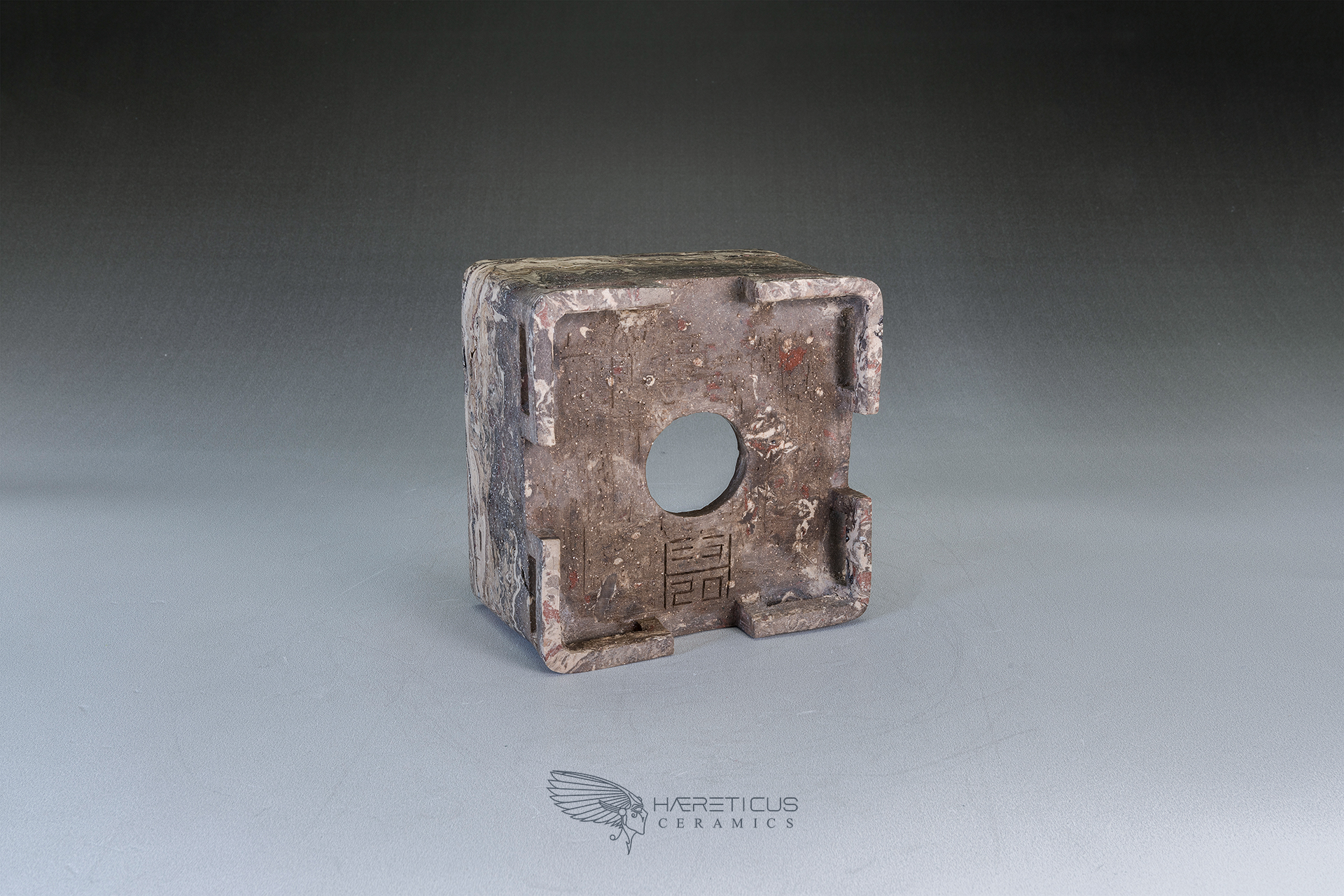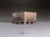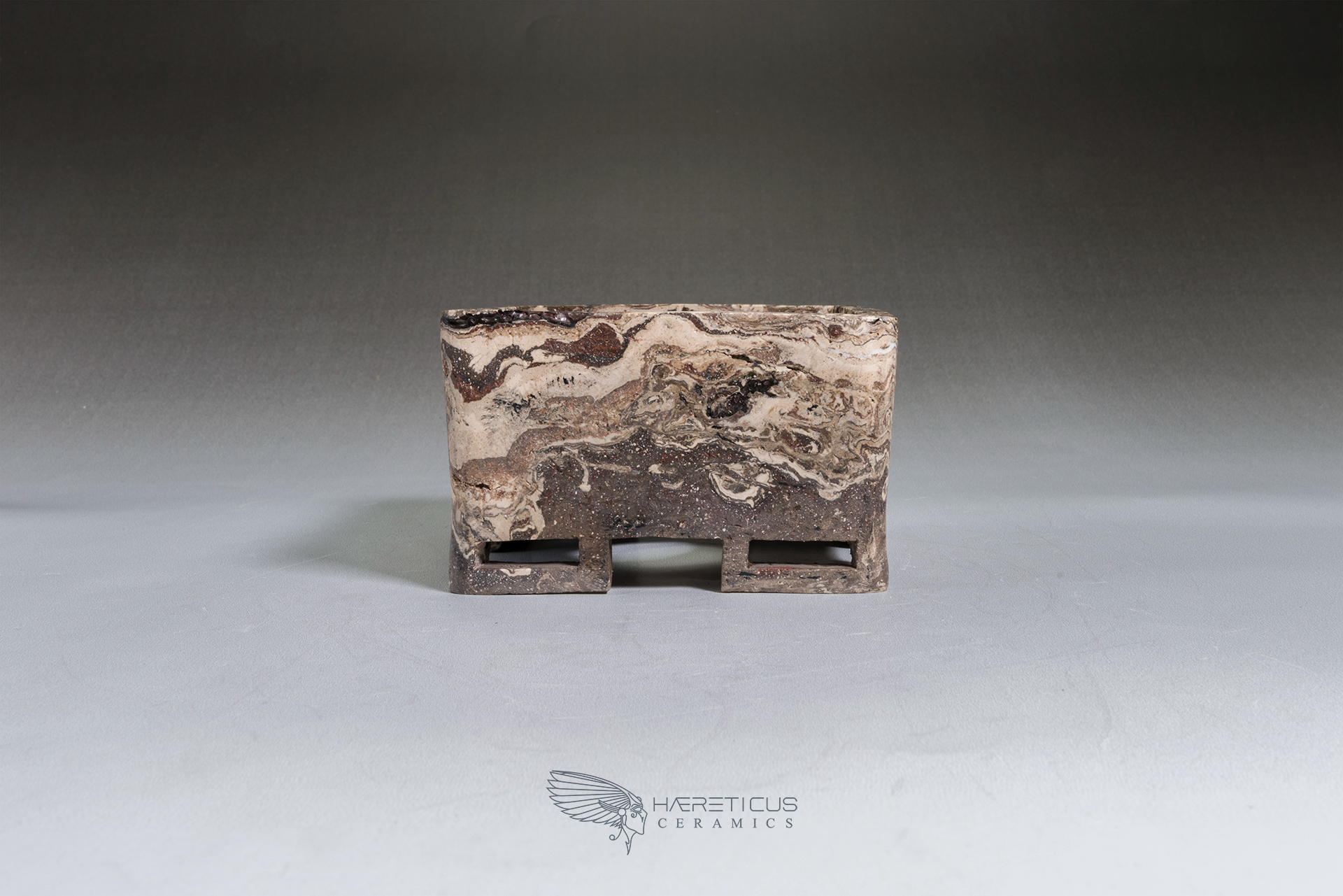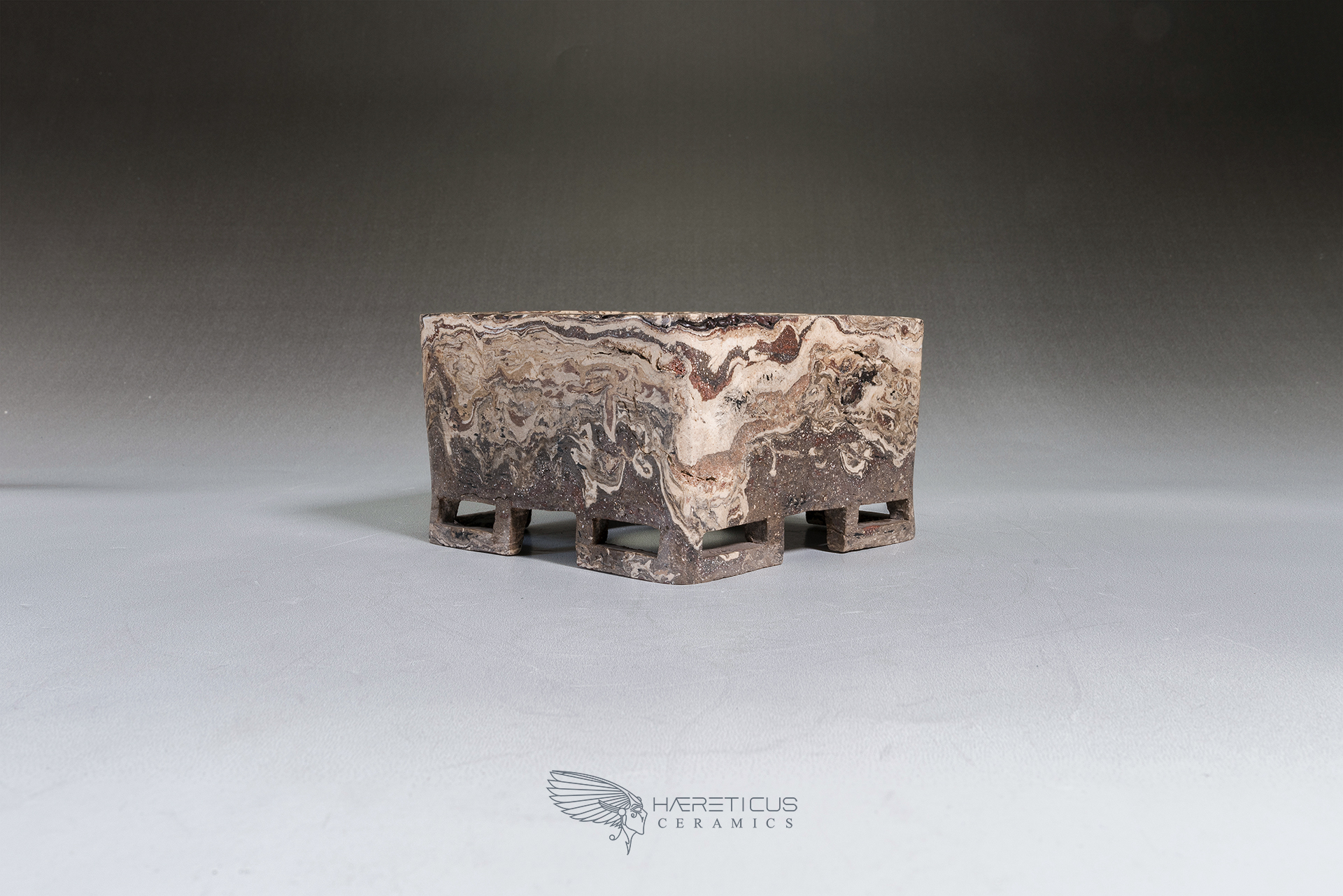 Suitable for a small shohin or a shitakusa, this pot was carved from a single block of different colored clays (Kurinuki technique). The four corner feet are hollowed to visually lighten the overall shape. After firing at 1280°C, it was polished on the outside to enhance the marbled feel of the stoneware.