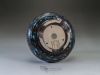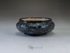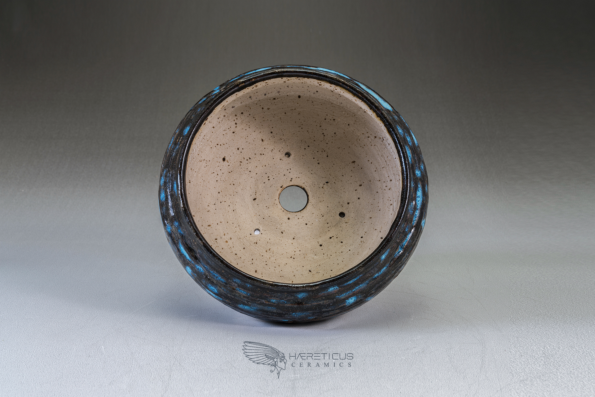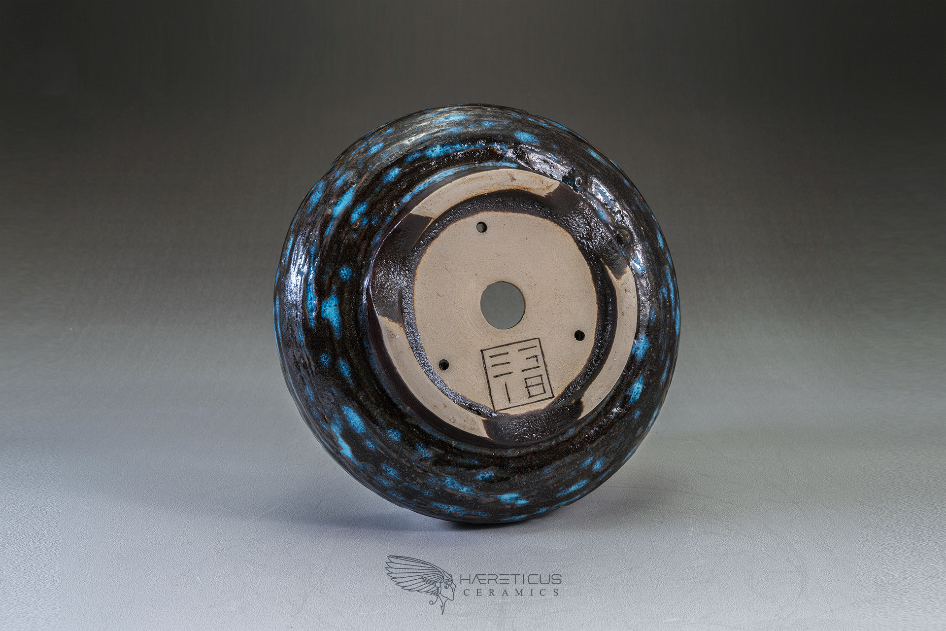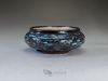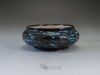 This mame pot made was on the potter's wheel and then carved. The pot was coated with a base glossy black glaze covered with a light blue one that only appears in the deeper grooves. EG - 2018