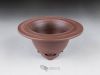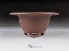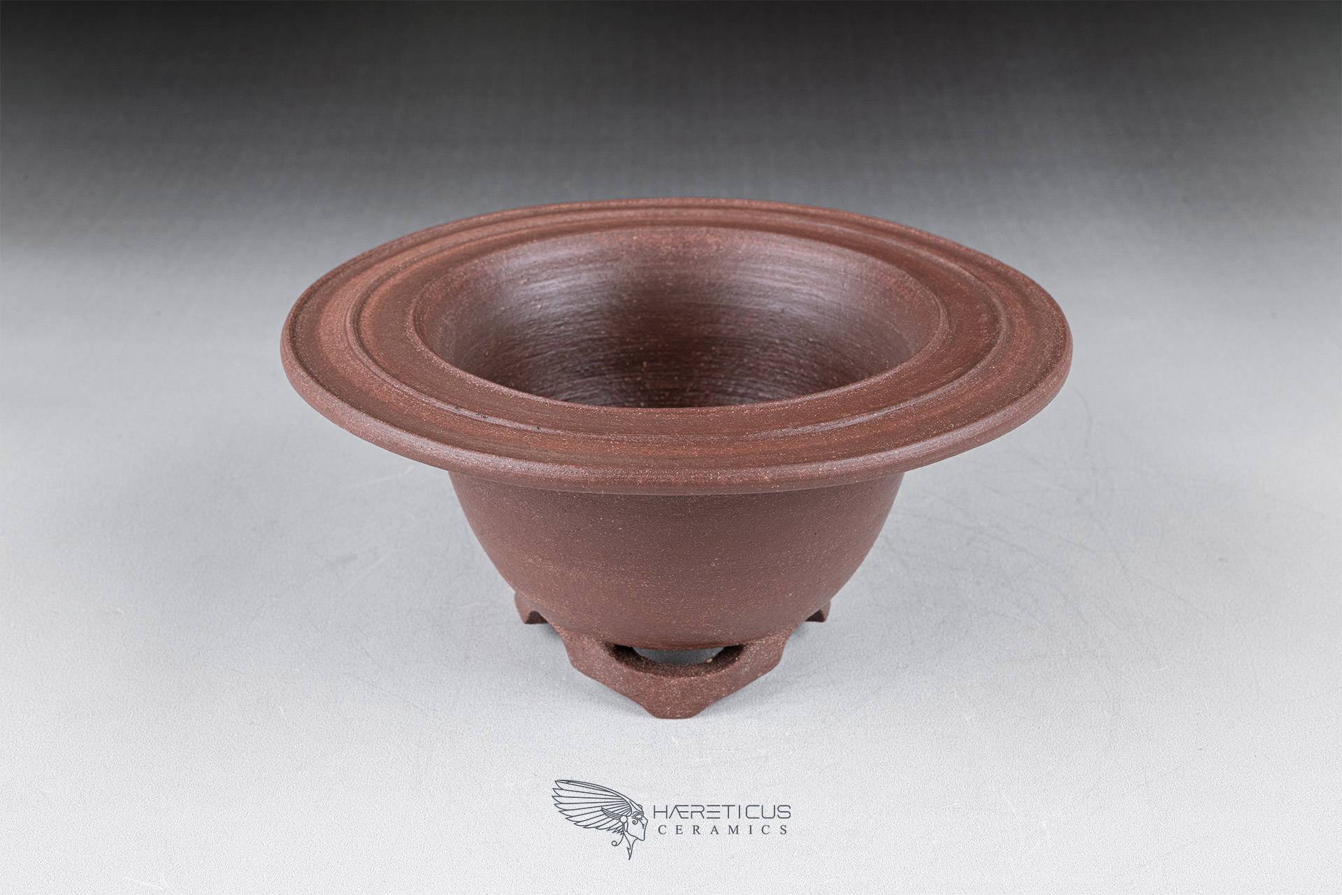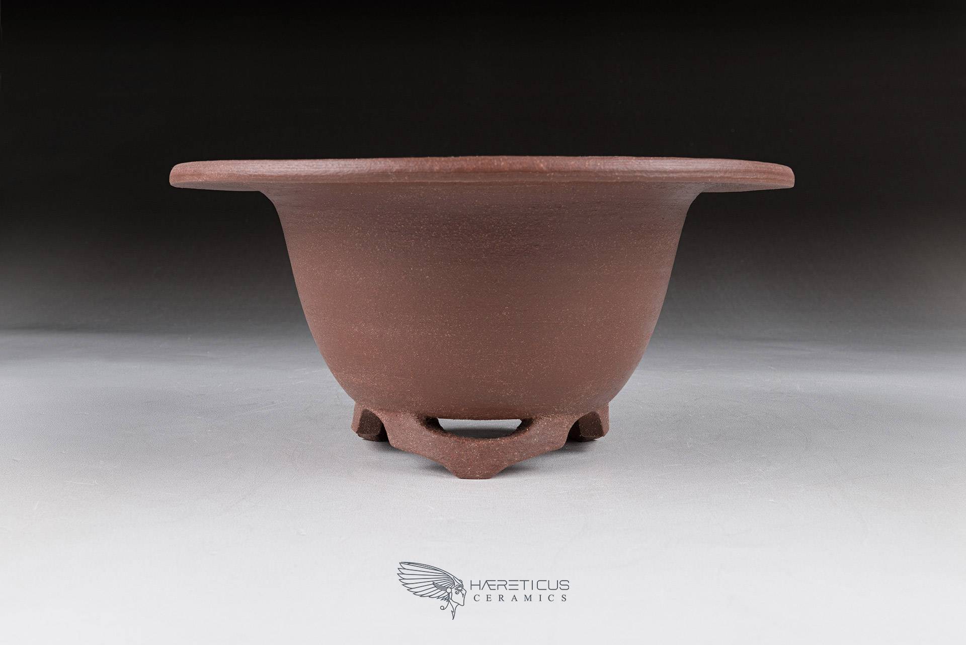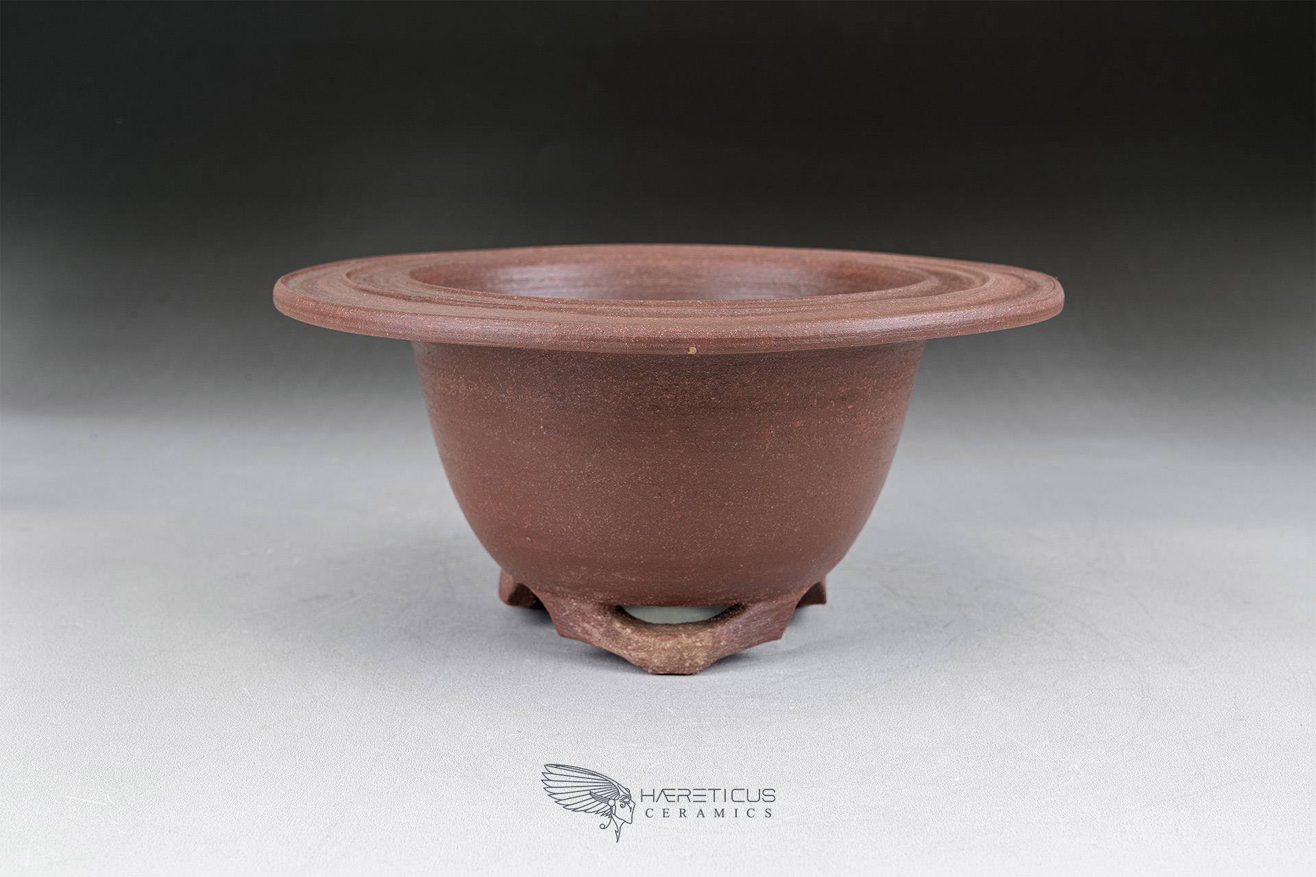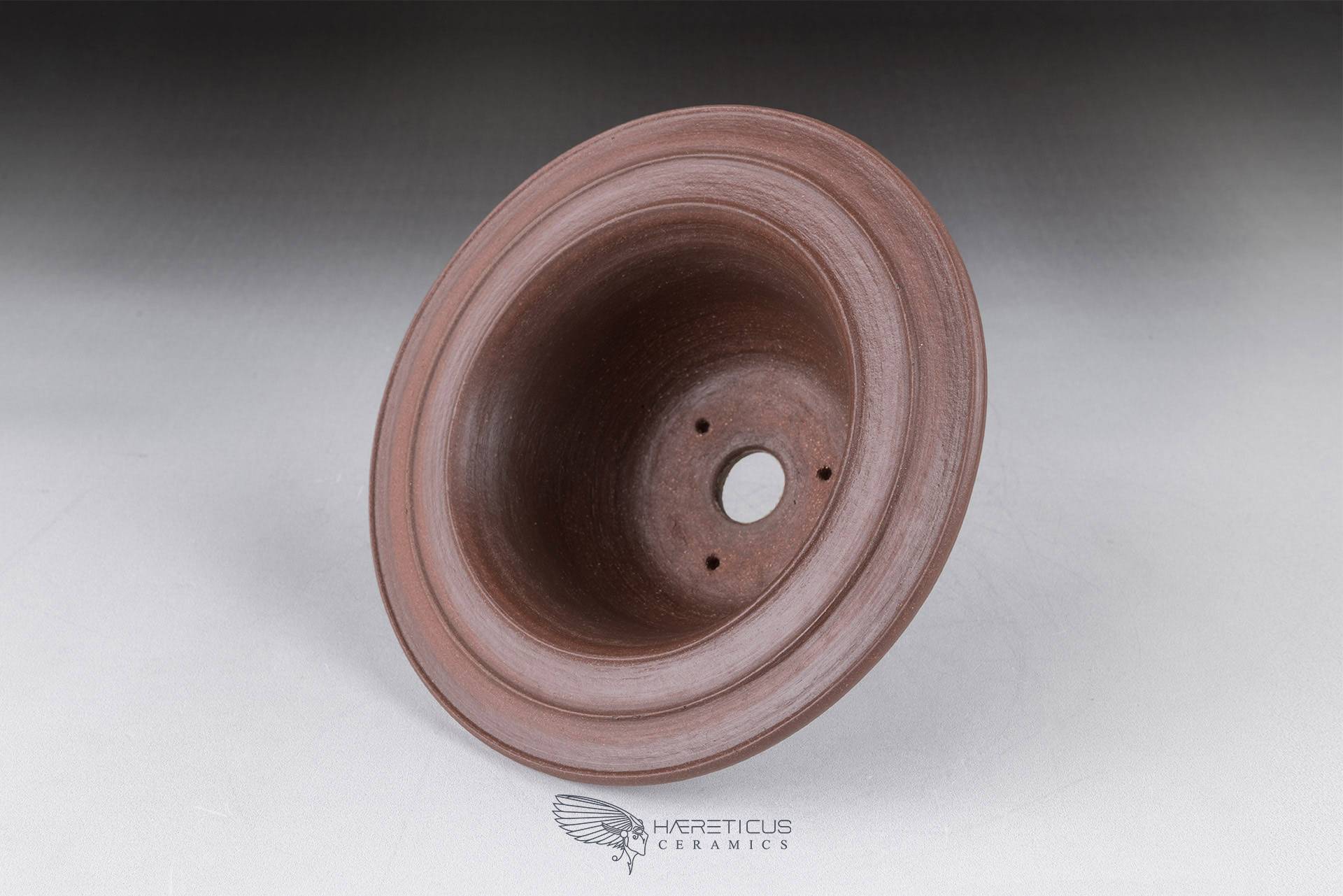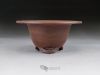 Round, wide-rimmed stoneware pot in a muted sienna brown with lighter hues at the base. The upper rim features concentric reliefs depicting gentle ripples of water breaking on the shore.