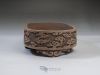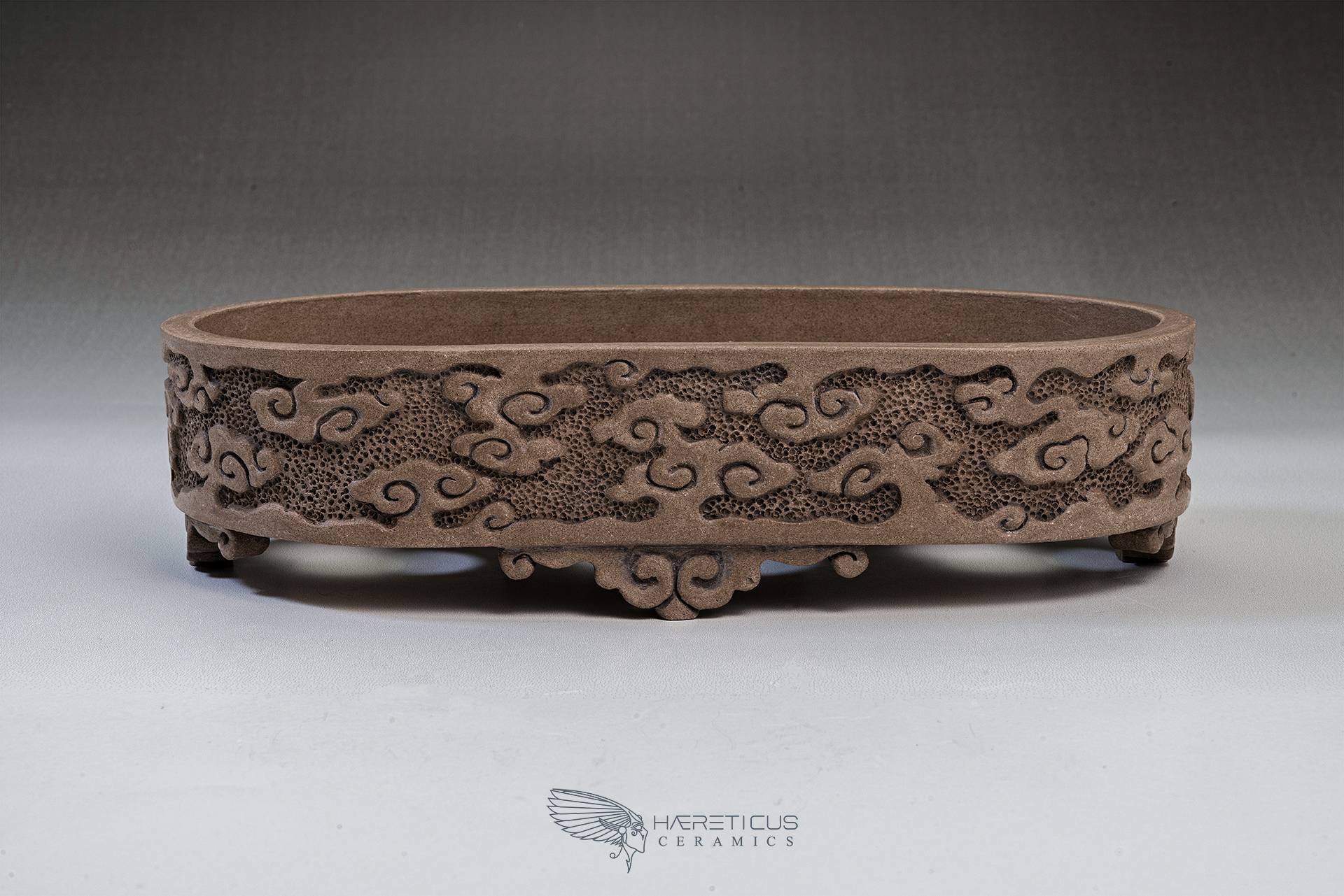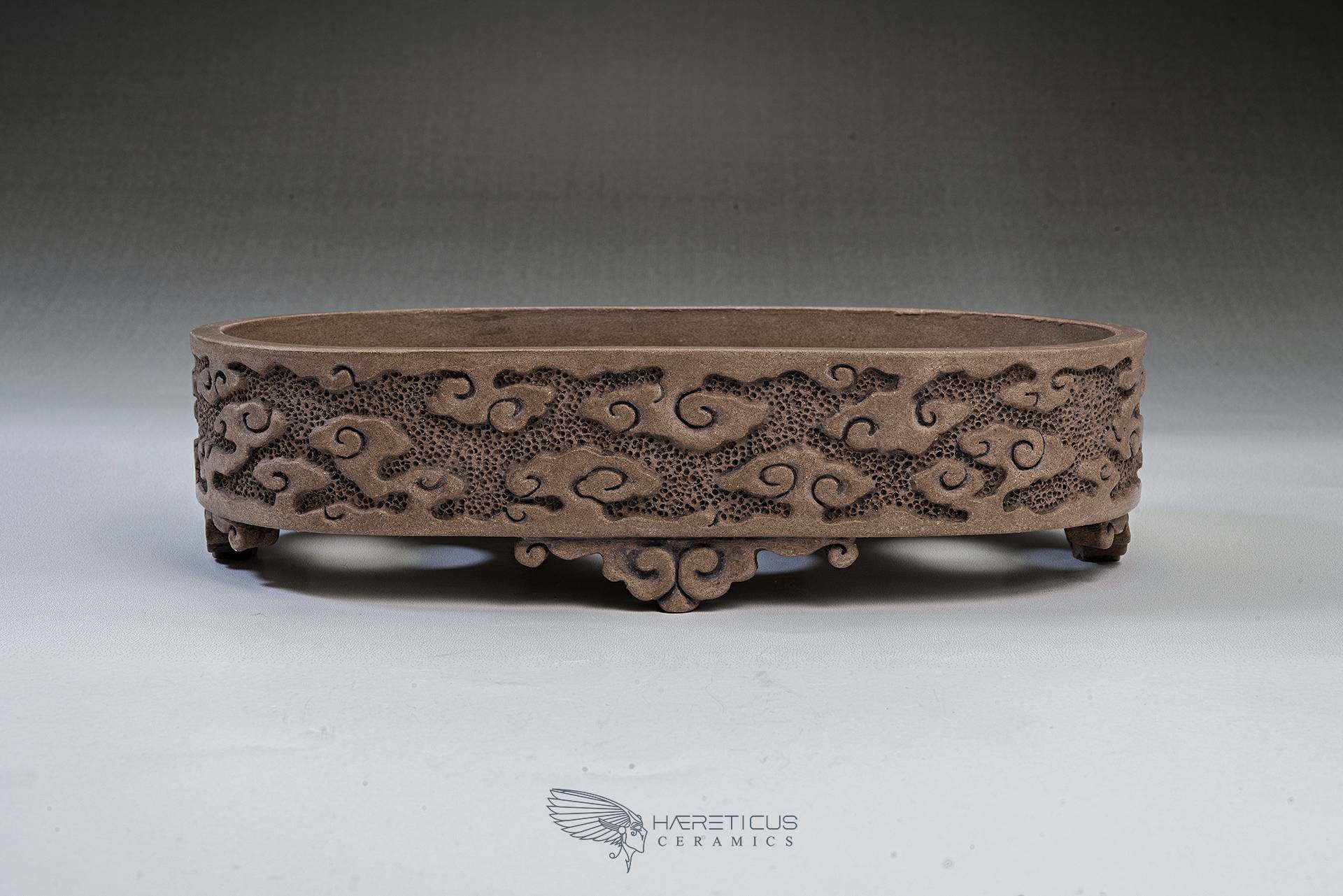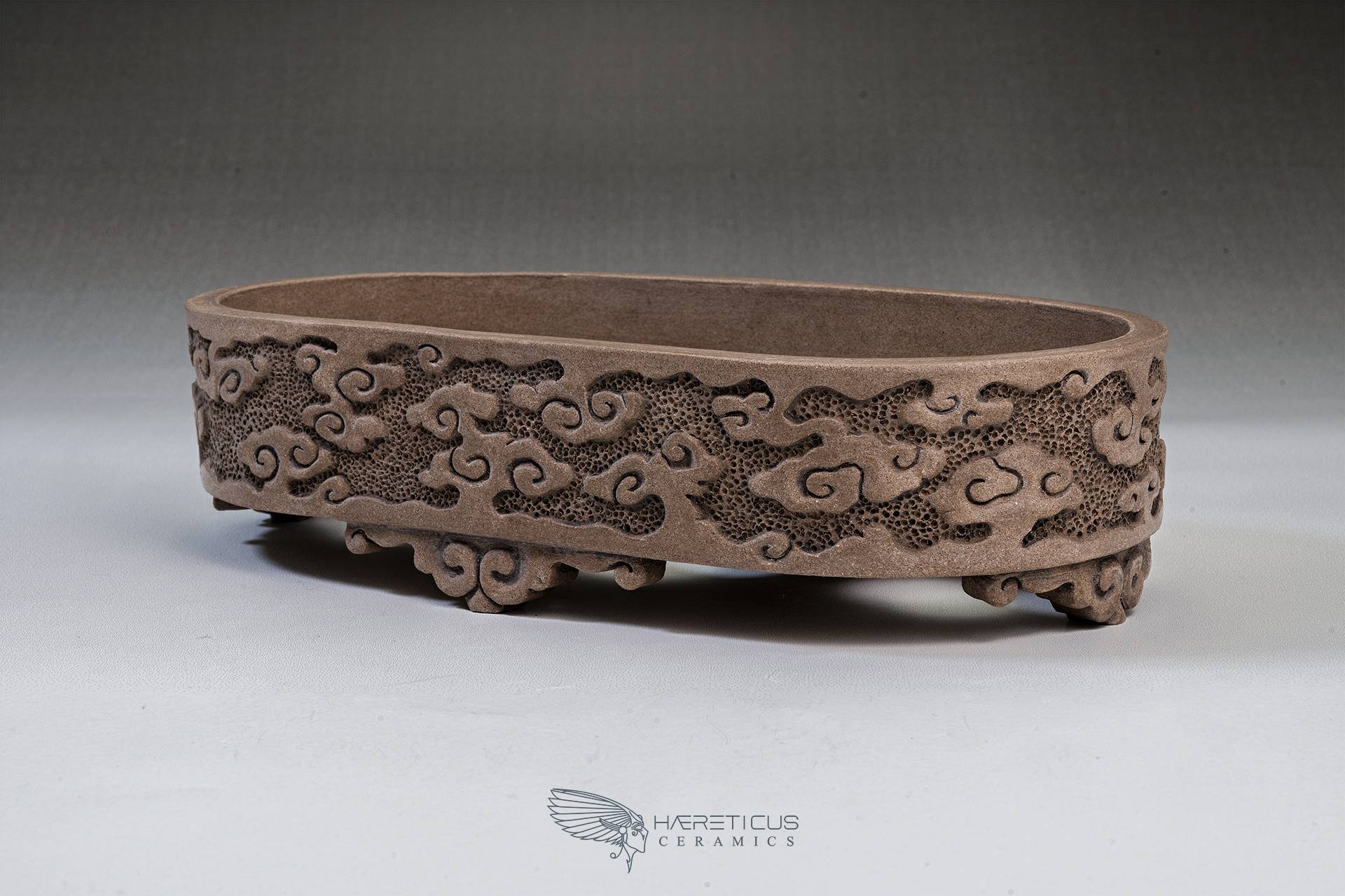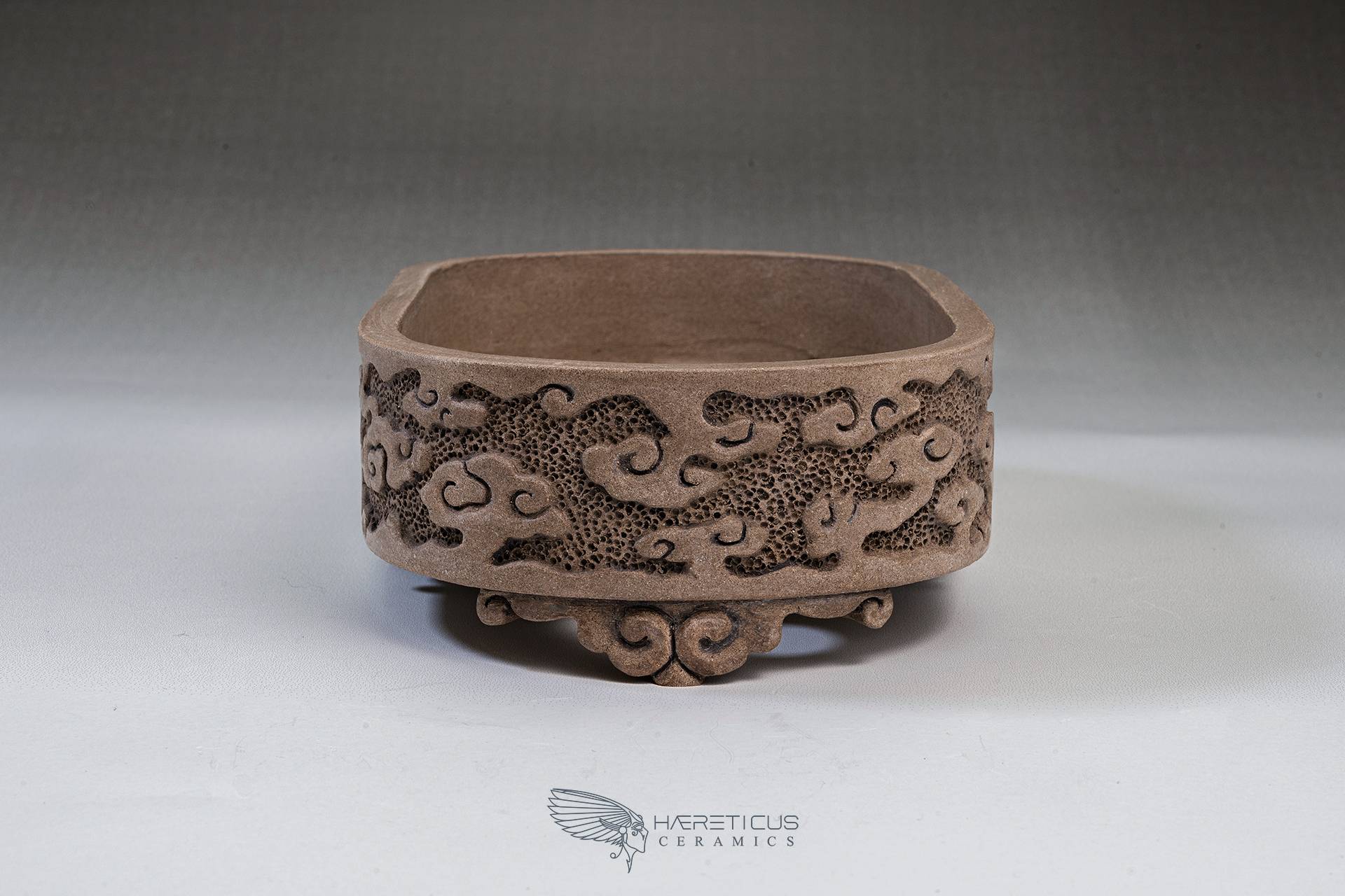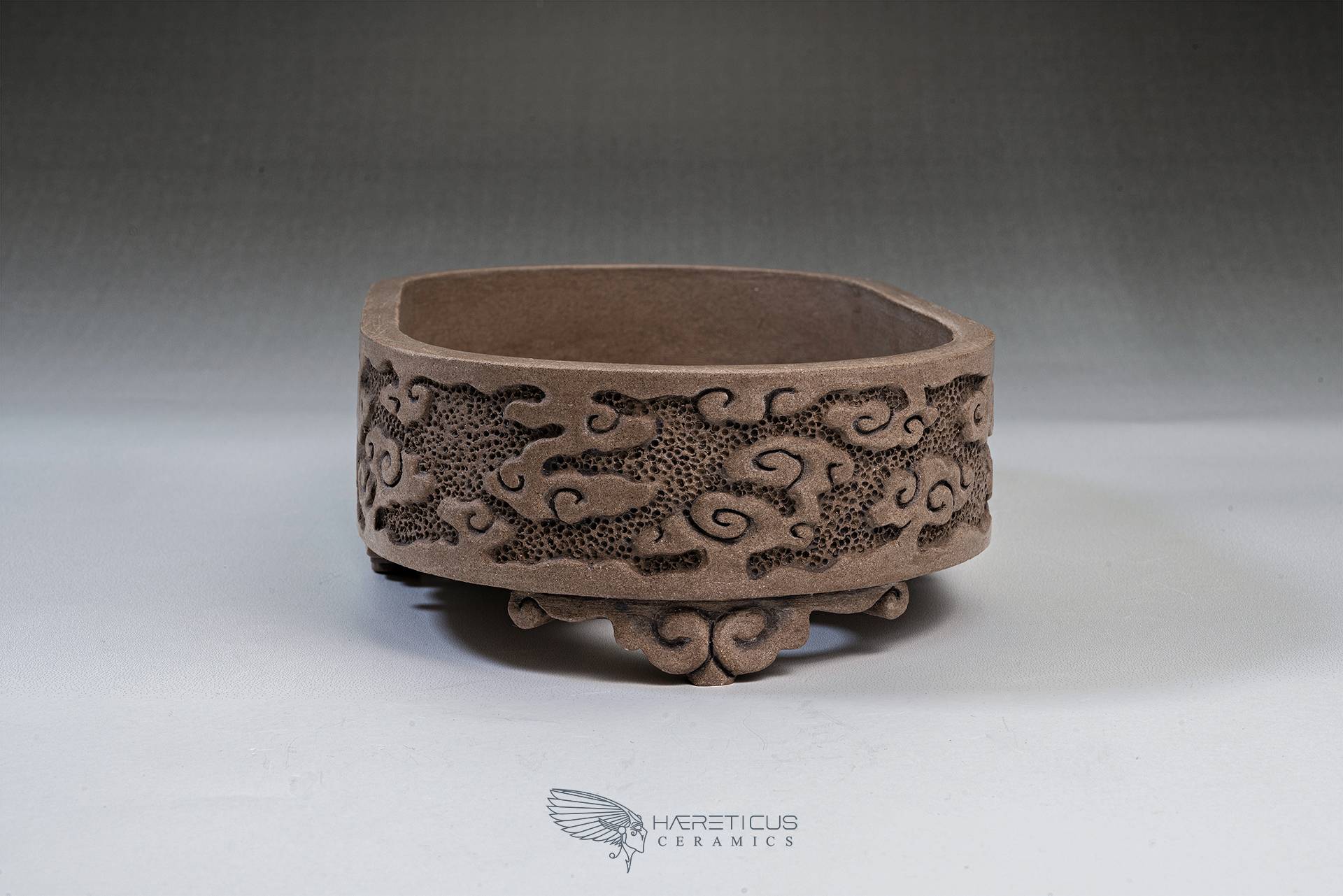 Made from stoneware slabs (Tatara-zukuri) and then carved out to reveal the clouds in bas-relief. The spaces between the clouds were then punched around the entire surface. The feet were designed and then custom-made just for this pot. The surface is unglazed and stained just with oxides.