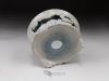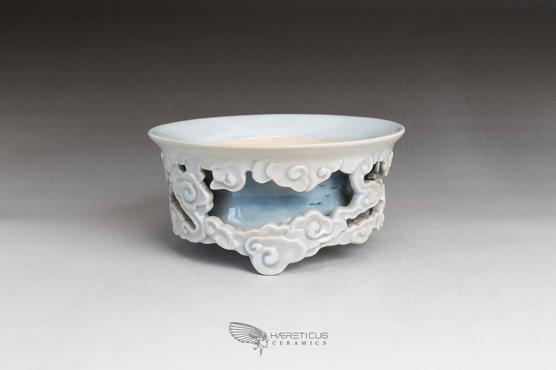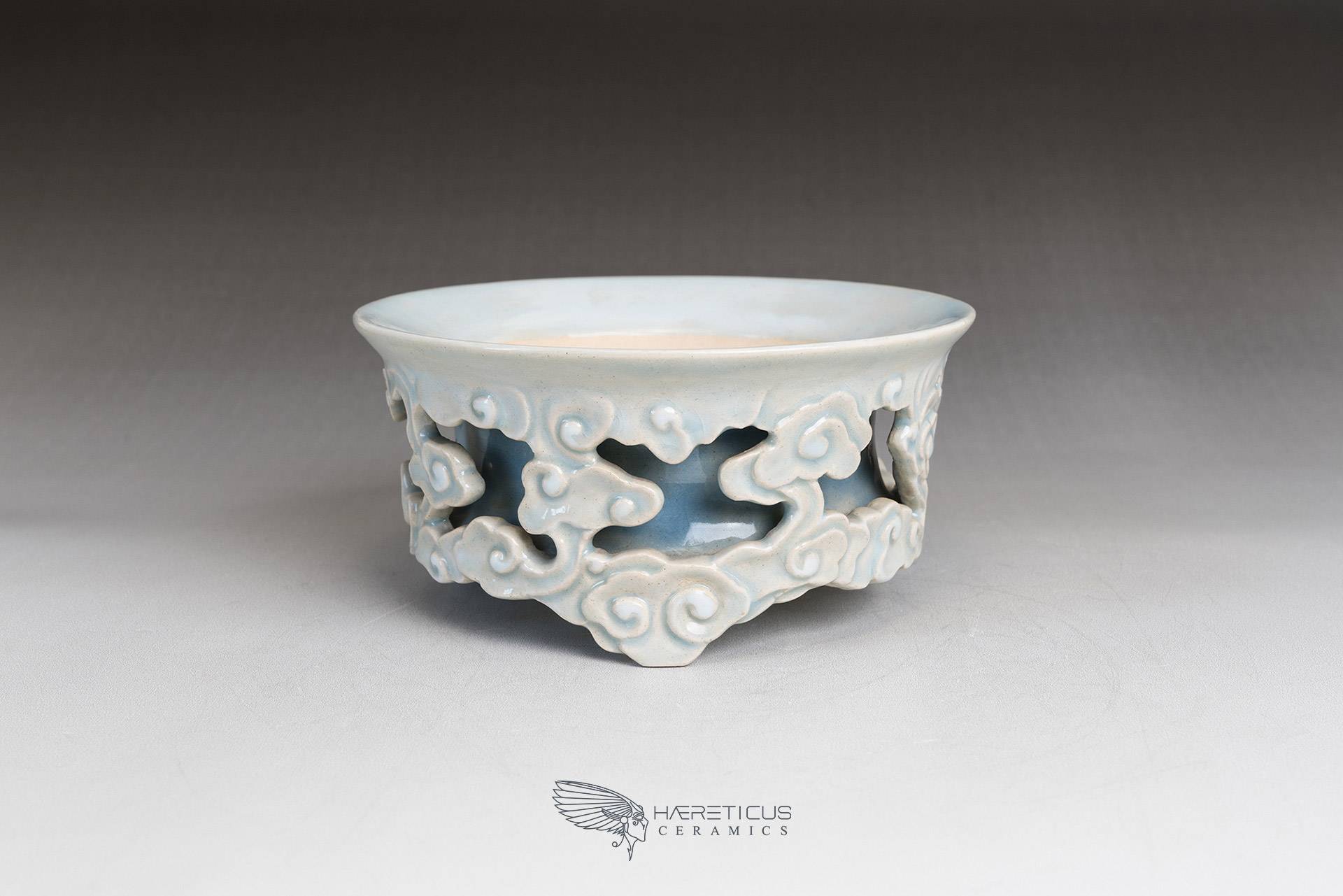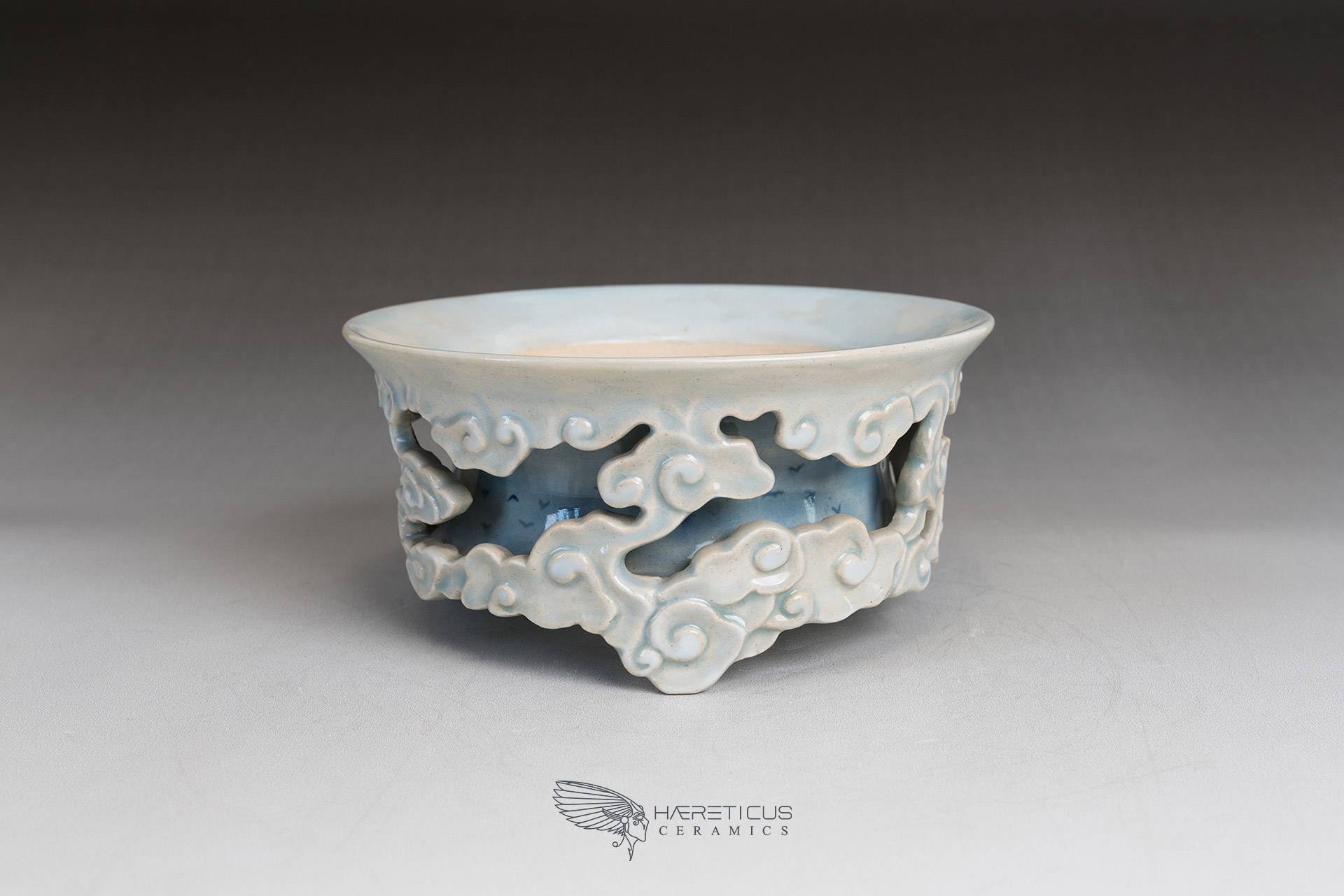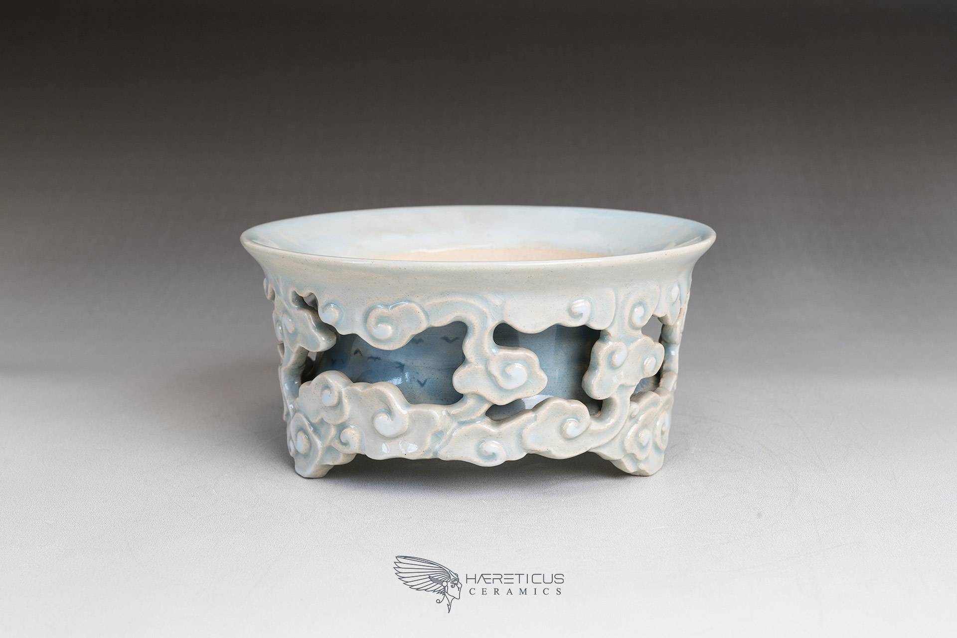 This was one of my first experiments with double-walled pots. These types of pots enhance the three-dimensionality of the subject represented, lending depth and dynamism. So I like to imagine a bonsai tree blowing in the wind of a cloudy spring sky. It was made on a potter's wheel, then dry-sculpted, and finally coated with various celadon glazes.