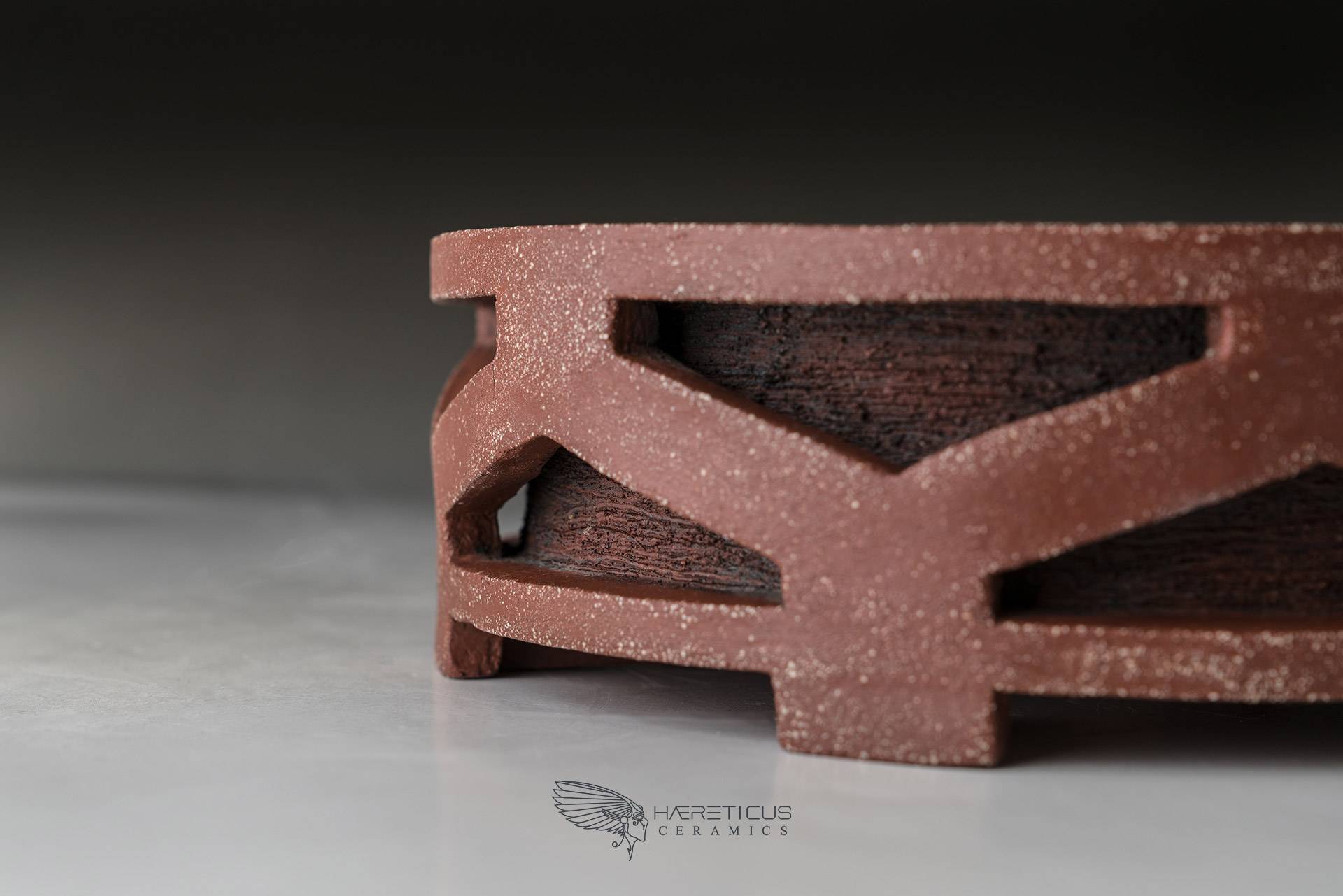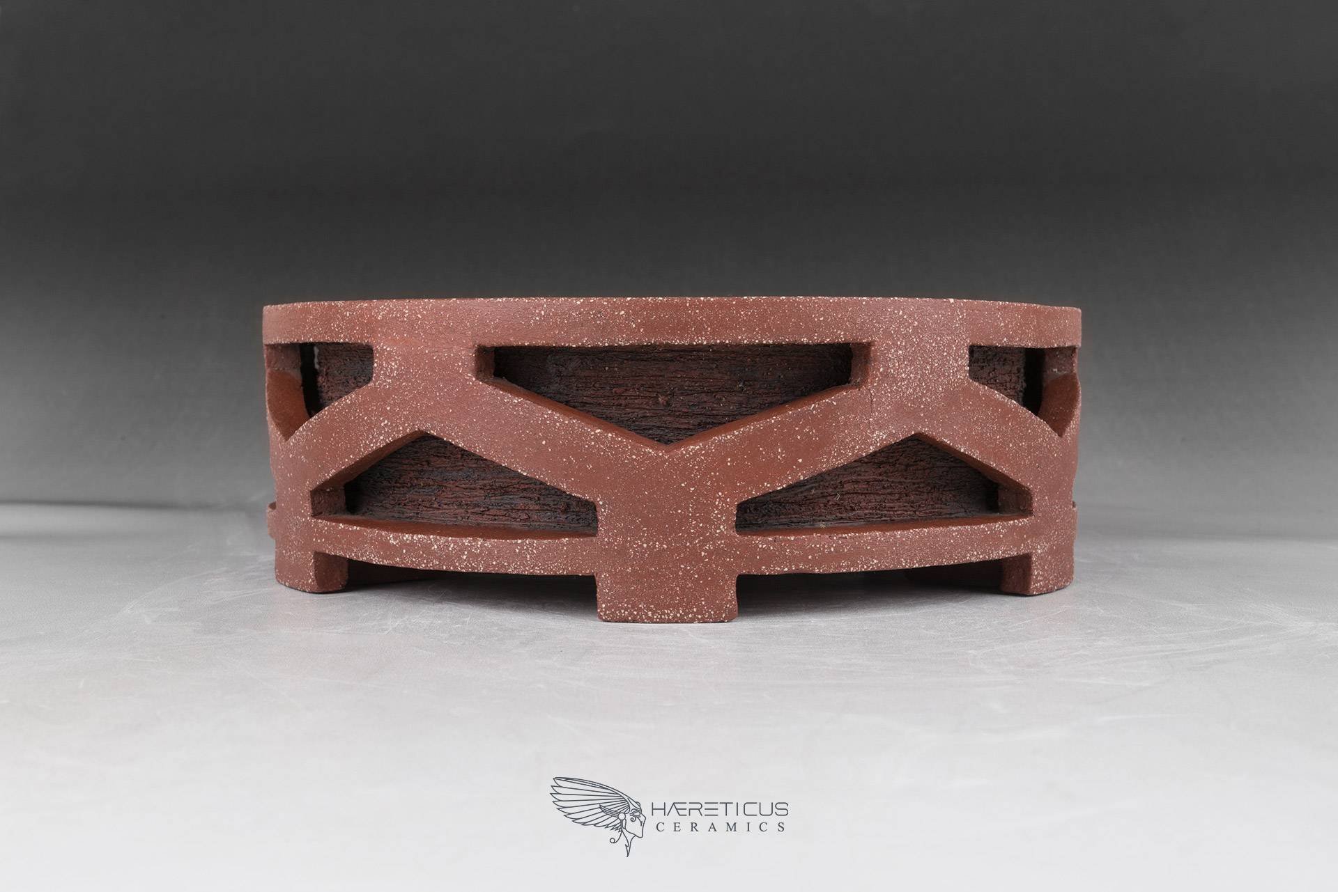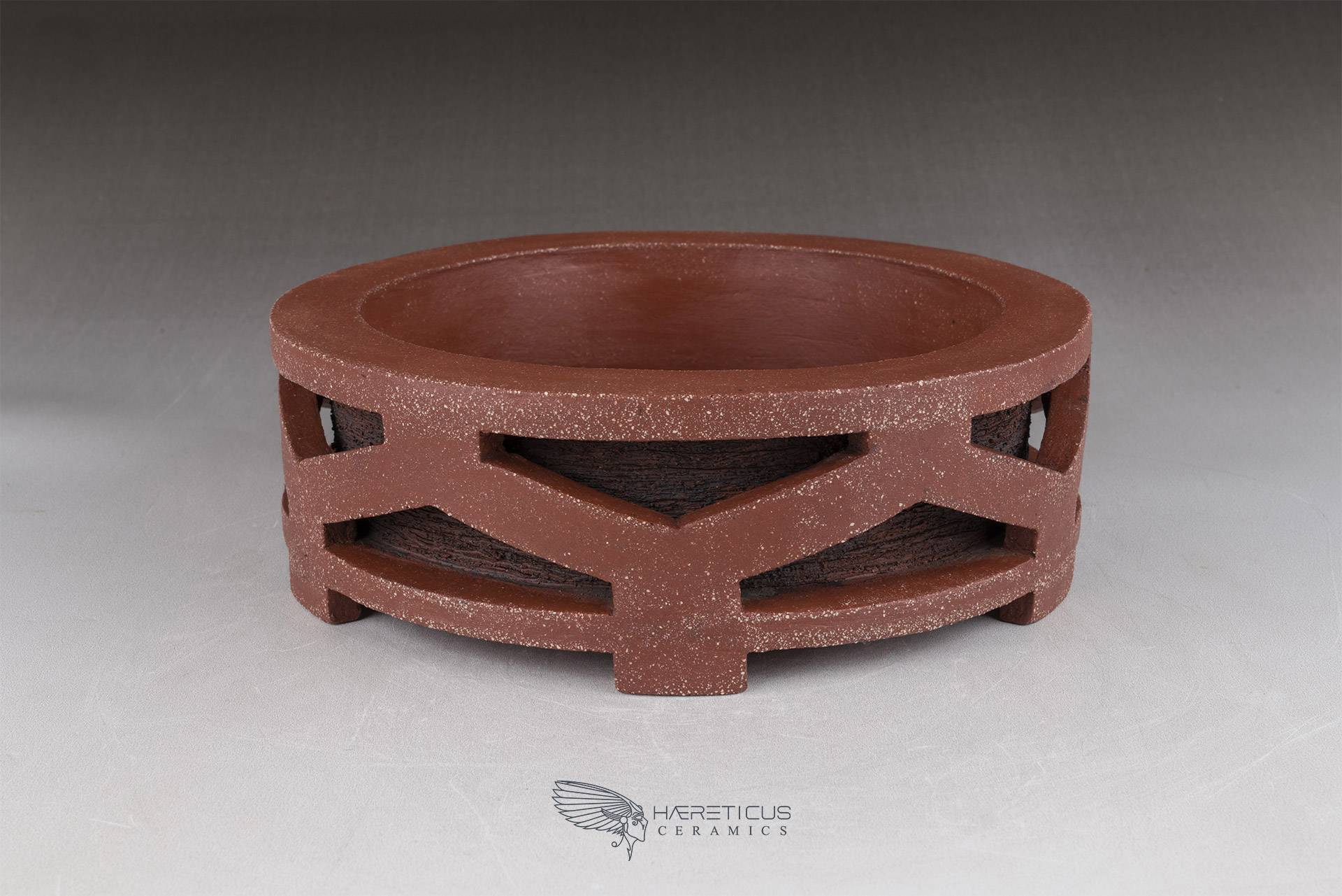 This pot represents one of my first forays into the world of bonsai pots. I wanted to create a new drum pot shape inspired not by the classic Nagado Daiko (barrel-shaped with rivets) but rather by the Okedo Daiko (where the hides are pulled with ropes). The shape is deliberately stylized and simplified so as not to overwhelm the overall appearance, especially when paired with a bonsai.