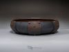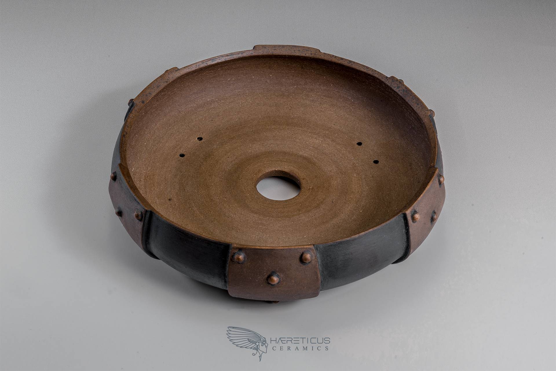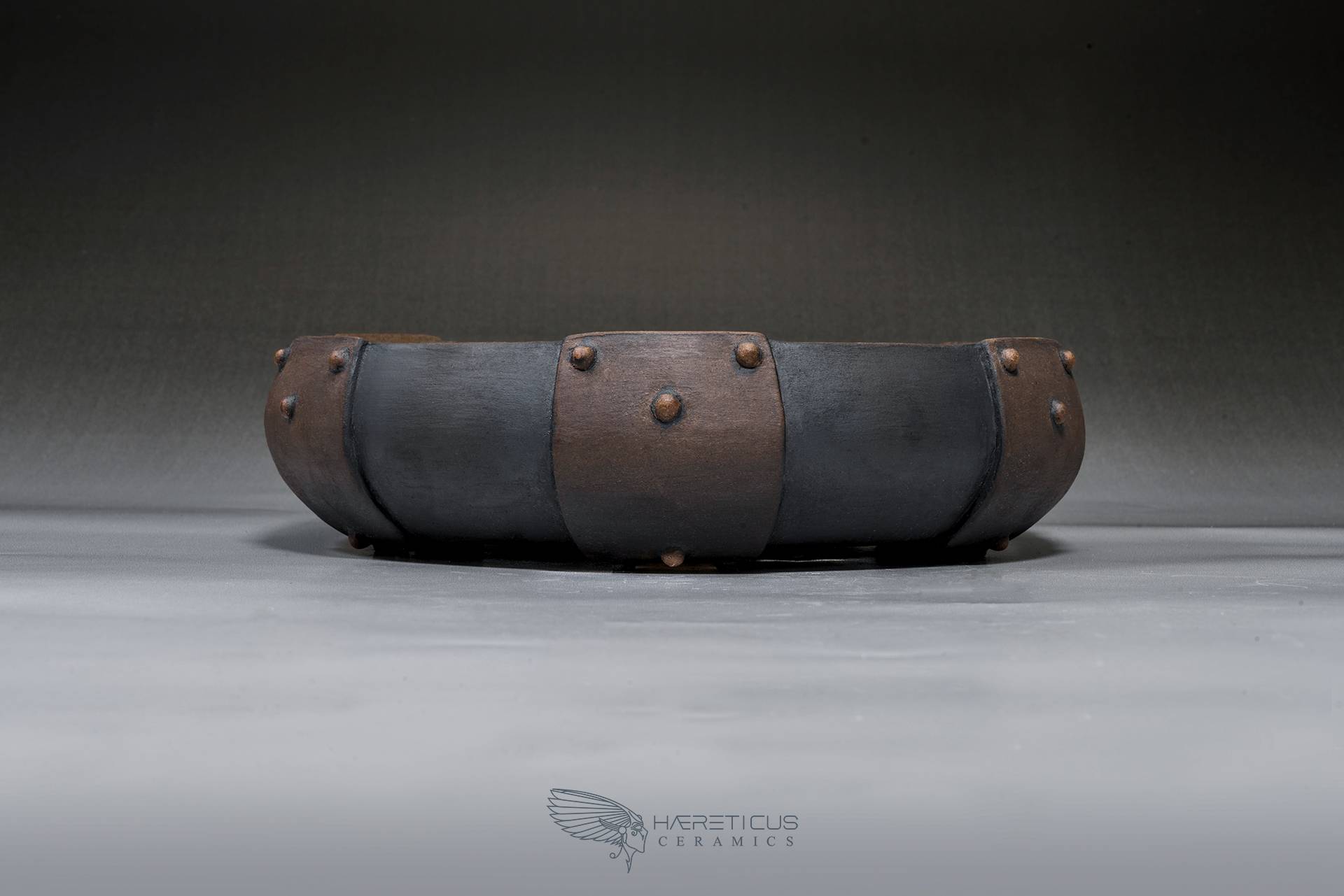 One of my first pots, the second from the "oddpot" series. It was made on a potter wheel, and then the raised parts and rivets were added. It was then coated with oxides and fired at 1270°C. EG - 2019 (Private collection)