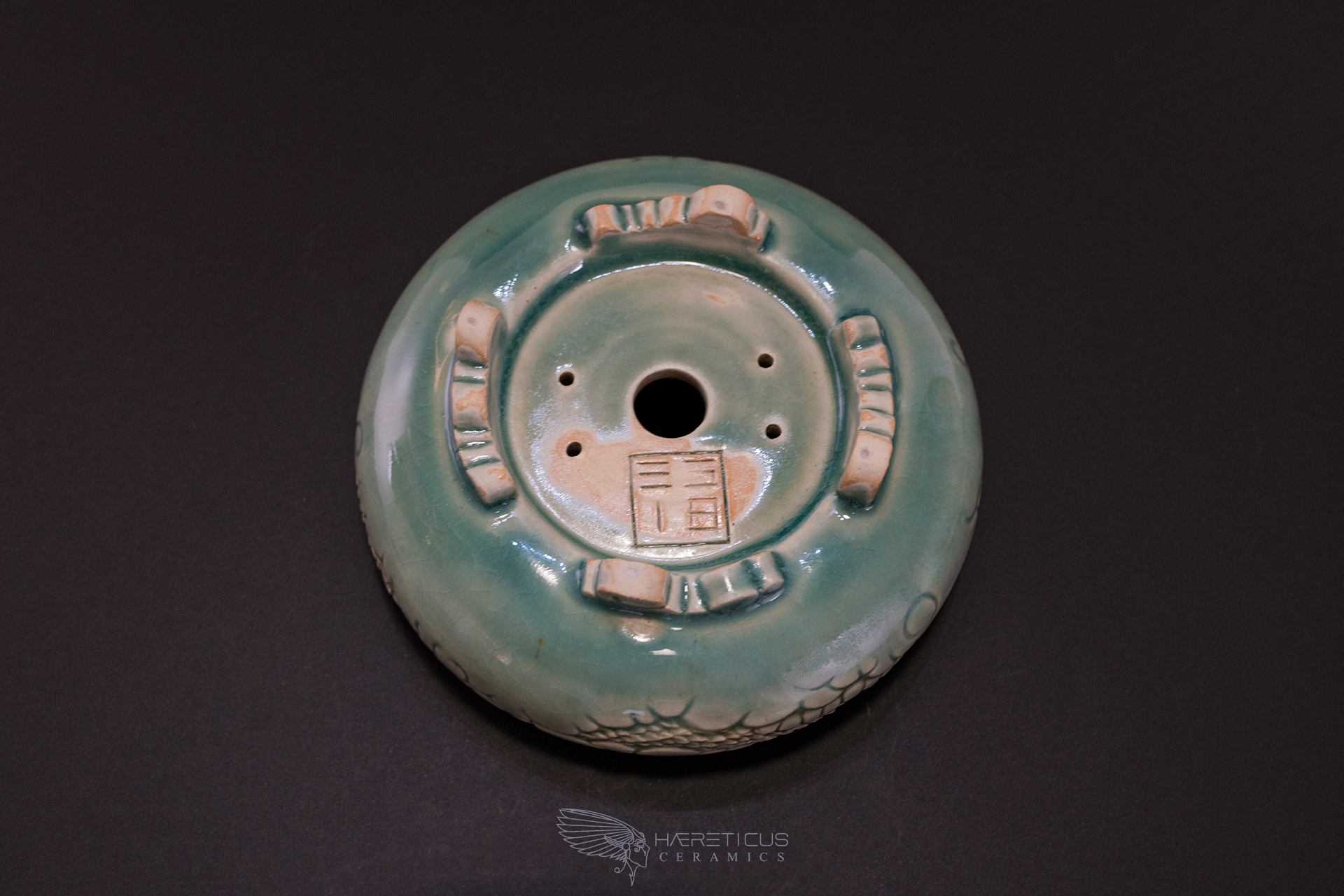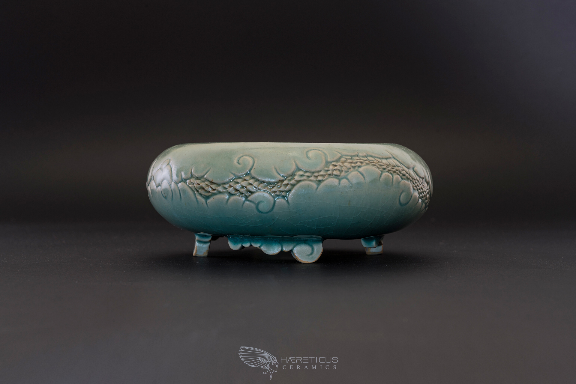 The pot, made of white stoneware, was made on the pottery-wheel and then hand-sculpted with clouds and a dragon crossing them. The four feet were also individually sculpted into the shape of clouds. It was then coated with a teal celadon glaze.