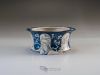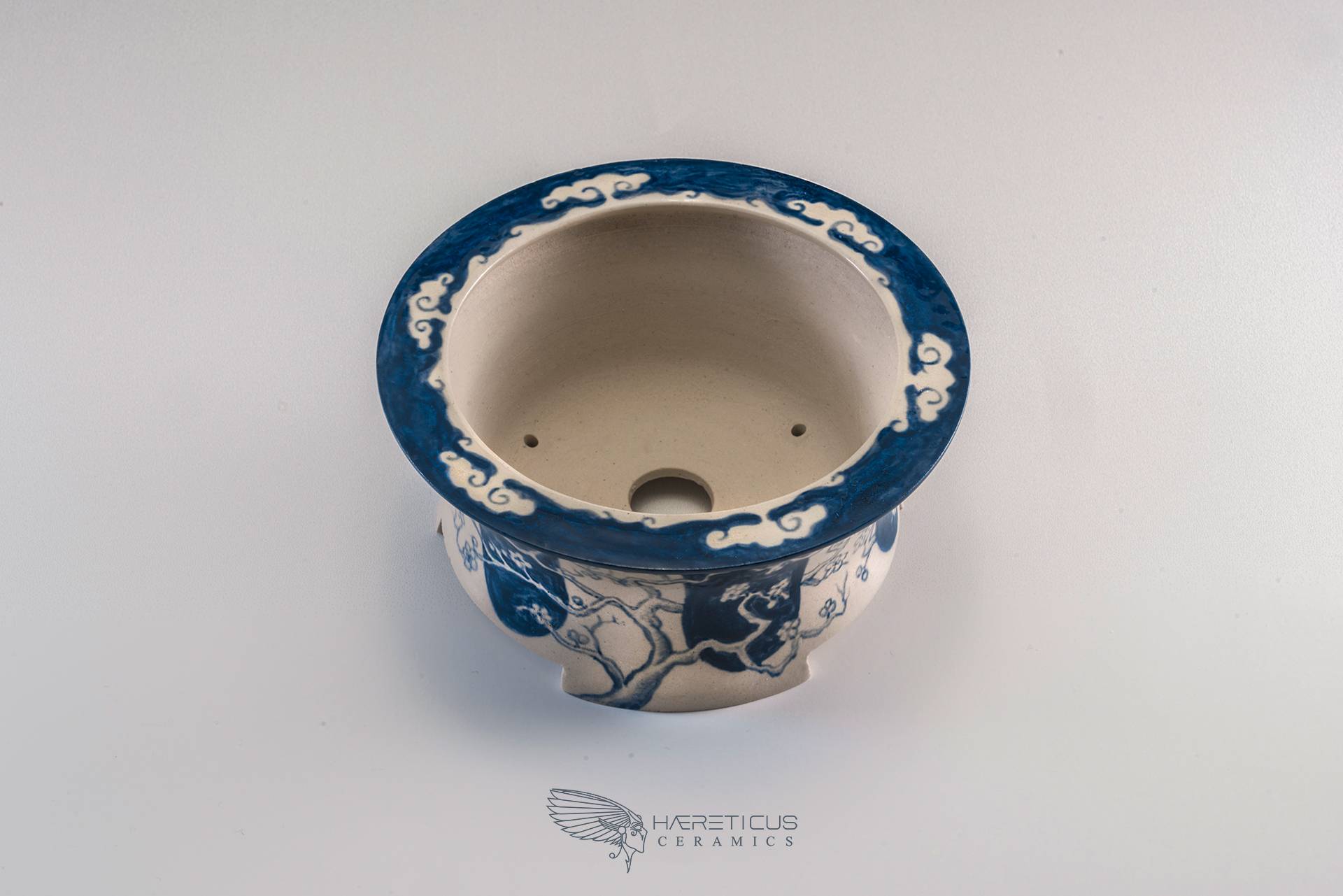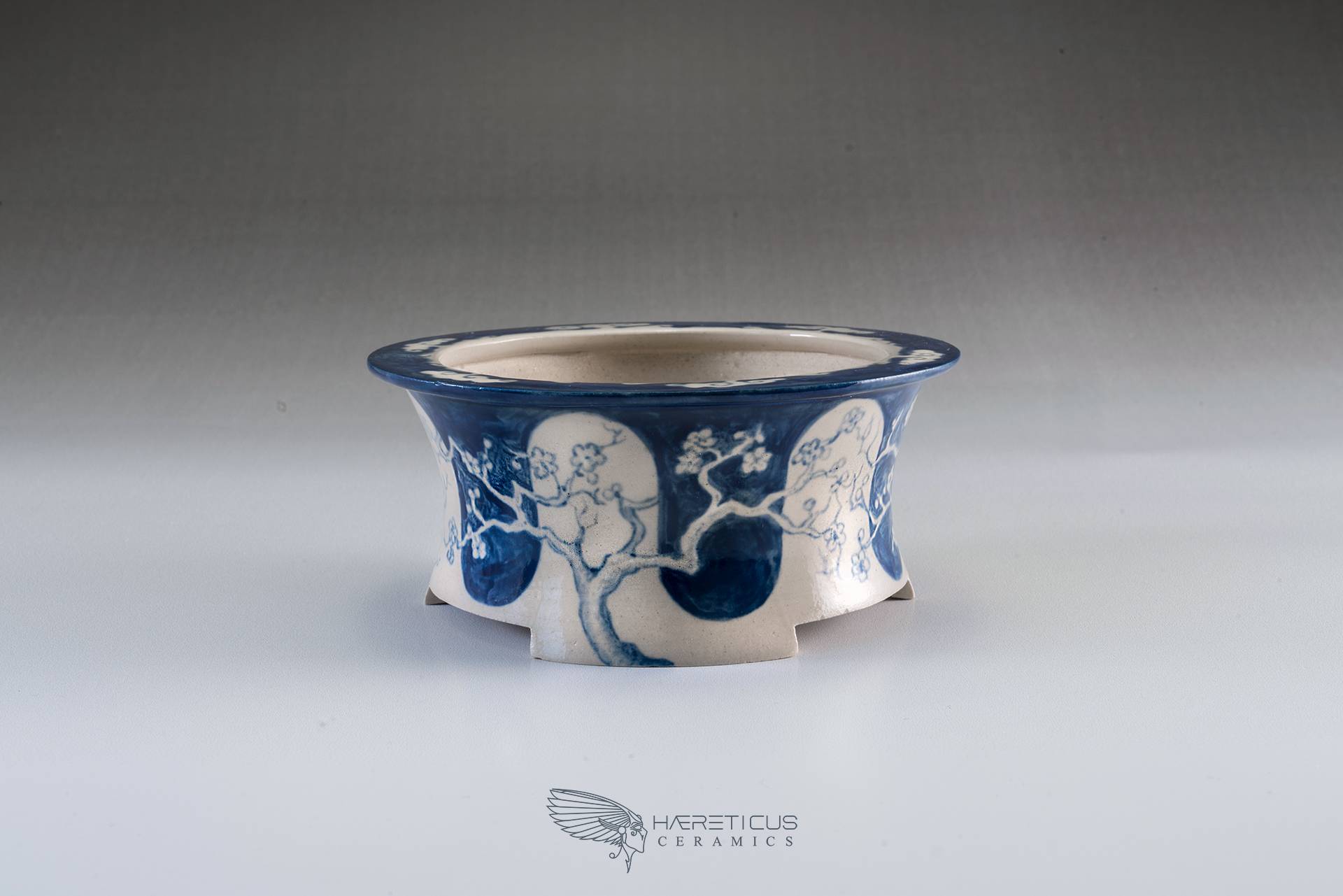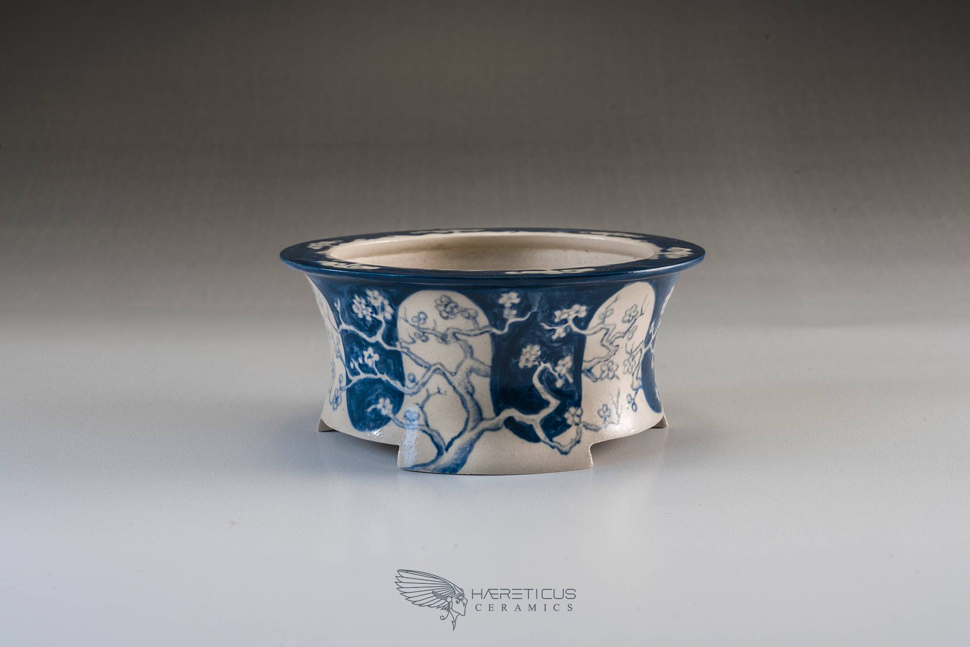 One of my first attempts at the sometsuke technique (blue cobalt gosu ink on withe clay-porcelain): a small stoneware pot for han-kengai or shitakusa. The wavy blue motif, inspired by the ancient Seto ware, is interspersed with three painted flowering trees