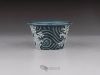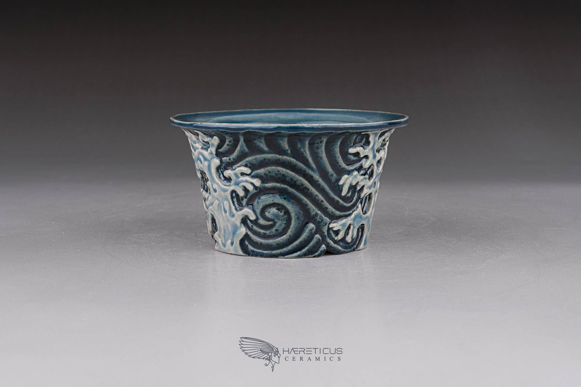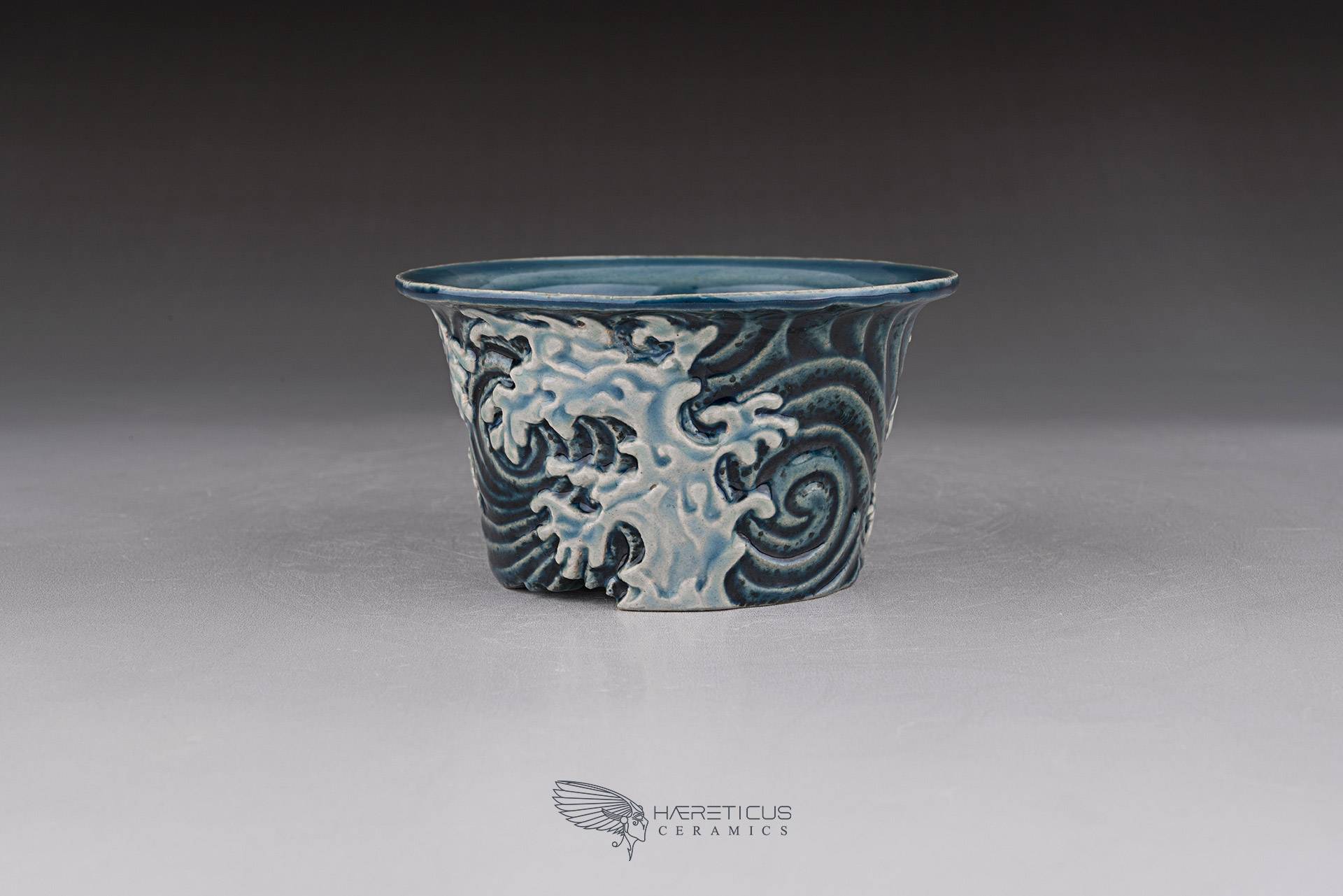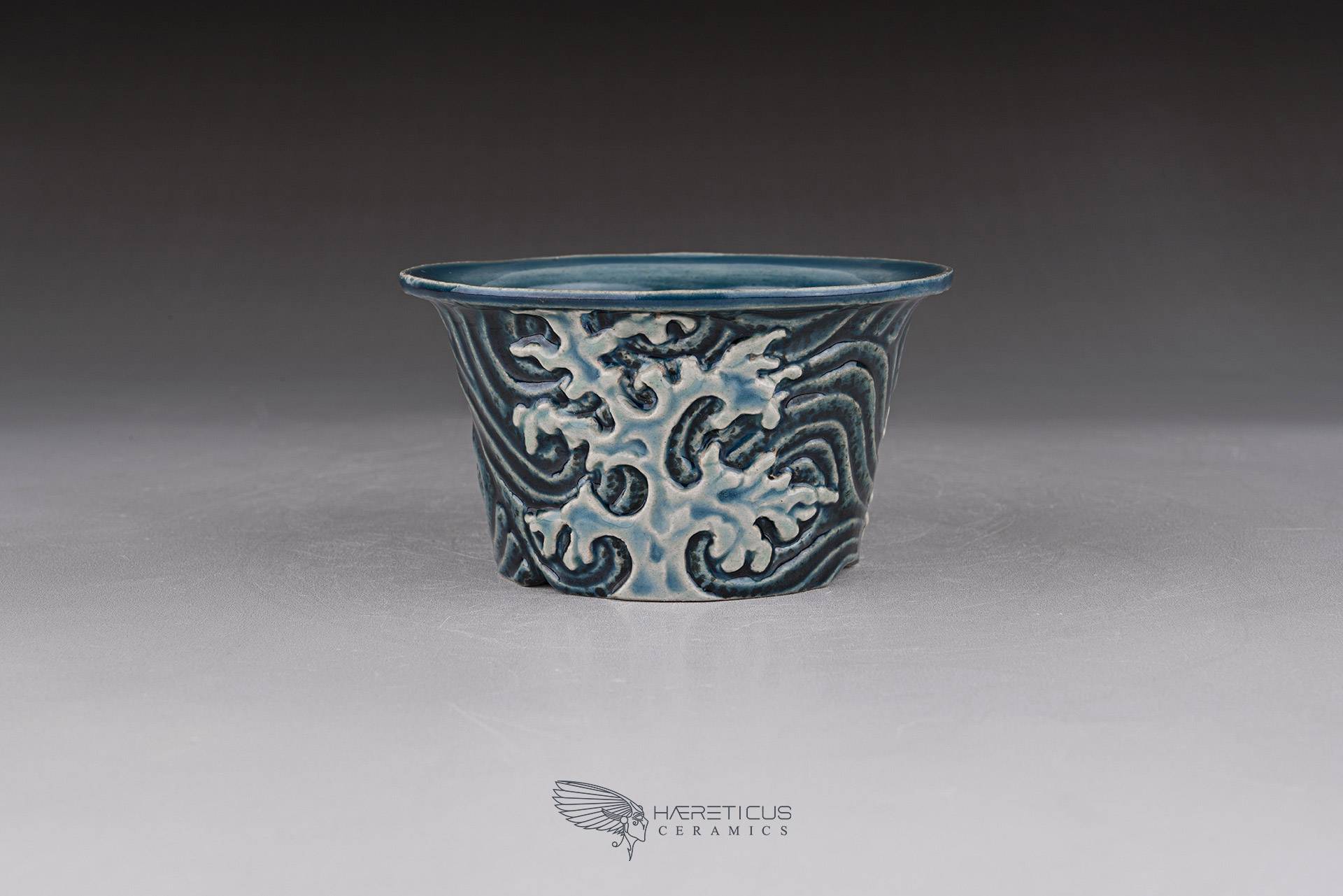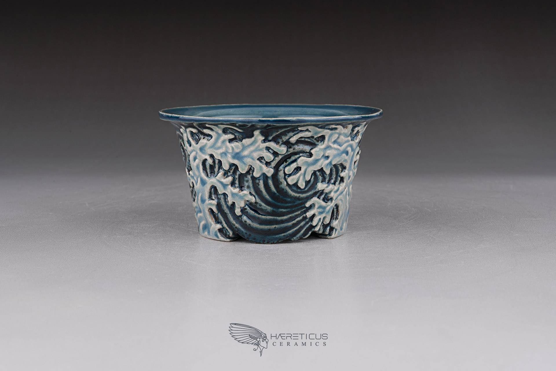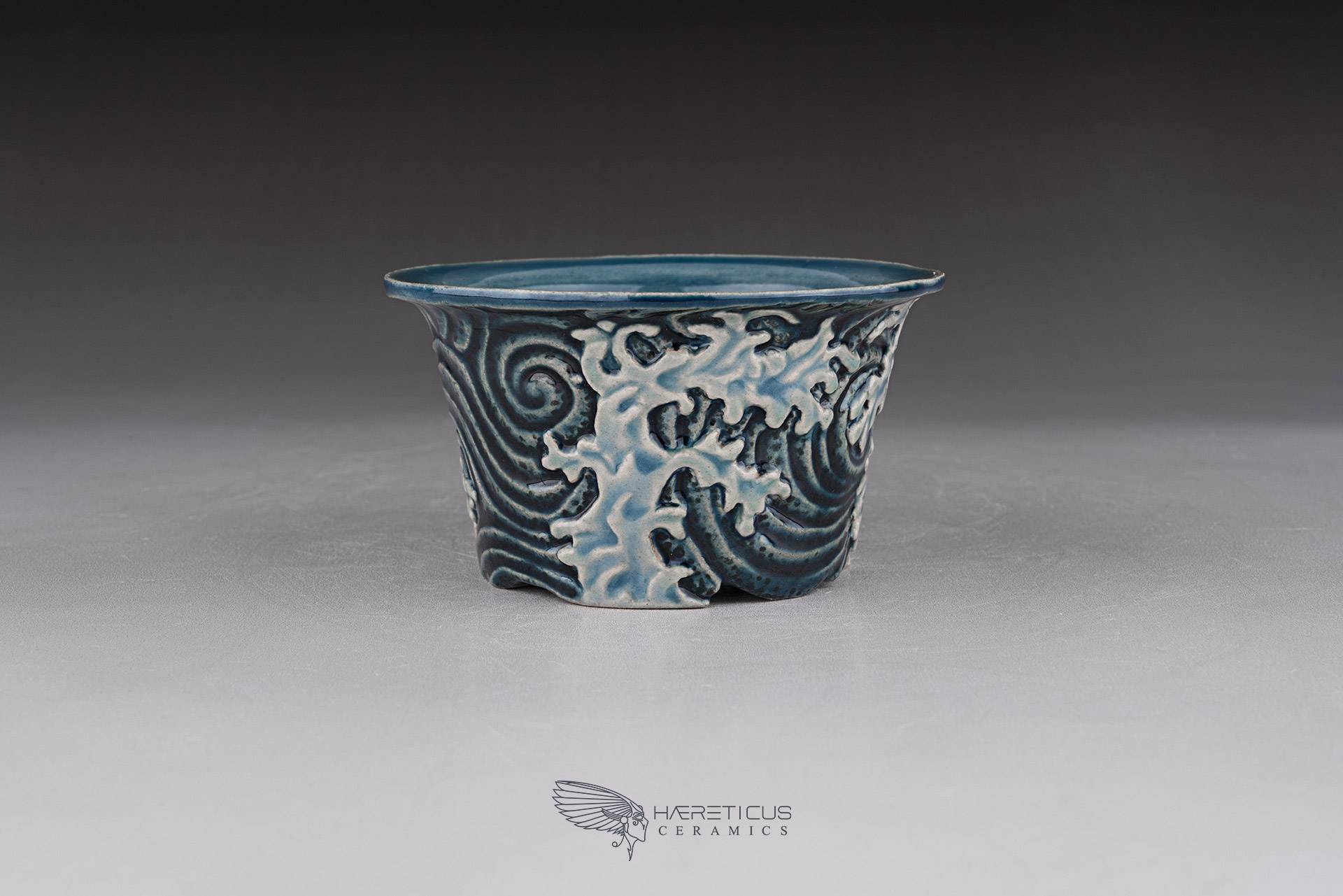 Small mame / shitakusa pot, hand-sculpted with a stormy wave motif. Each of the three waves is directed differently to better match the movement of the plant. Glazed with celadon glazes that highlight the textures and depth.